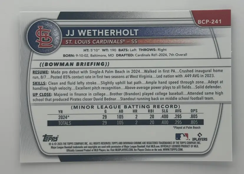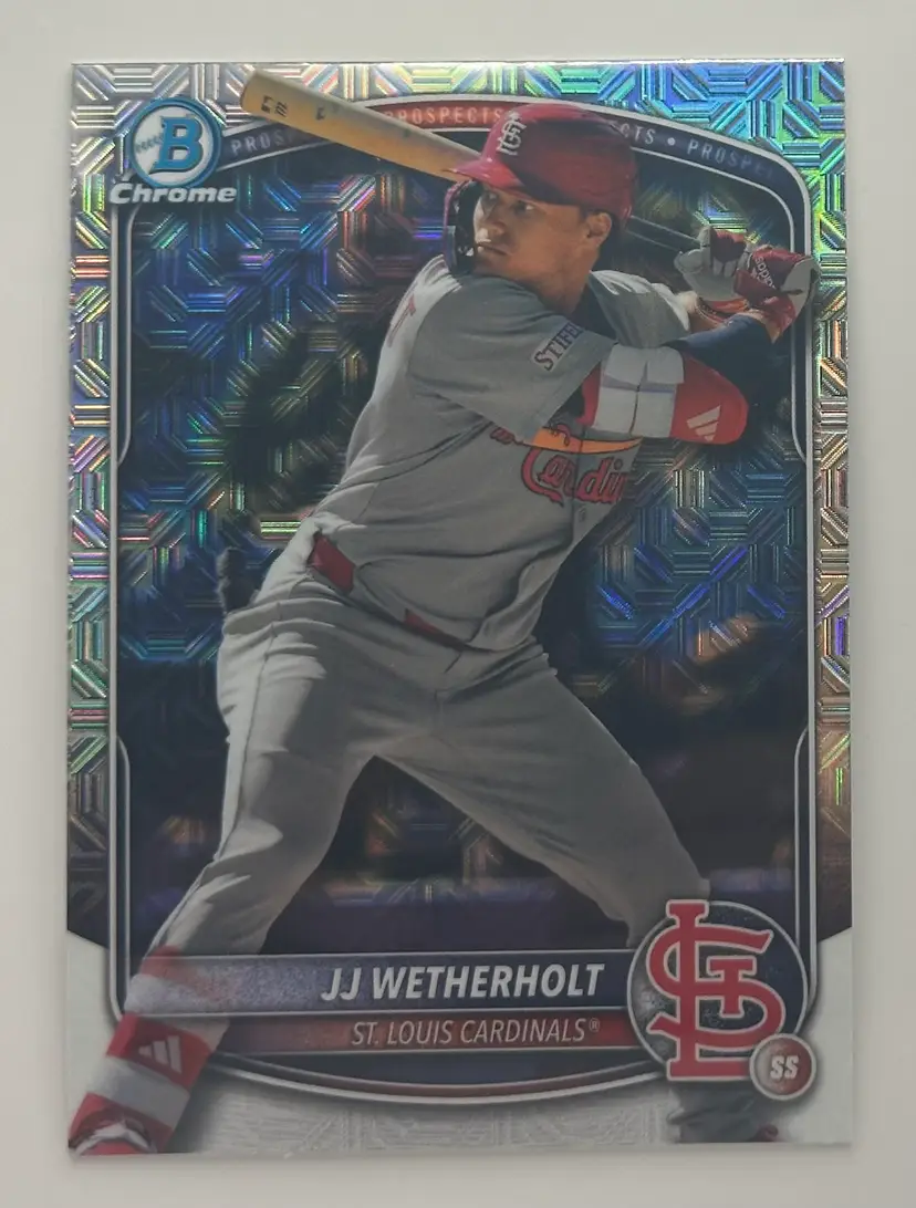 Snag this JJ Wetherholt prospect card from Bowman Chrome, showcasing his potential with the St. Louis Cardinals.
