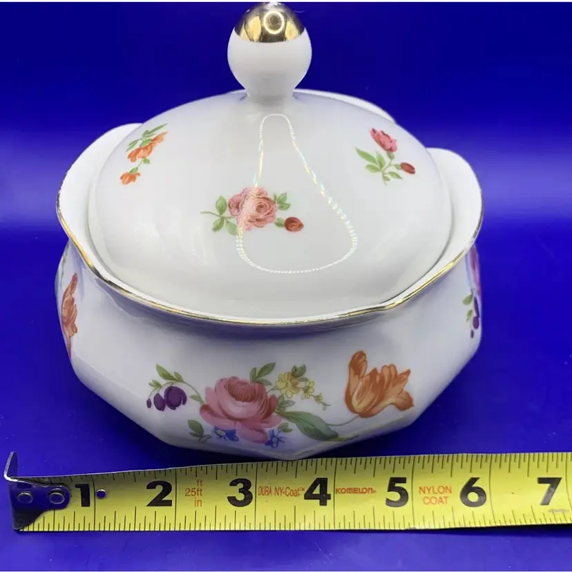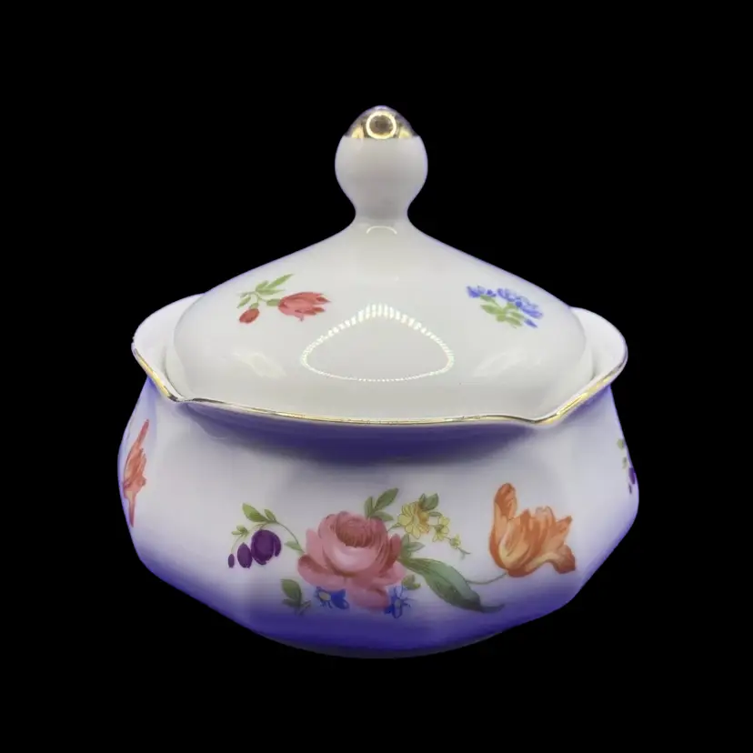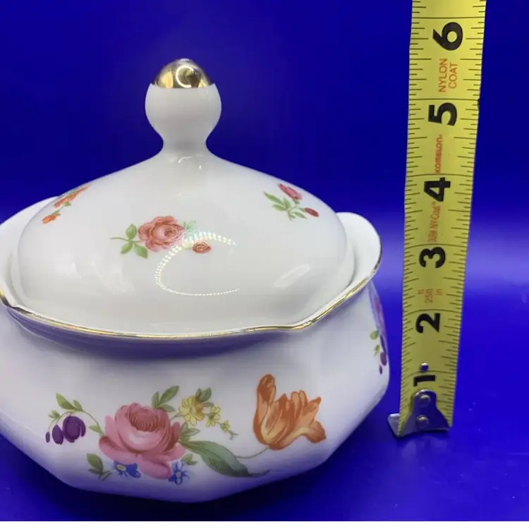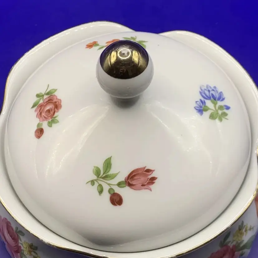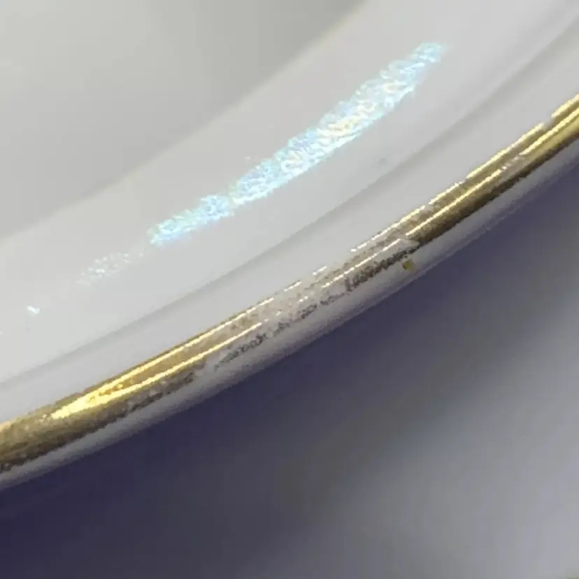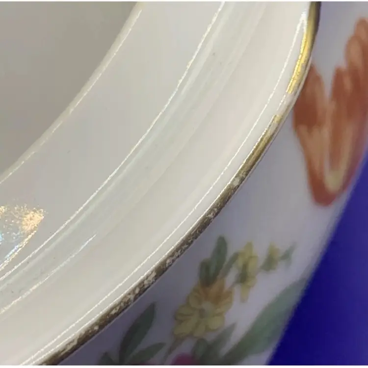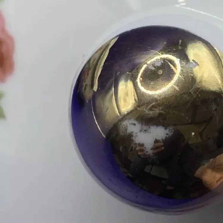 Has some minor gold loss on the rim and the gold knob. No cracks or chips. Light marks.