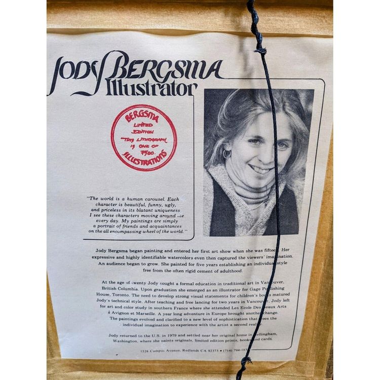 Jody Bergsma Signed and Framed Lithograph. Numbered 6343/7500, created in 1982. The delicately colored drawing features a Mom, child, bunny, and fairy under a whimsical tree. Some damage to the frame - see photos.