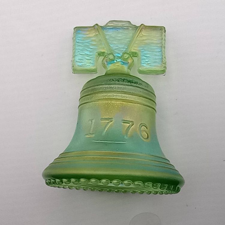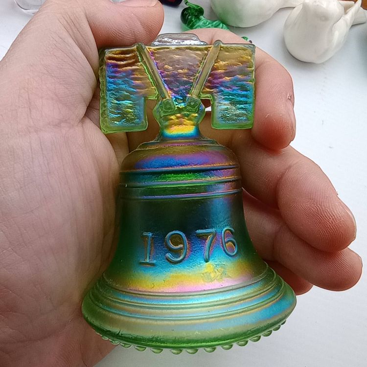 This is a beautiful Joe St. Clair bicentennial bell in green carnival glass. It has 1776 on one side and 1976 on the other. It's in excellent condition with no chips or cracks.