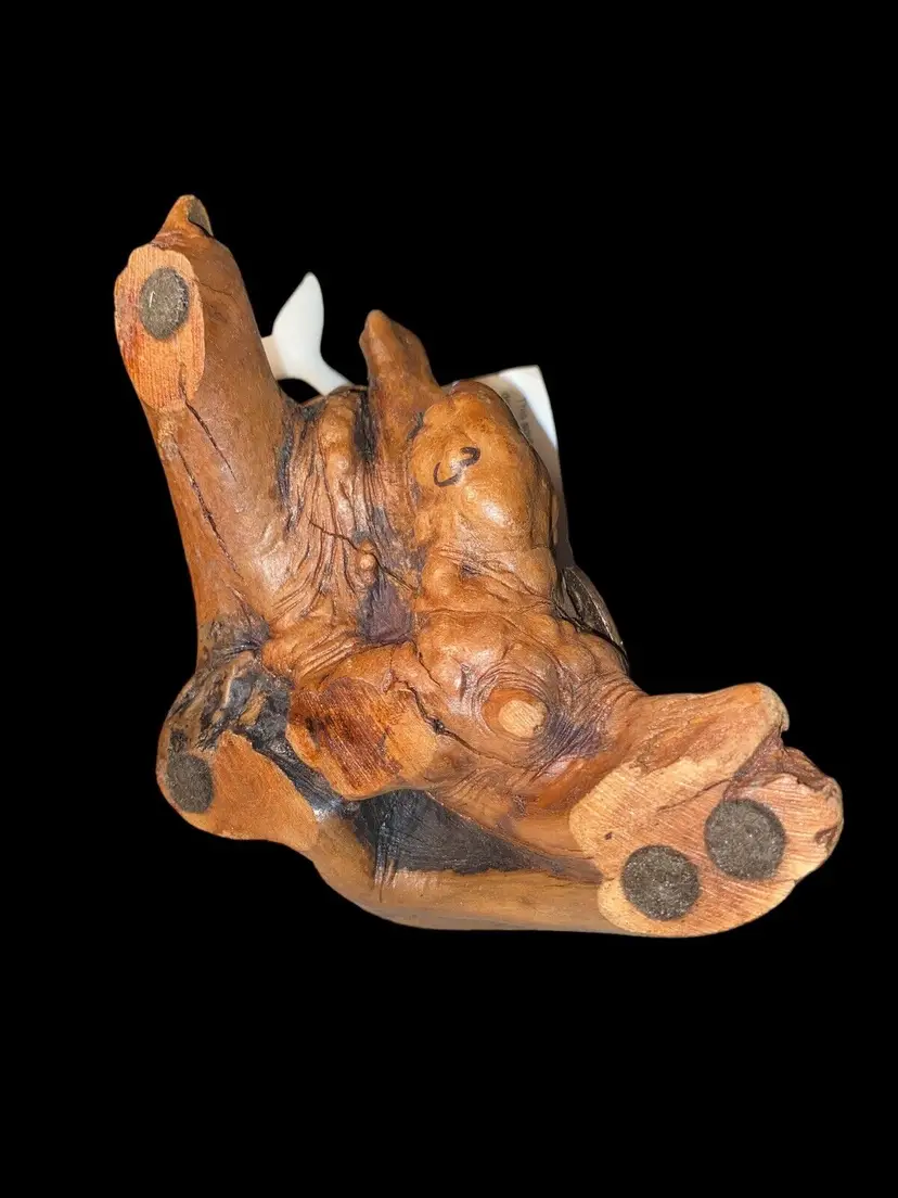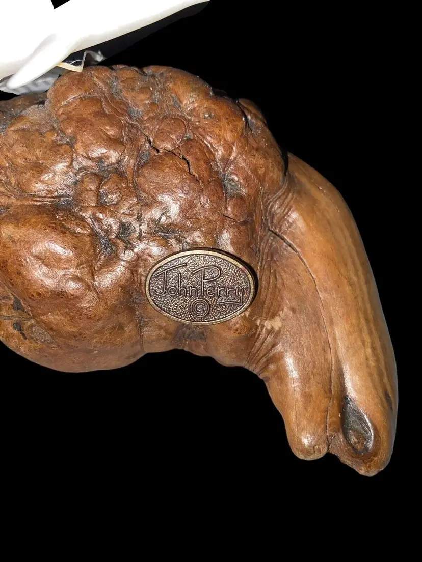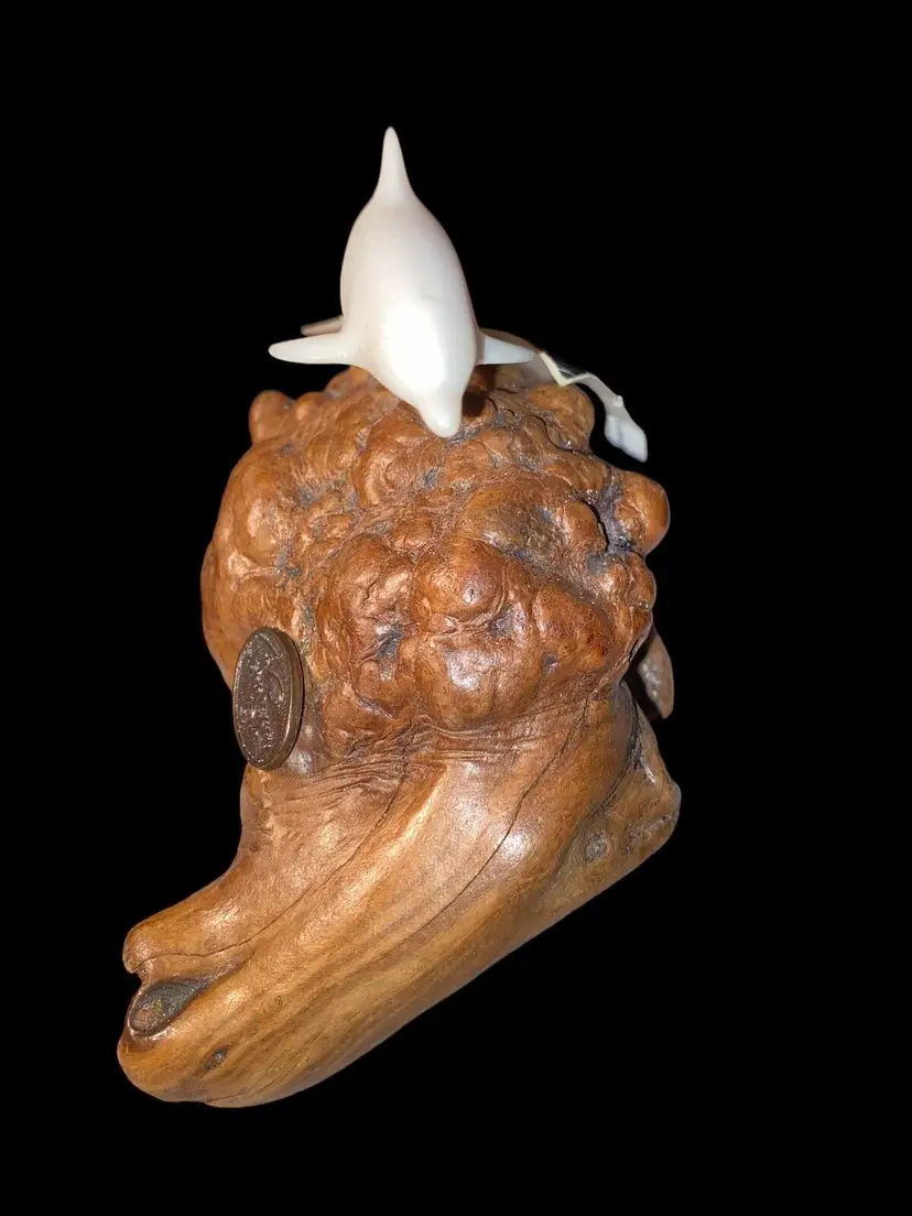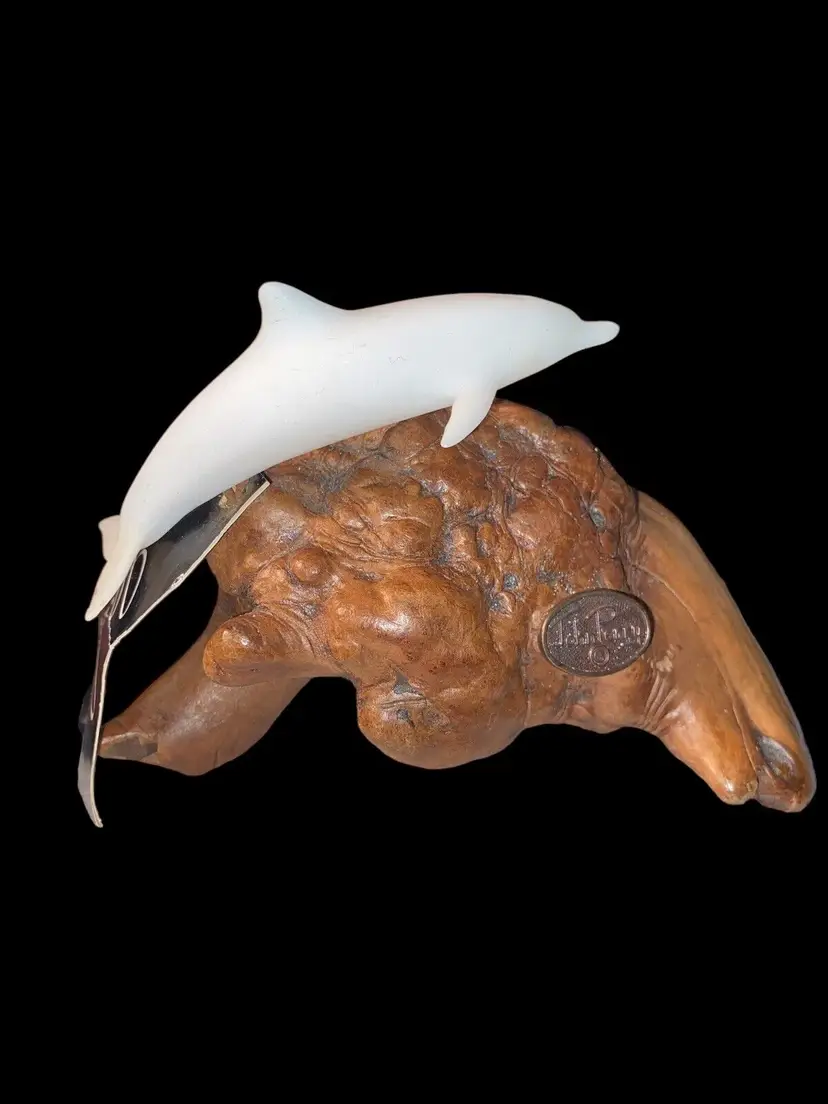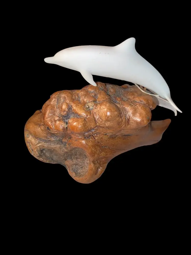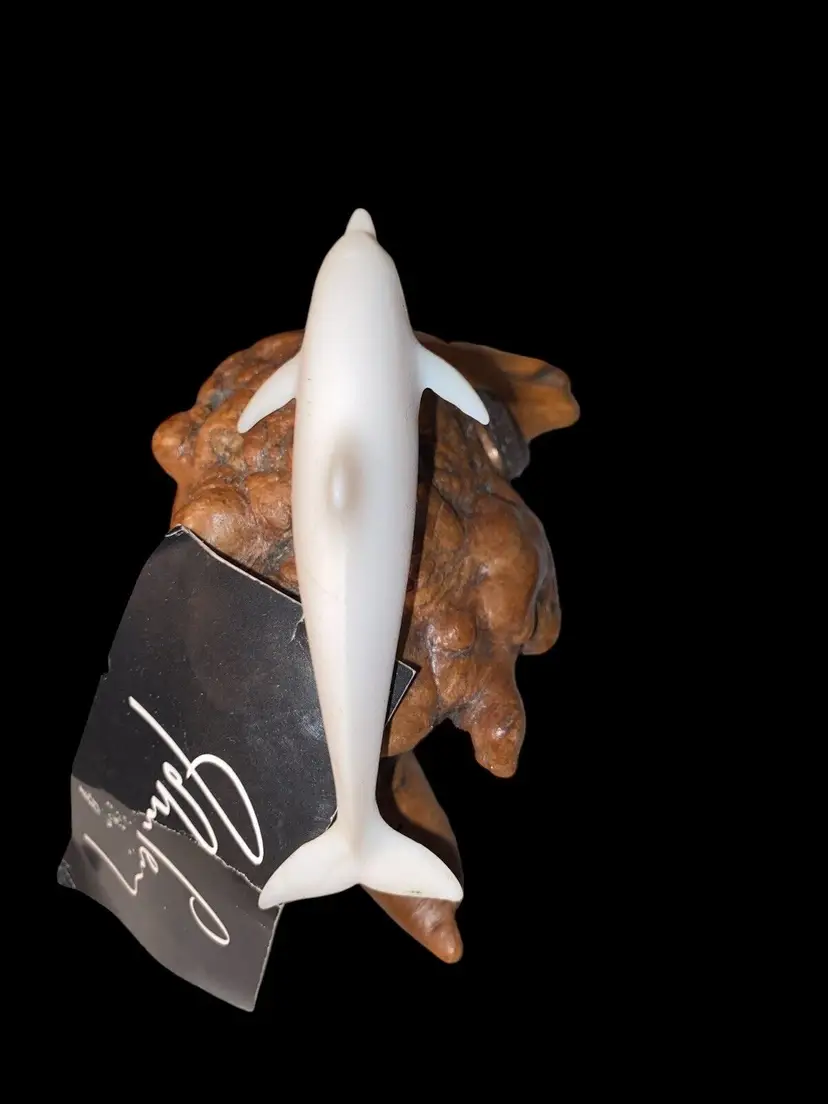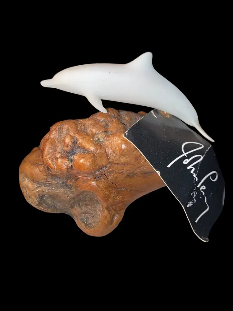 John Perry White Albino Dolphin Sculpture On Burl Wood Stand With Tag