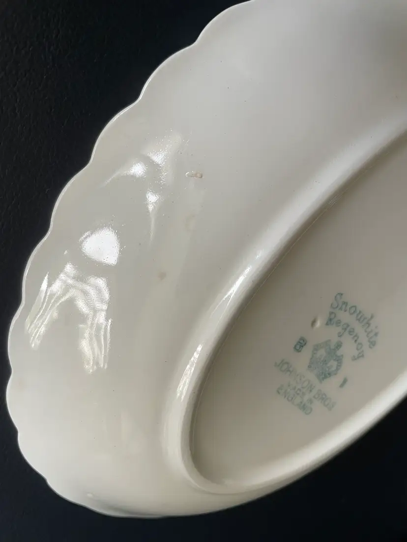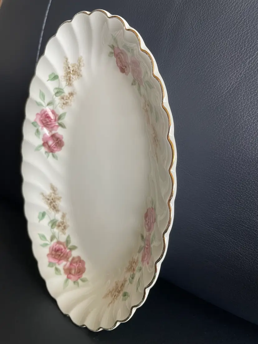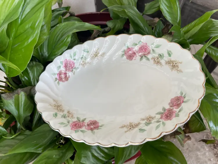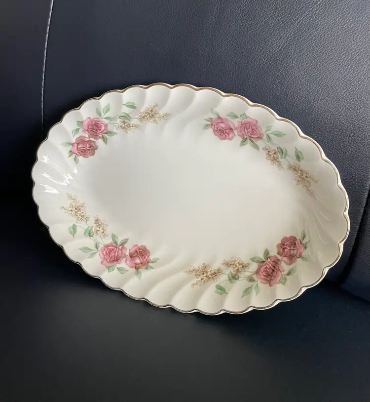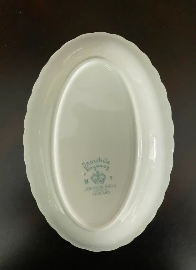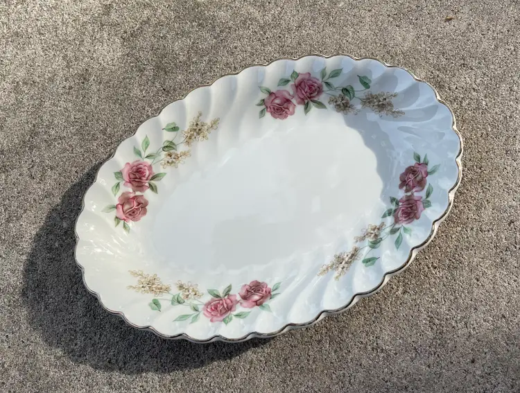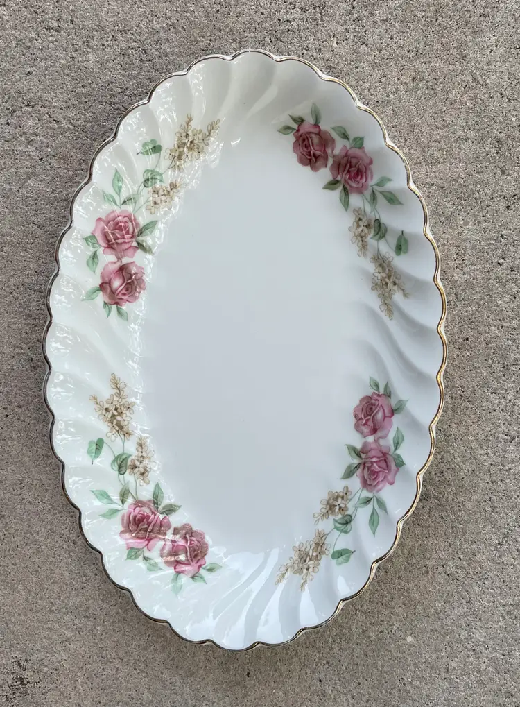 Pretty porcelain dish with a scalloped design & gold trim. Made in England by Johnson Brothers. Can be used as a small oval serving tray (like for hors d'oeuvres or bite-sized desserts) or as a trinket dish, perhaps for jewelry or hair clips. Lovely rose pattern with green leaves (Snowhite Regency/Enchantment).