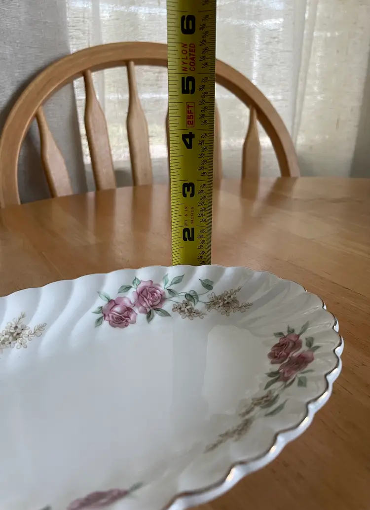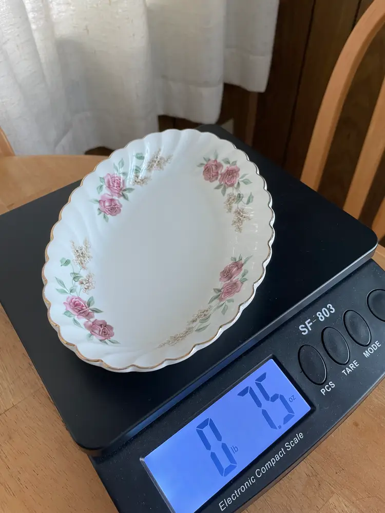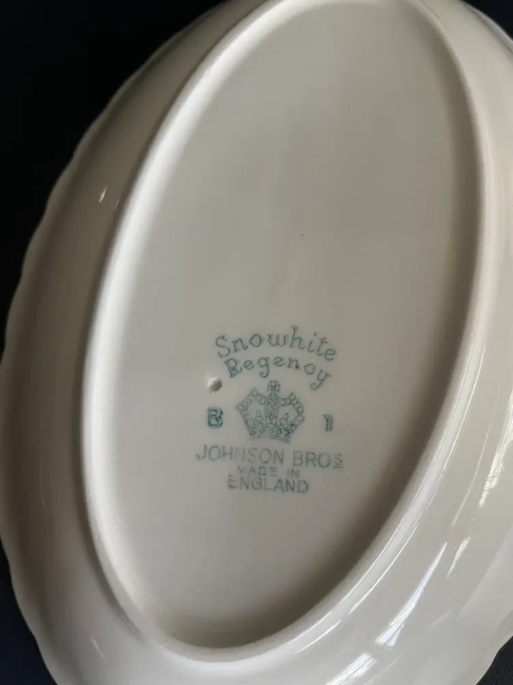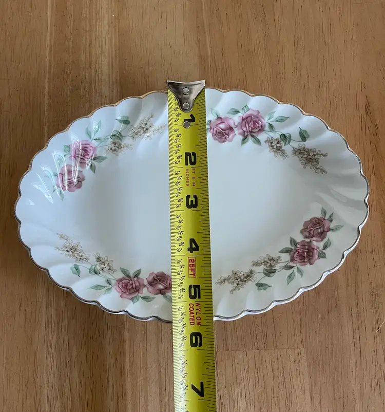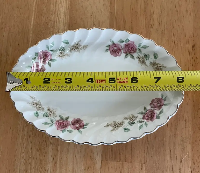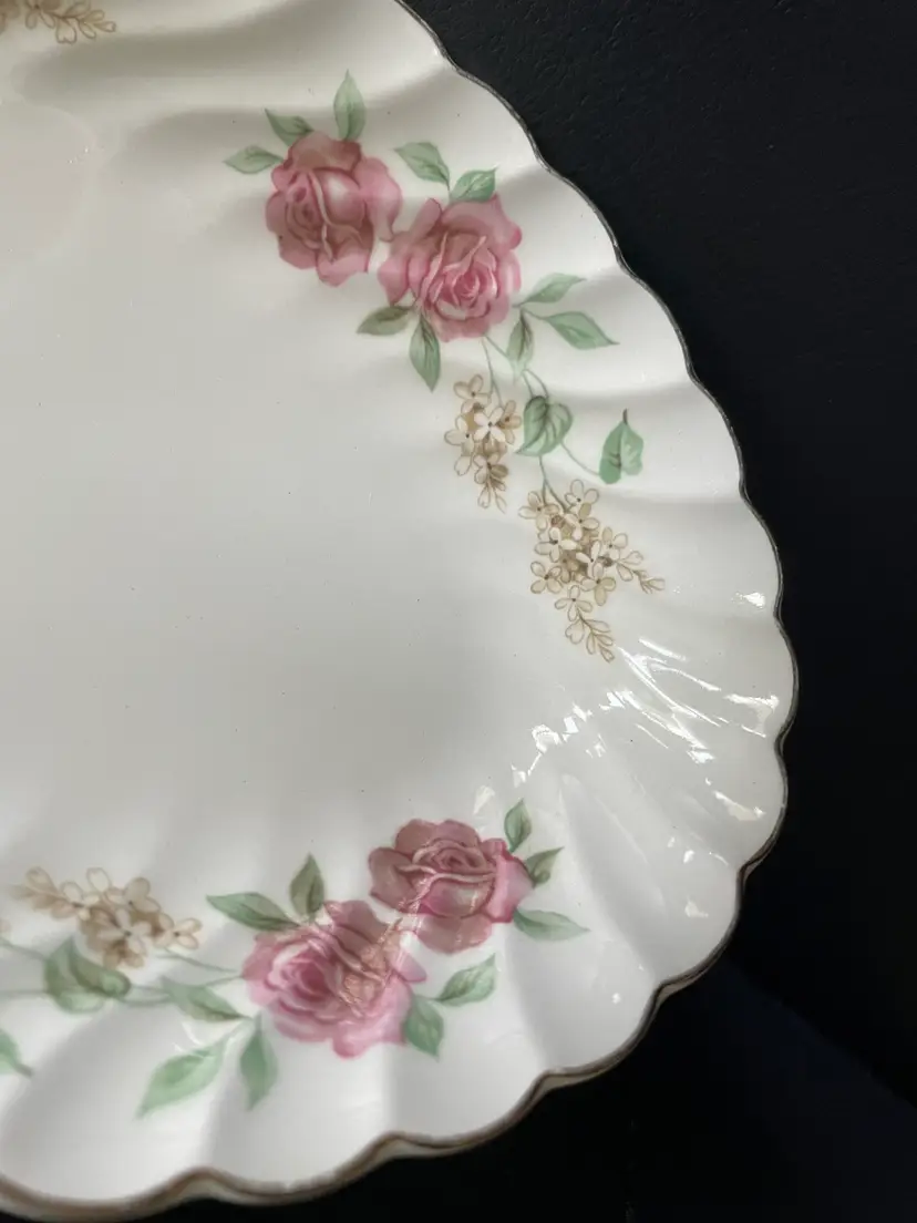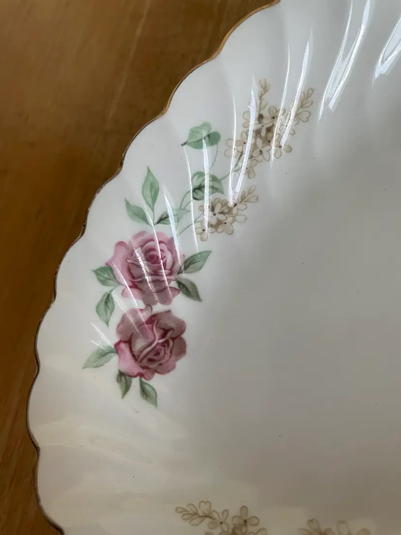 Pretty porcelain dish with a scalloped design & gold trim. Made in England by Johnson Brothers. Can be used as a small oval serving tray (like for hors d'oeuvres or bite-sized desserts) or as a trinket dish, perhaps for jewelry or hair clips. Lovely rose pattern with green leaves (Snowhite Regency/Enchantment).