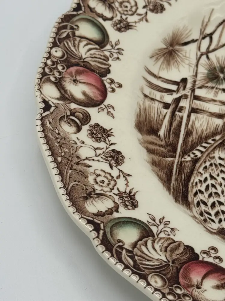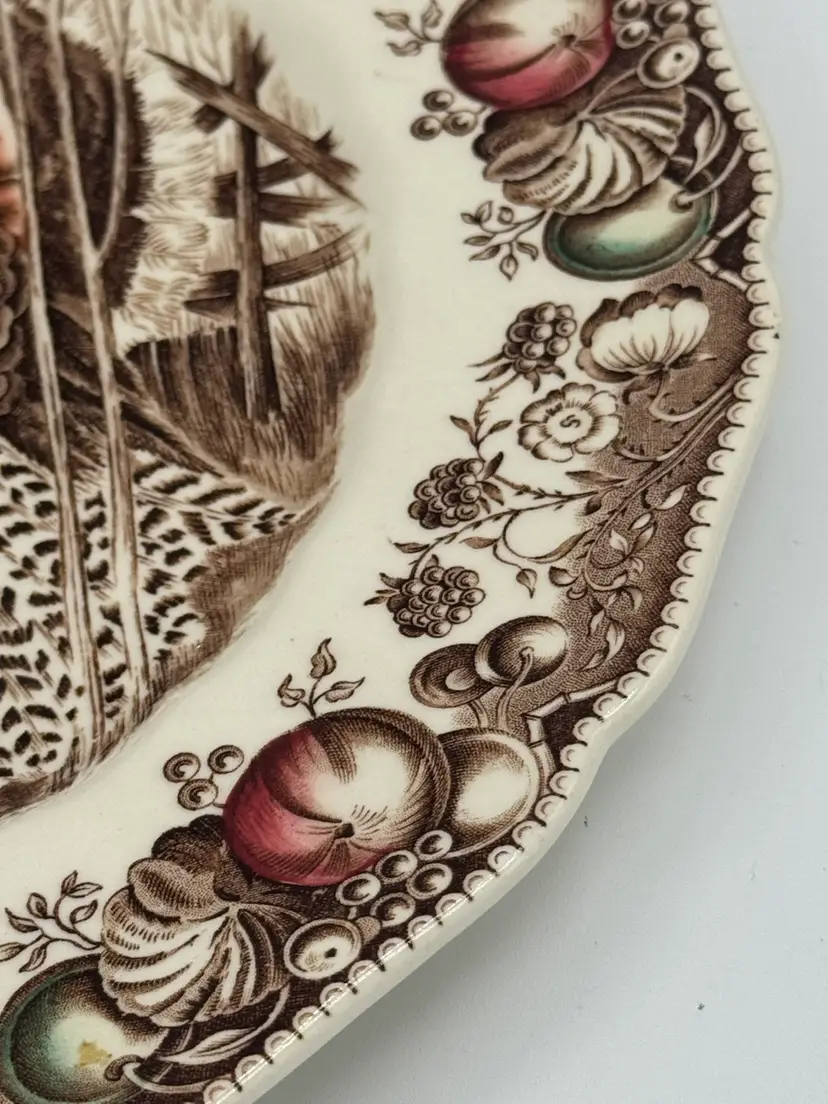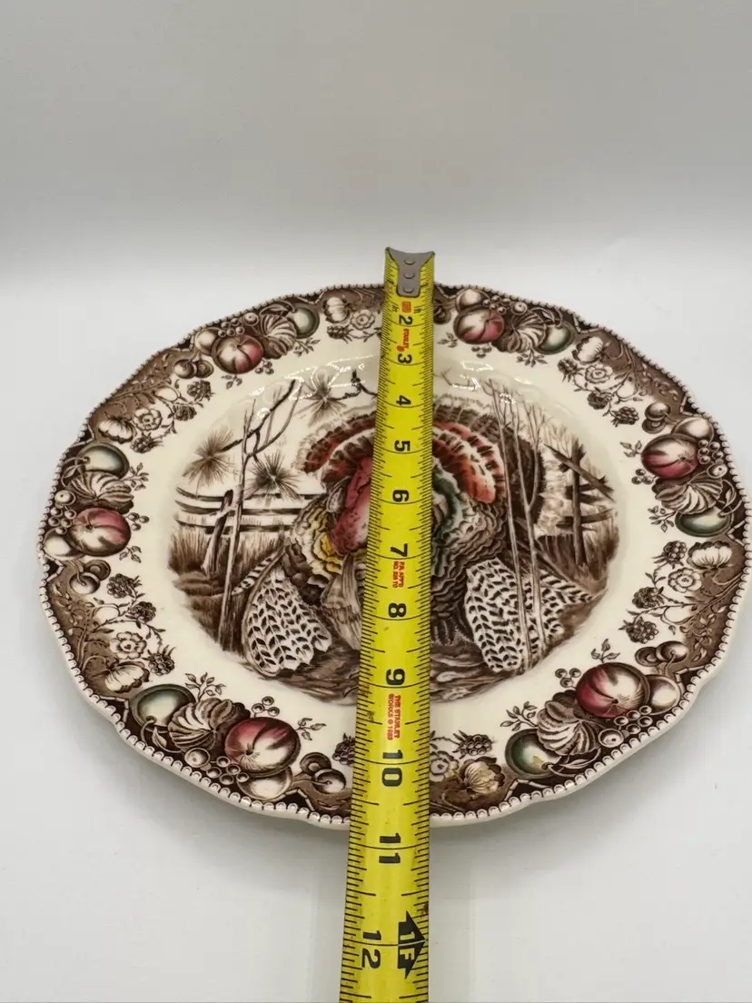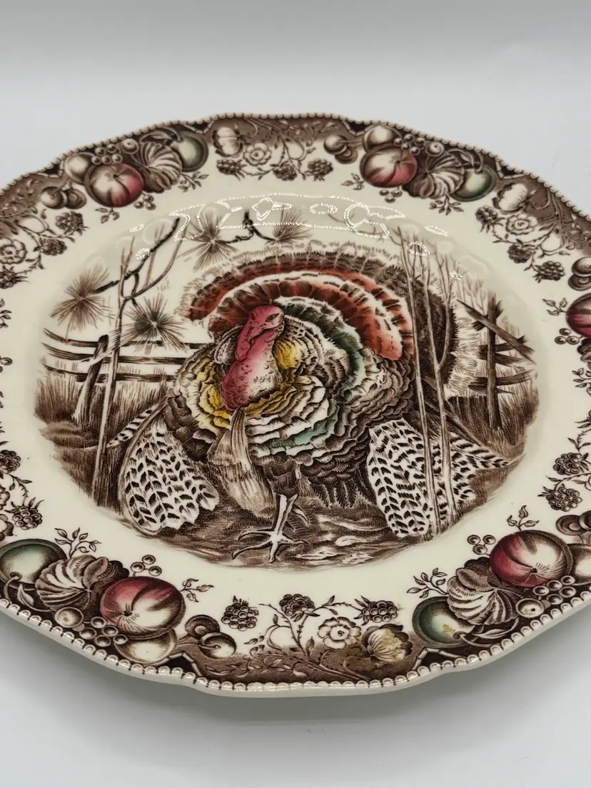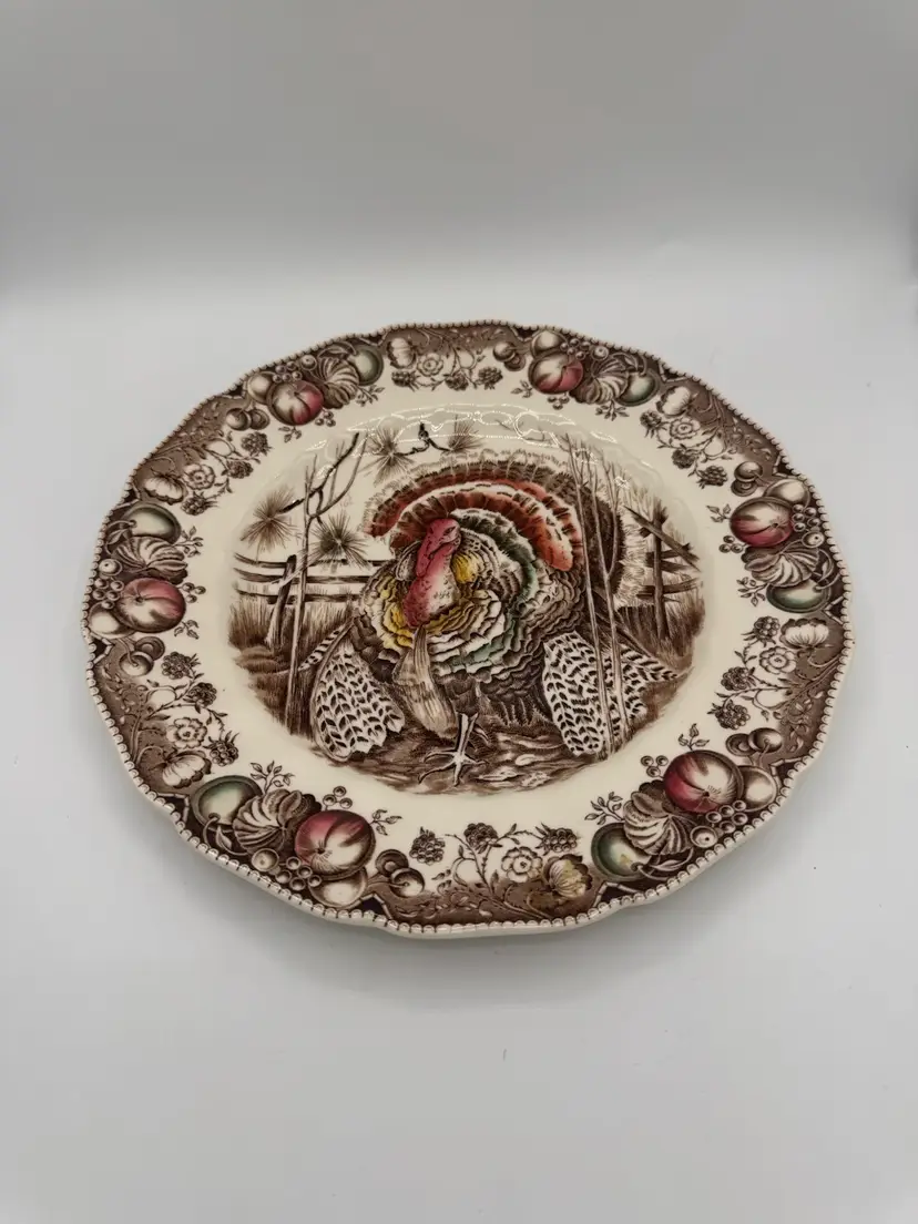 This is a gorgeous Johnson Bros Thanksgiving transferware plate that measures 10 1/2”. It is in excellent condition and appears to be unused.