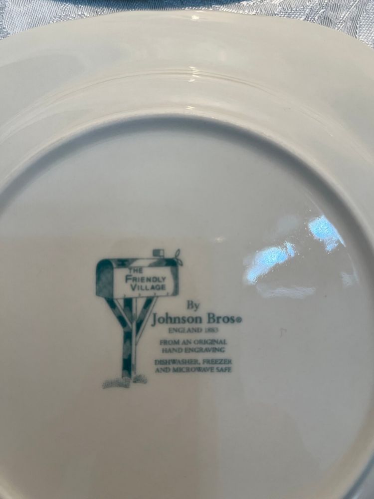 The "Friendly Village" series was produced by Johnson Brothers, an English pottery company founded in 1883. This pattern is highly recognizable for its idyllic depictions of rural American scenes.