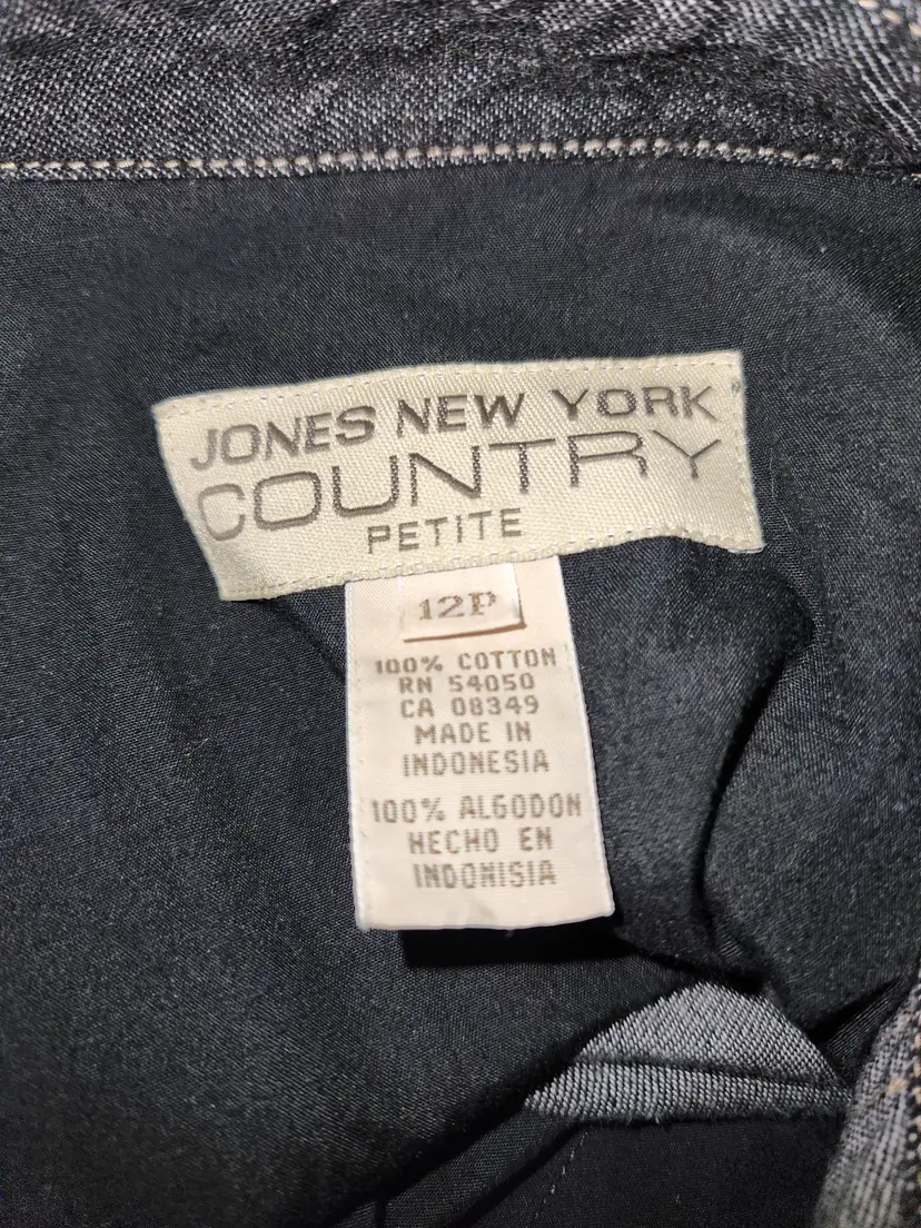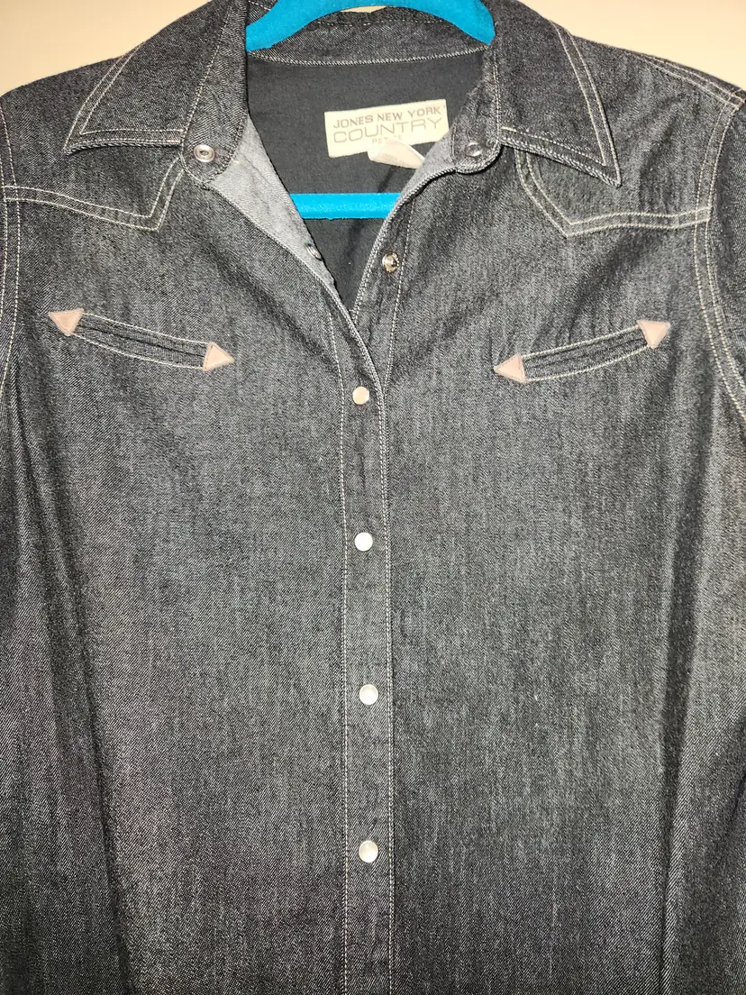 Jones New York Country Black Denim Western Style Button Down Shirt Size 12P Snap closures, long sleeves Snaps are mother of pearl 100% Cotton Measurements Armpit to armpit is 19 inches Shoulder to hem is approximately 24 inches In excellent condition