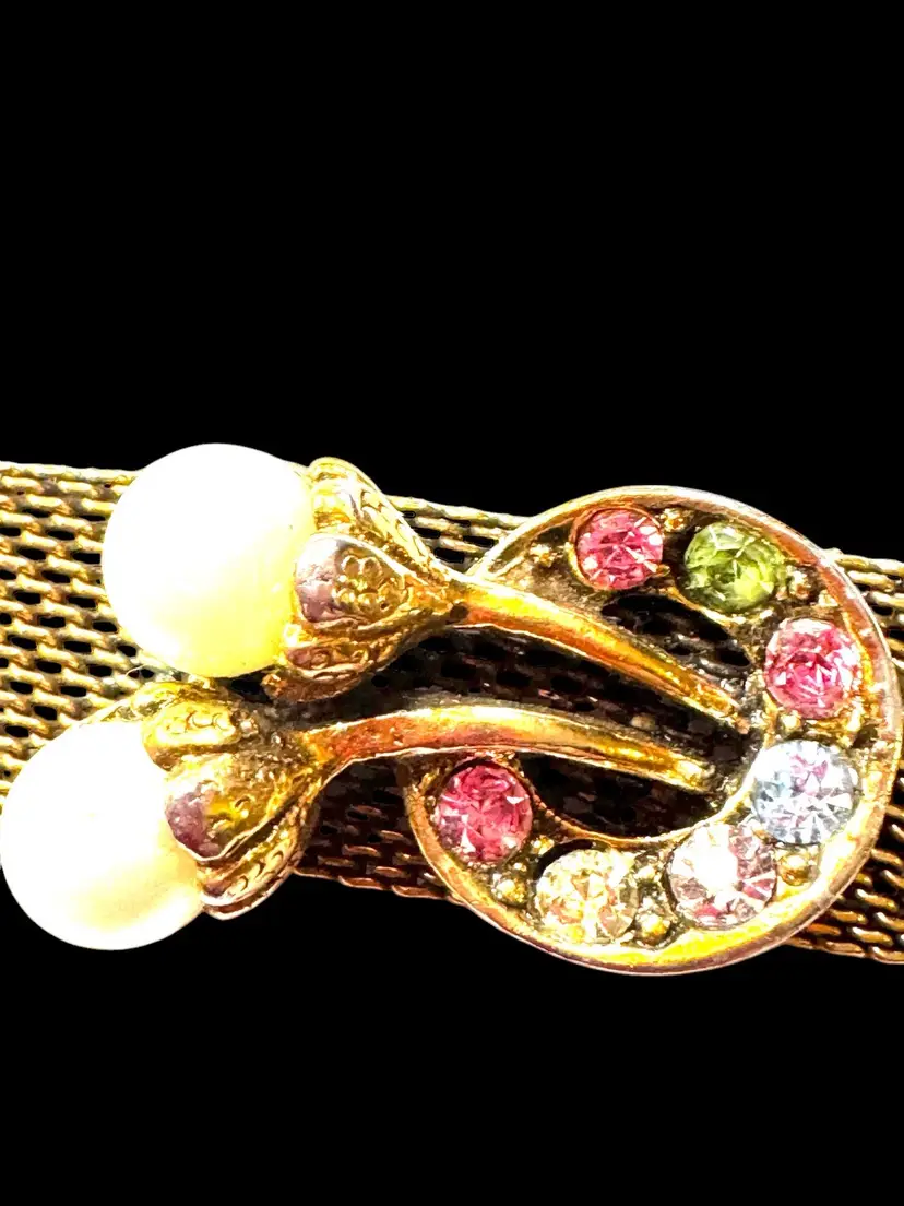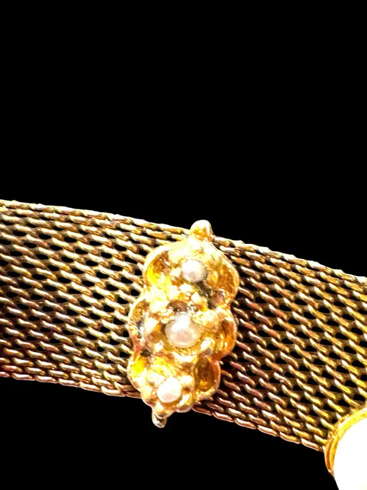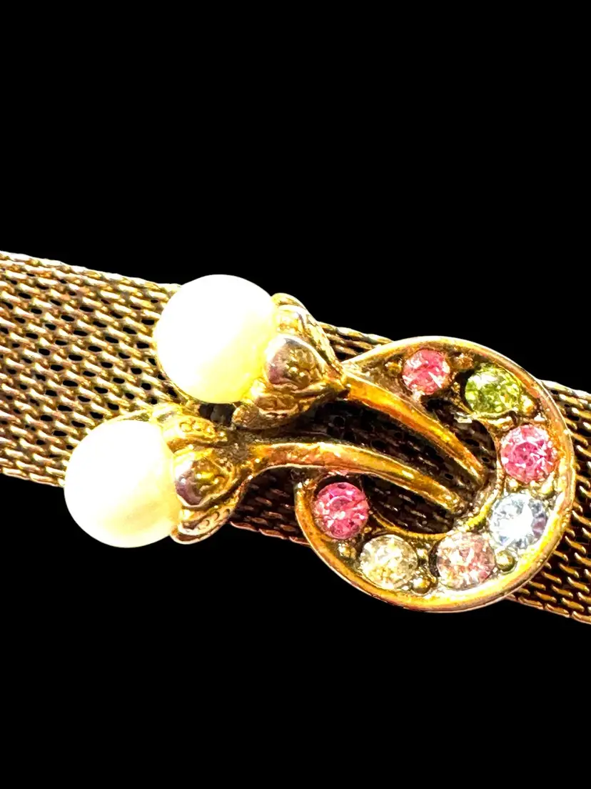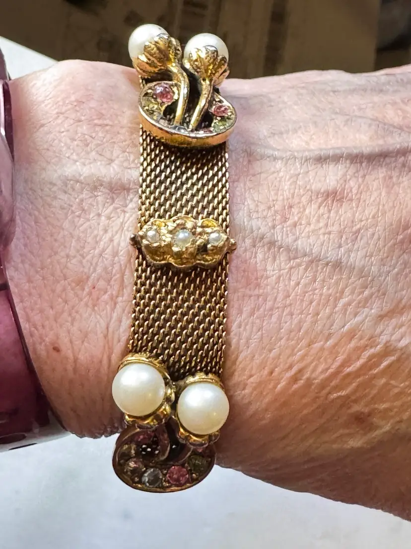 Unsigned 7.25” Judy Lee mesh bracelet in excellent condition with all its stones and faux pearls. It needs a little cleaning but all the stones and faux pearls look good❣️❣️