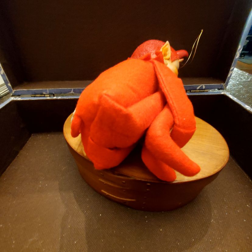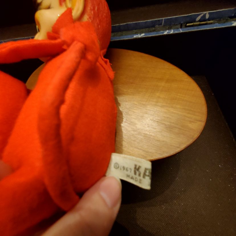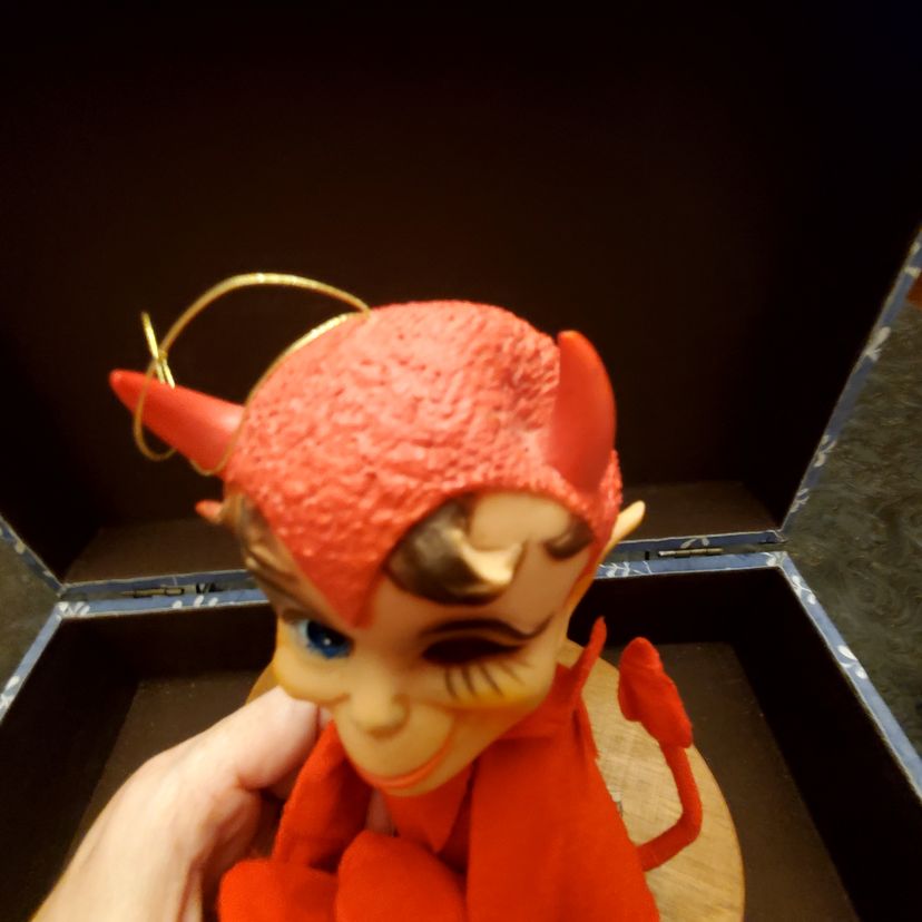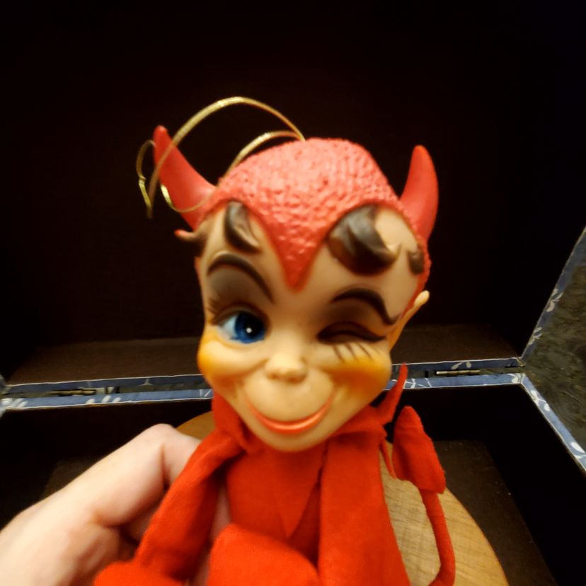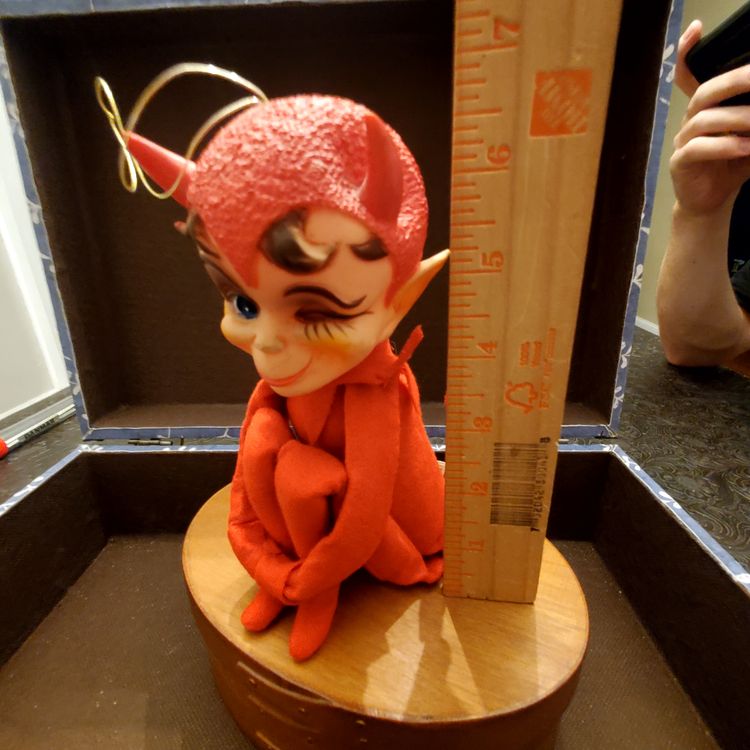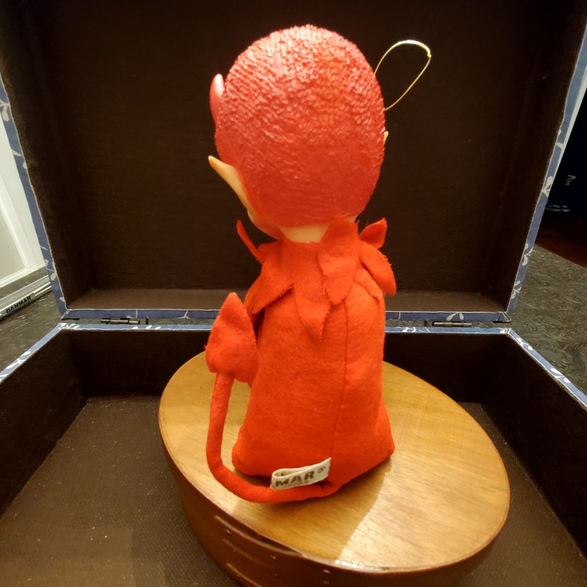 This is a cute vintage kamar devil knee hugger. Approximate measurements in photos. Fabric is in great condition. There is a small dent in the head near one of his horns. Still has original tag.