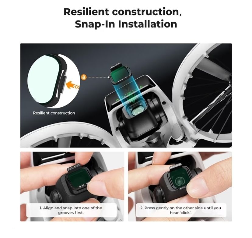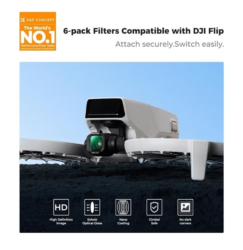 6Pack Filters Kit: This latest 6-Pack ND & PL filter kit from K&F Concept is compatible with DJI Flip 4K UHD Camera, which includes UV, PL, ND8, ND16, ND32, and ND64 filters, featuring multi-coated, push-in fit, easy to install and disassembly, easy to install and disassembly, it can be widely used in daily life and vlogging creation, help take the video game up a notch.