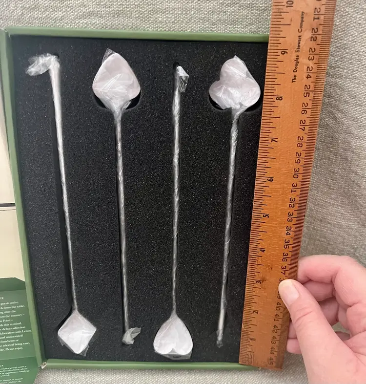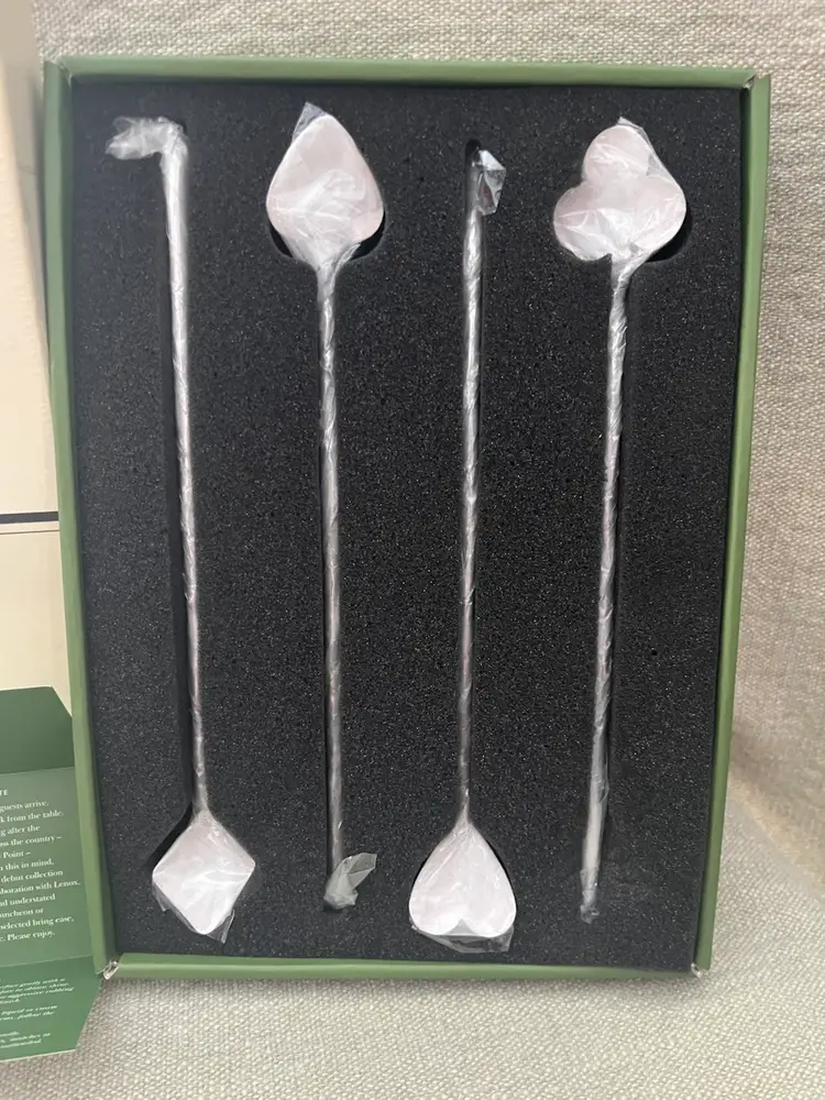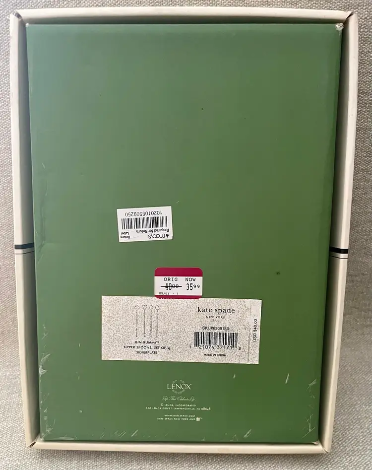 The Limited Run Collaboration of Lenox and Kate Spade, New York Gin Rummy silverplated sipper spoon was part of a collection released around 2007-2008, often found in sets with matching barware or as standalone novelty items celebrating classic playful, whimsical home, vintage-inspired designs like playing cards and games. A great addition for the family game room or Bar; special gatherings ~ New Year’s Eve, Super Bowl, 4th of July Independence Day, Etc. While unused ~ identified as such due to it being pre-owned and dings to external box. #6308183. Originally purchased at Macy’s, these were from a nearby estate.