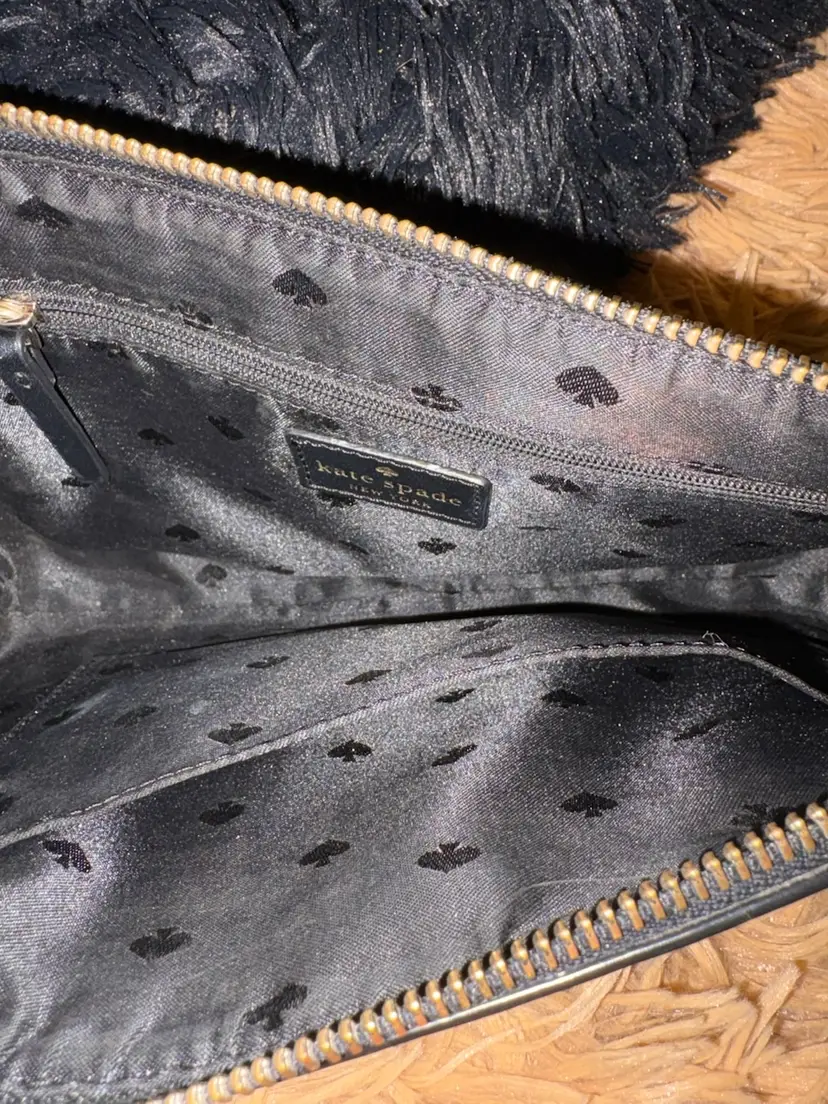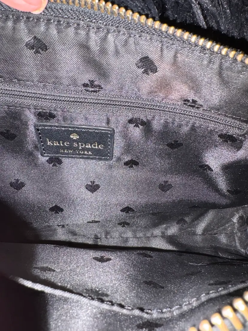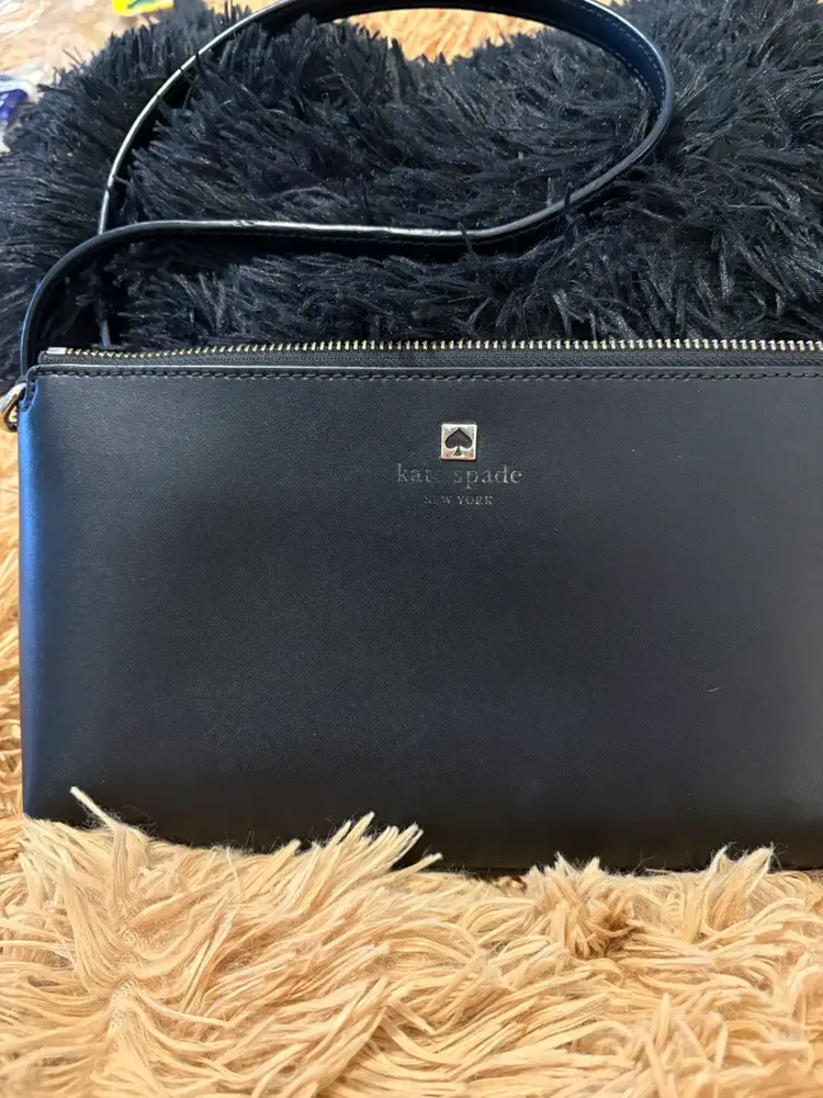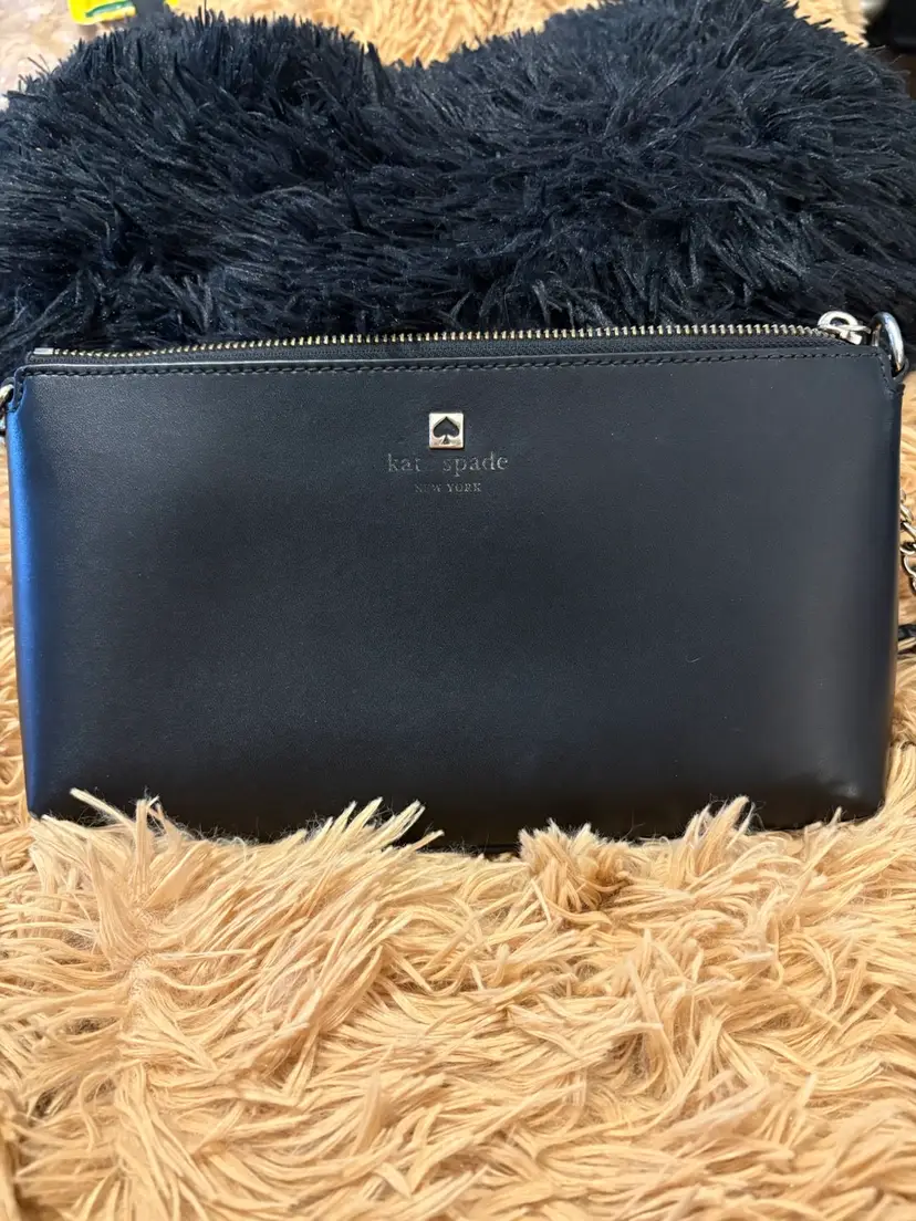 Kate Spade Sawyer Street Declan crossbody bag in black leather. This specific style features smooth leather, silver-tone hardware, a top zip closure, and a combination leather and chain adjustable crossbody strap.