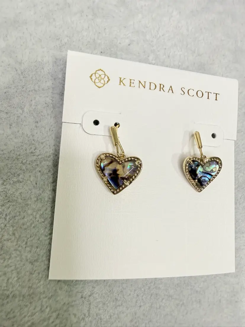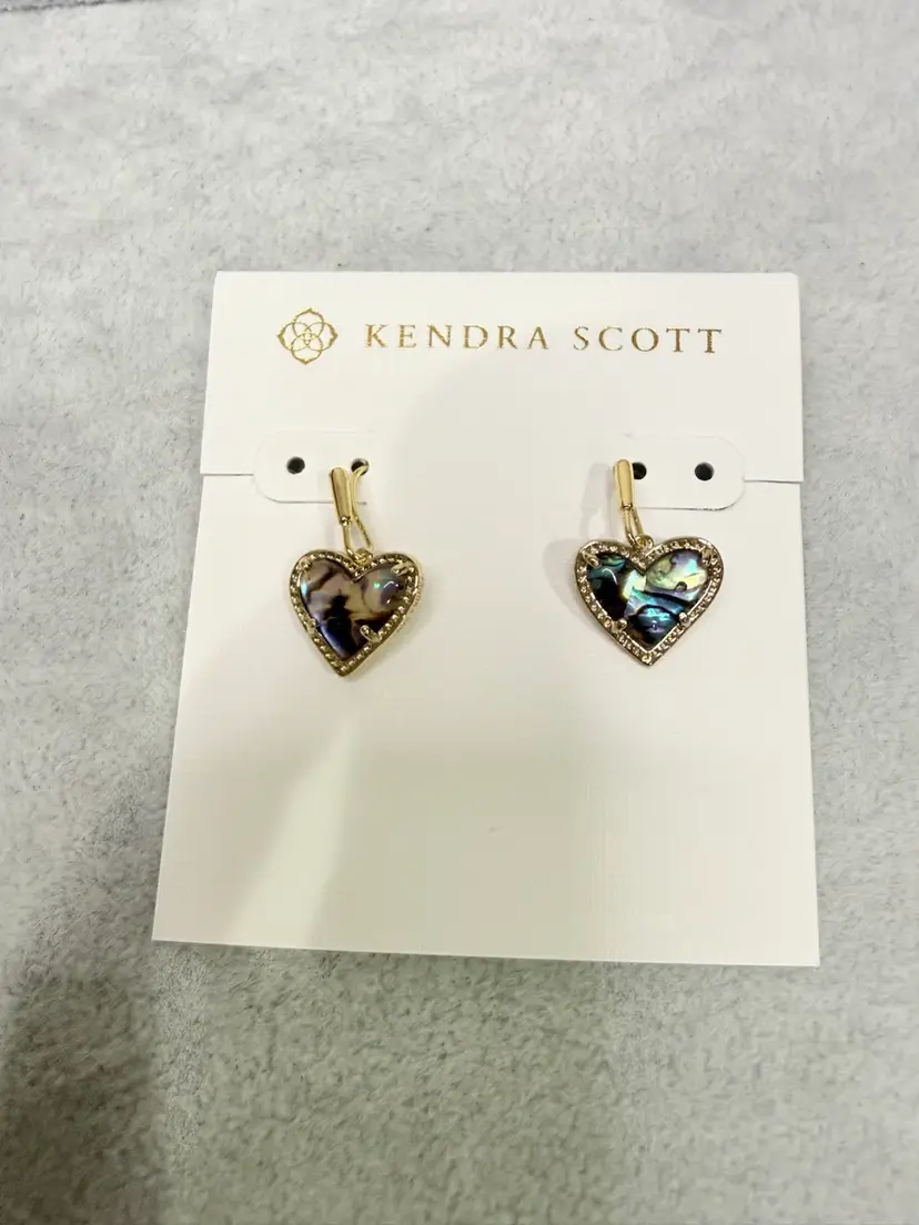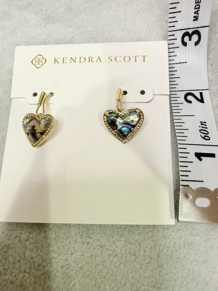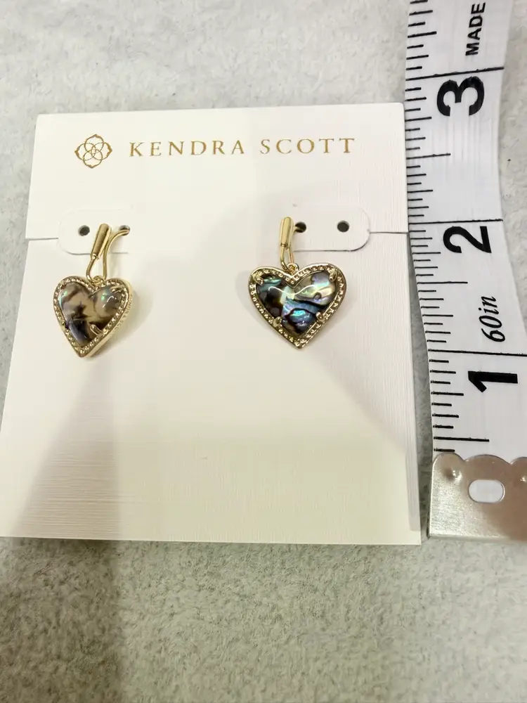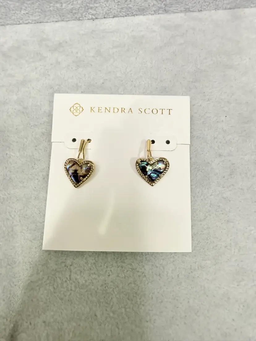 Keywords: Kendra Scott, earrings, abalone shell, heart-shaped, gold-tone, elegant, sophisticated, jewelry, accessory, new with tags, versatile, iridescent, special occasion, casual, evening event.