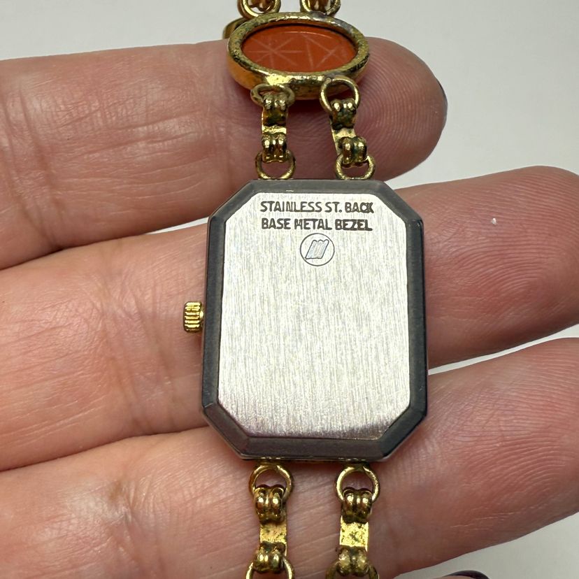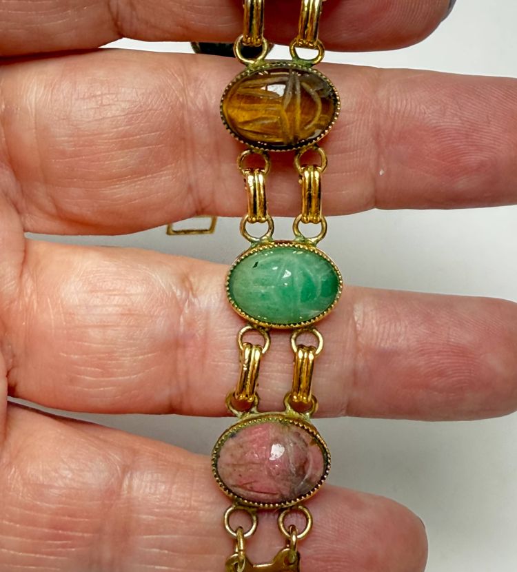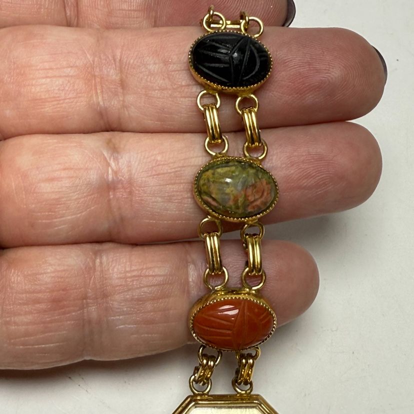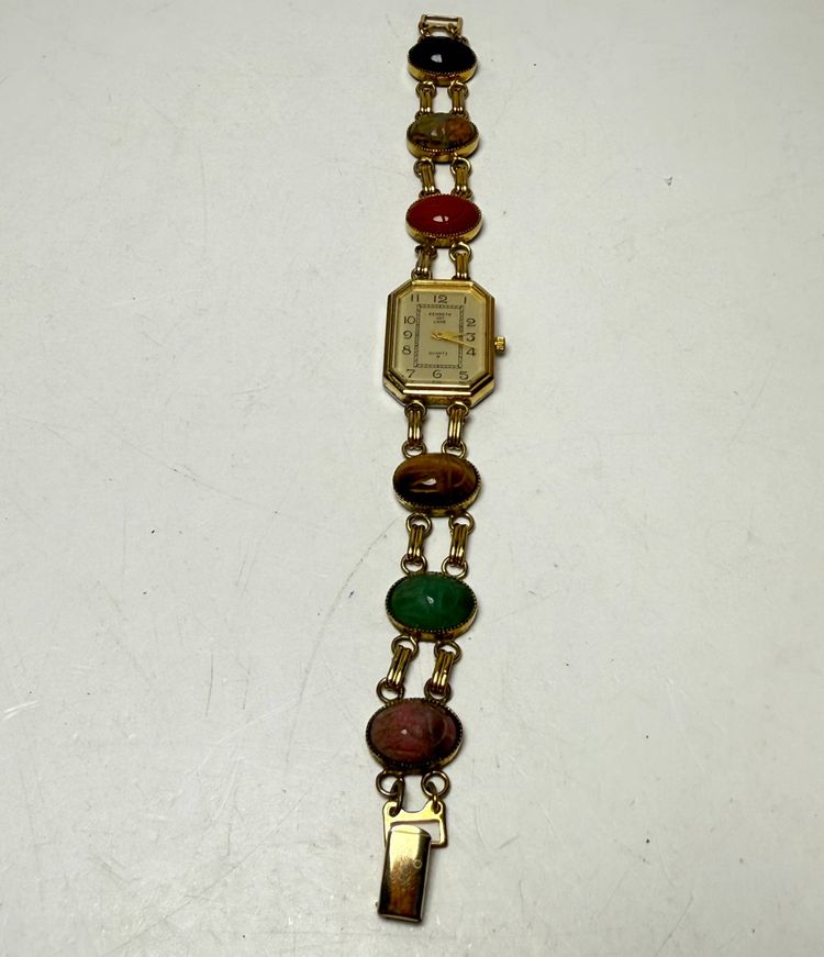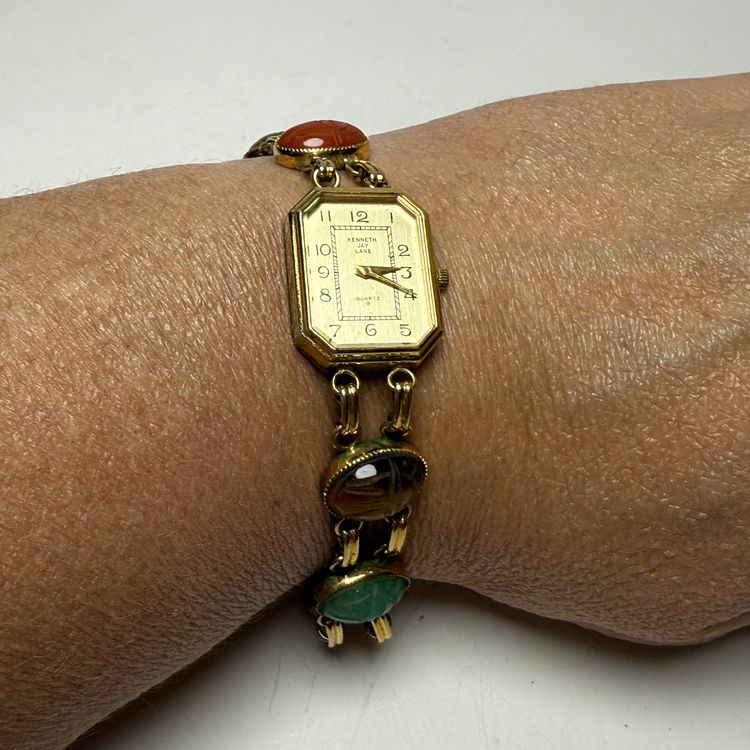 Kenneth Jay Lane 7.5" Women's Egyptian Scarab Gemstones Quartz Watch Gold Tone READ. PLEASE READ: Watch is currently not working even with a new battery. Could be worn as jewelry or you could possibly have repaired.