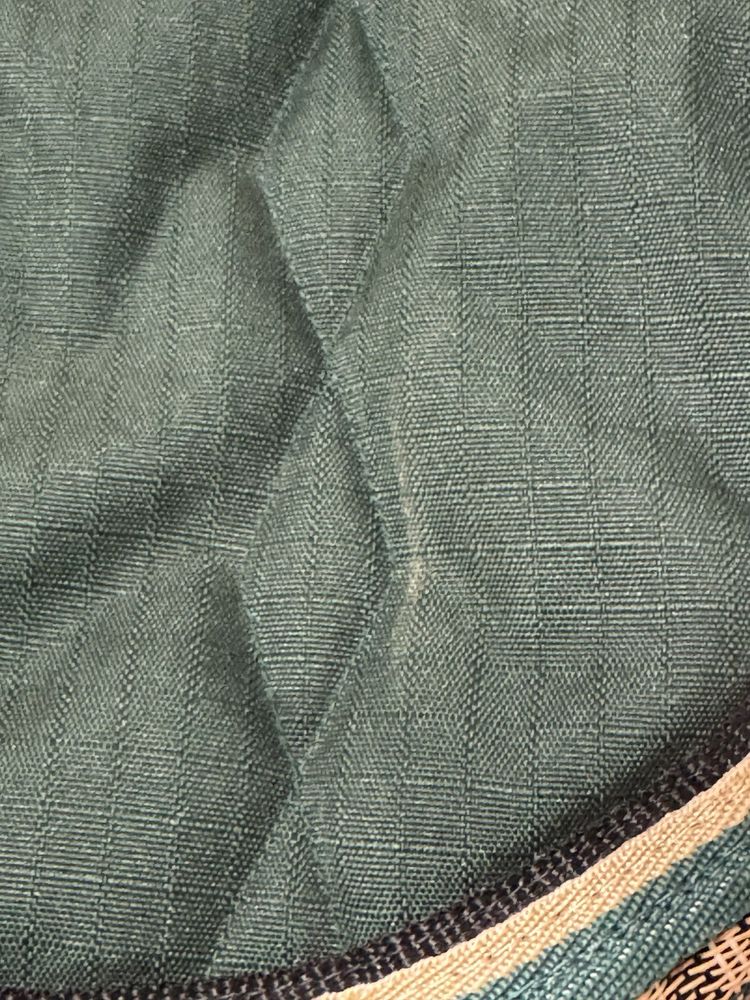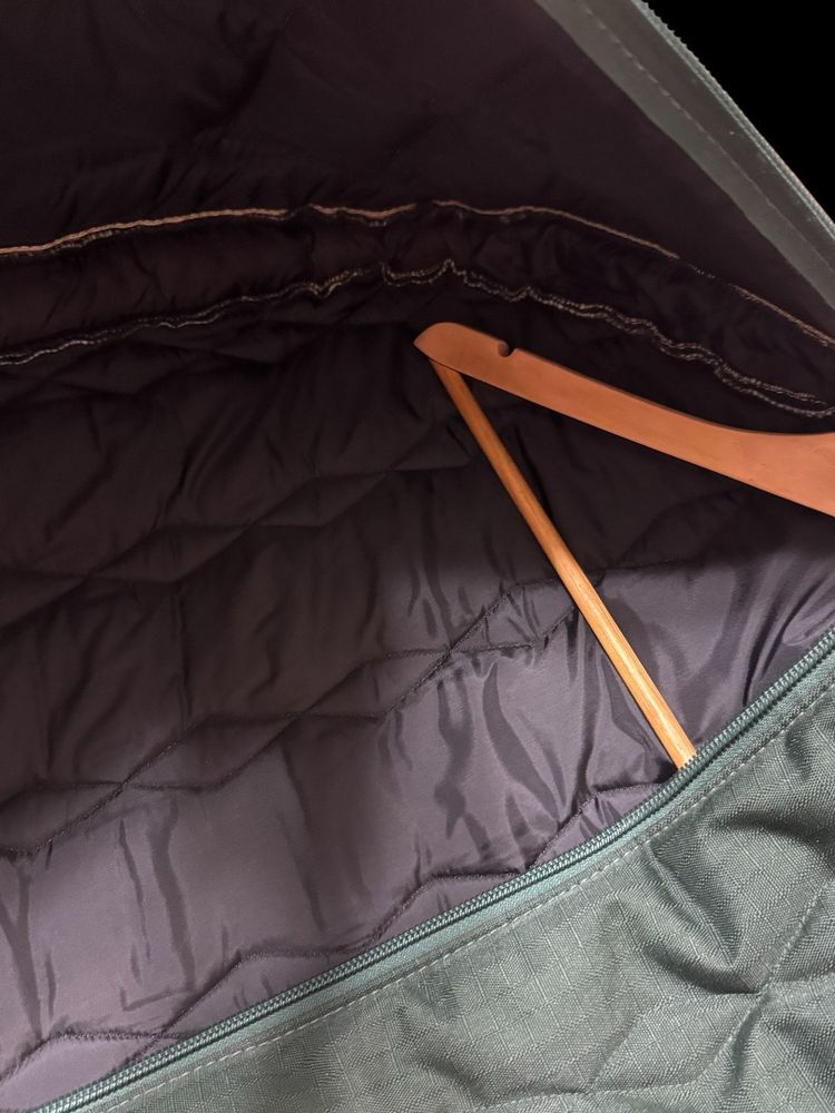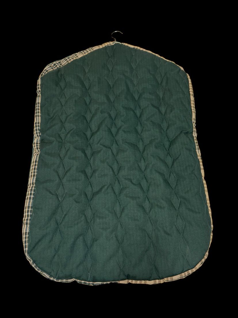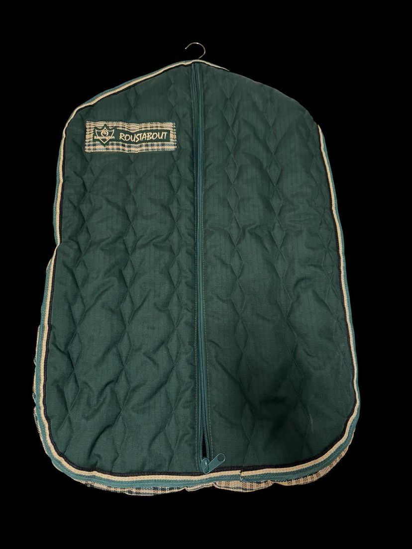 Forest green heavy duty quilted/padded garment bag with front zipper, perfect for protecting outfits used in horse racing and other equestrian events. Note there is a slight discoloration mark on the bottom of the back of the bag. See last picture for detail.