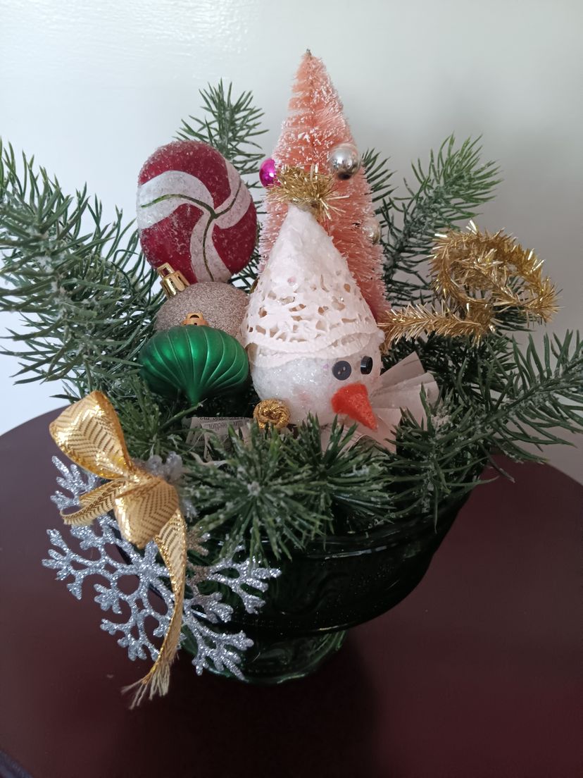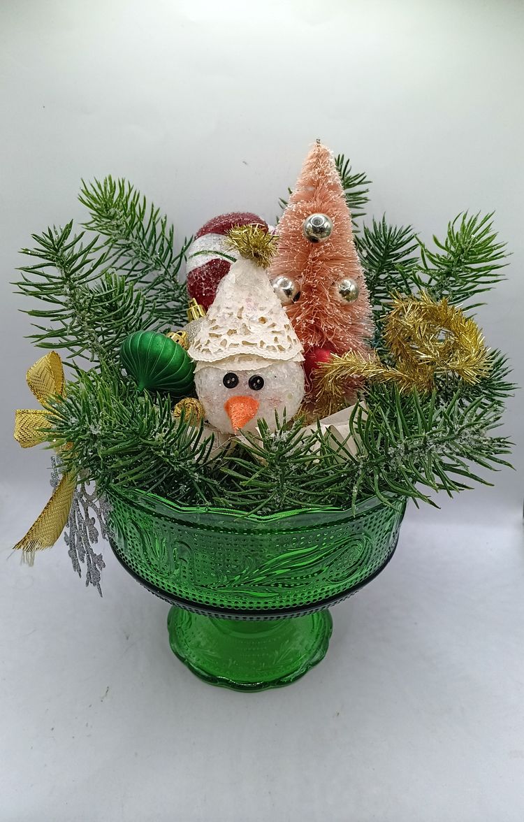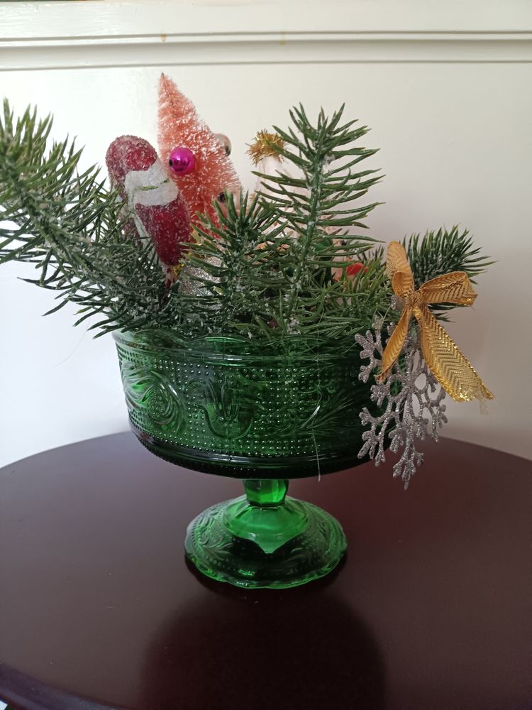 This is a Christmas centerpiece in a EO Brody footed green glass dish.