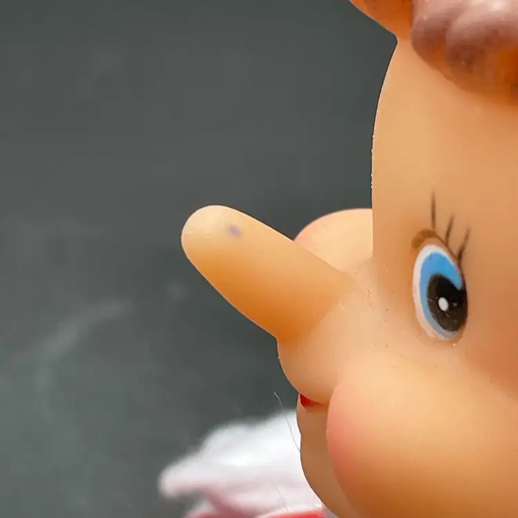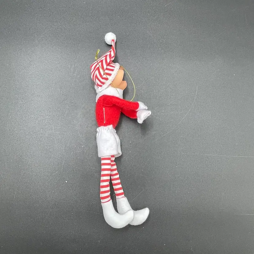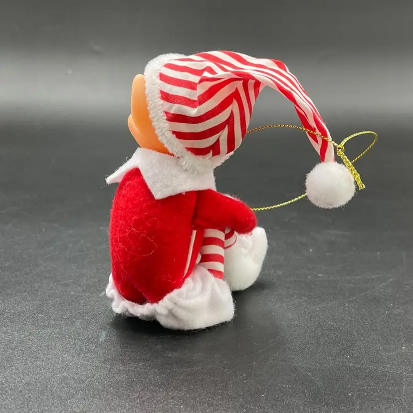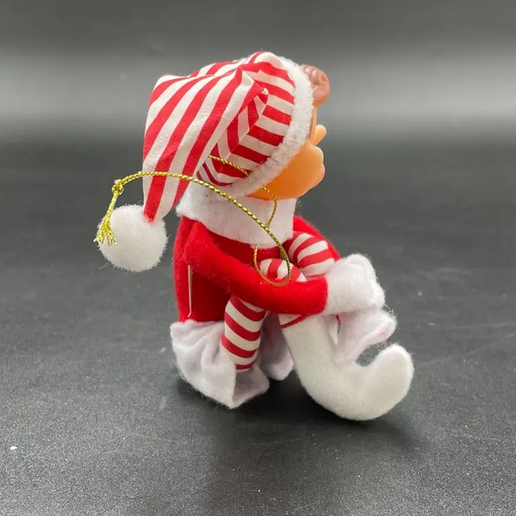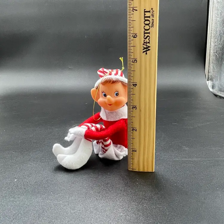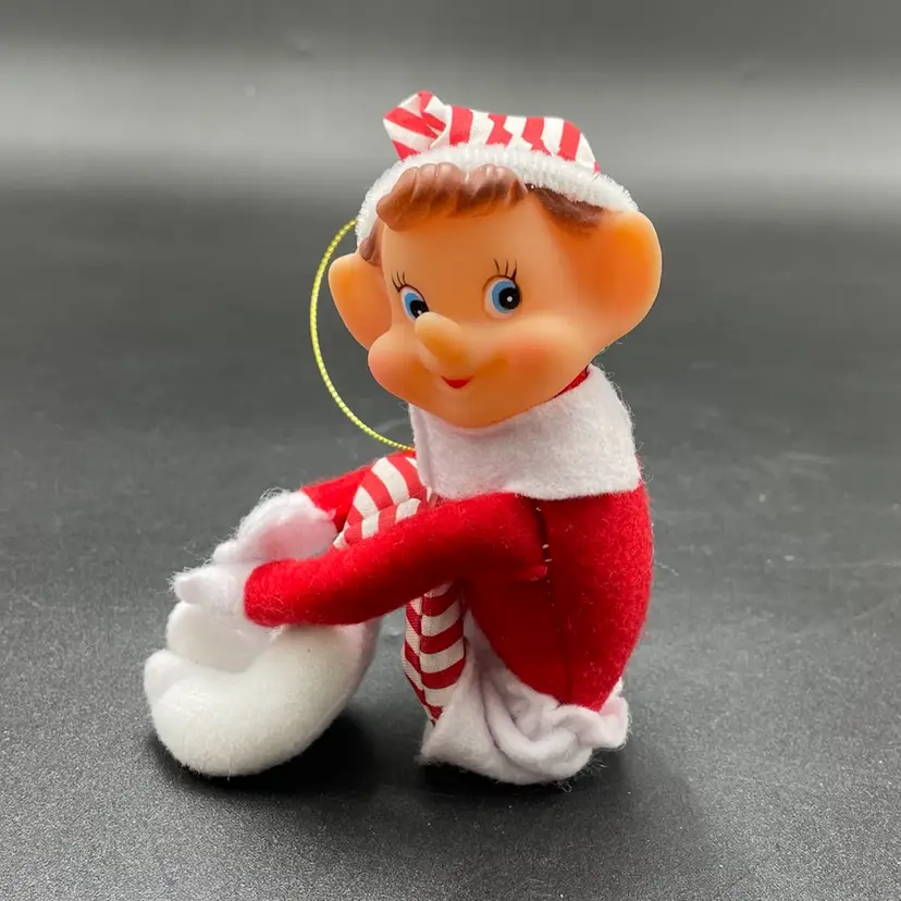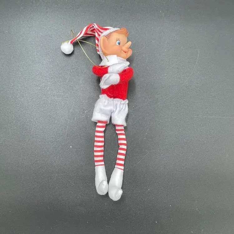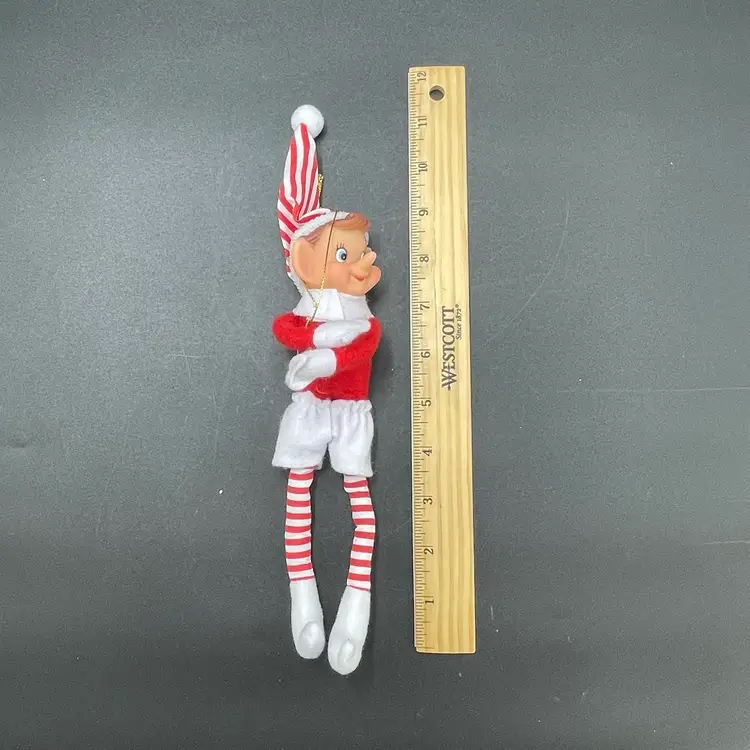 This is a knee hugger pixie elf hanging ornament. He measures approximately 5" tall when sitting, 12" long when stretched. There is a small scuff on the top of his nose as shown in pictures. No other major flaws. Smoke free home.