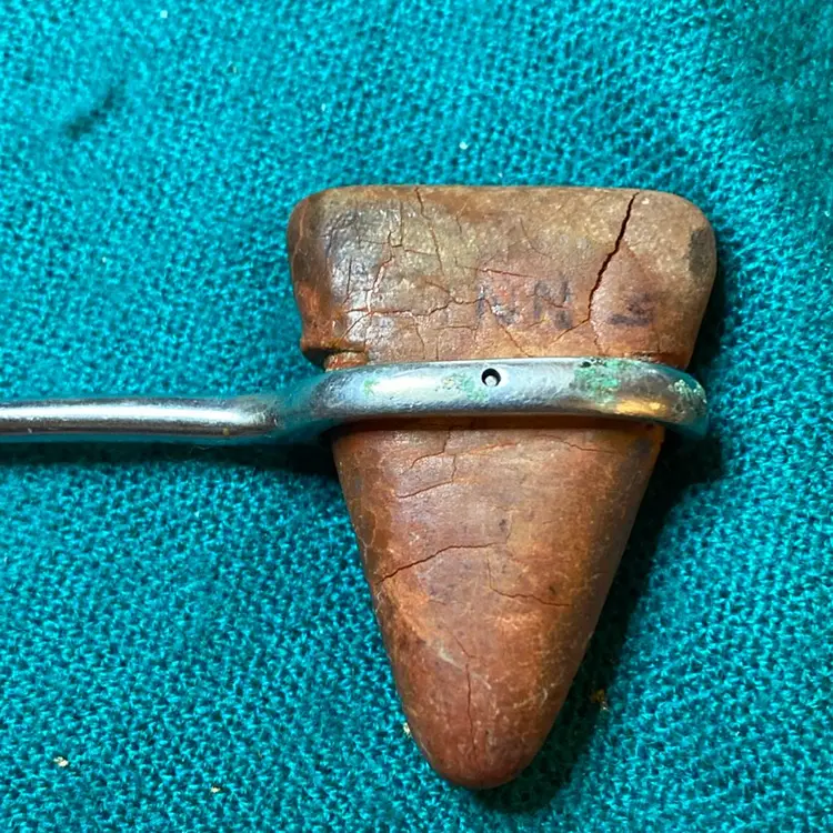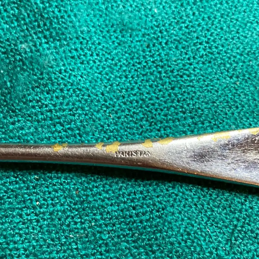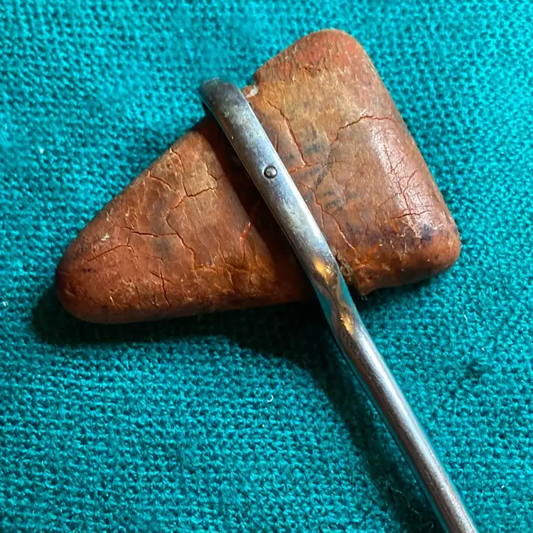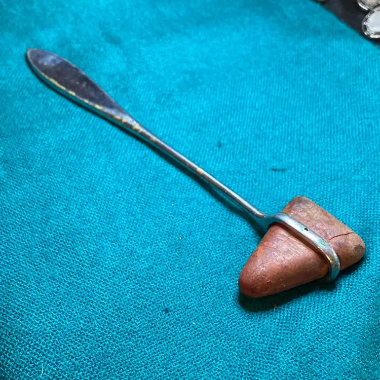 This tool is made by Taylor of Pakistan to test joint reflexes. It is worn and cracked indicating significant age and use. Initials INN indicate International Nonproprietary Names, another term for WHO World Health Organization. Total length is 8 inches the other side reads MFD.