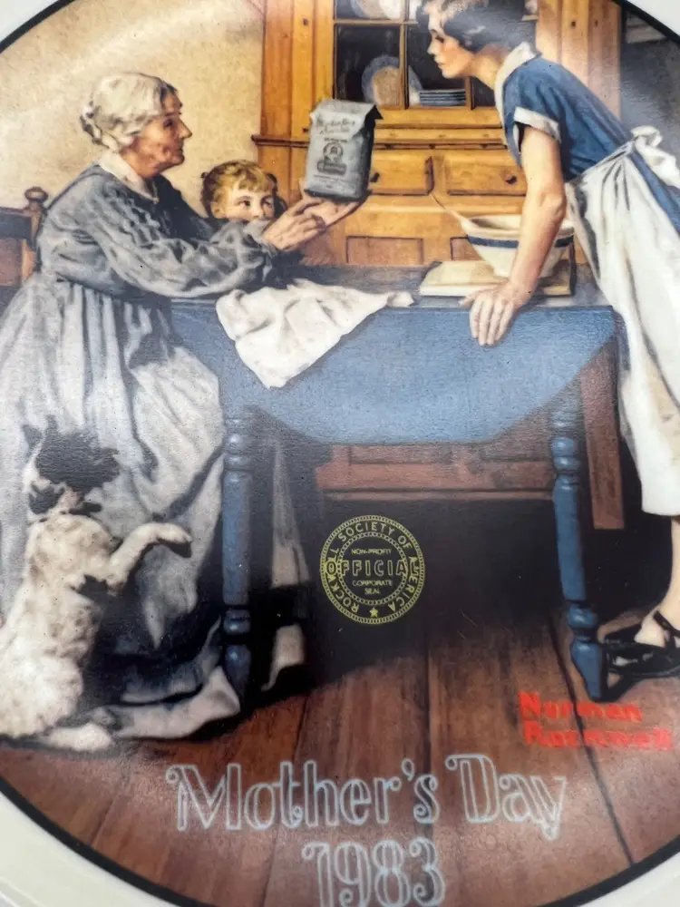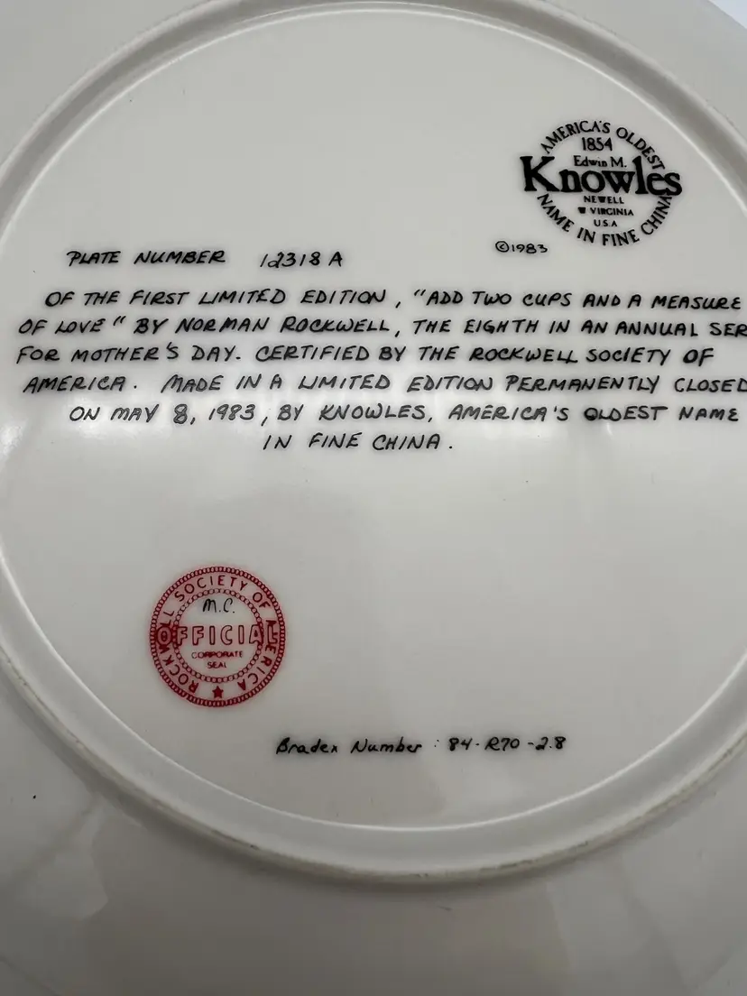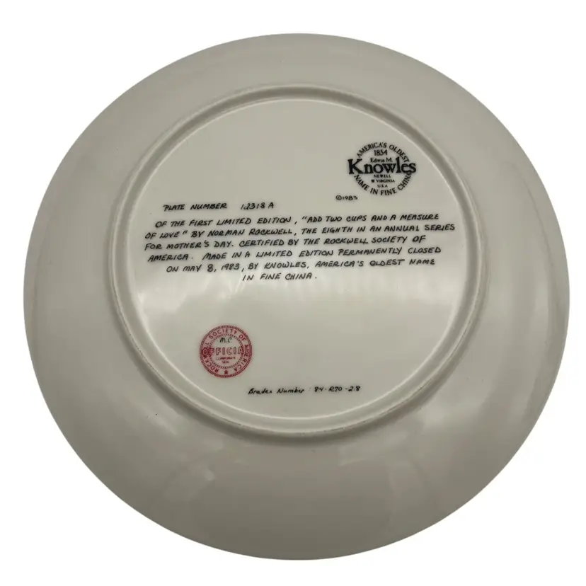 Edwin M. Knowles fine-china collector plate titled “Add Two Cups and a Measure of Love” by Norman Rockwell, the 1983 Mother’s Day issue and eighth in the annual series. The plate measures about 8.5 inches across and is backstamped with Bradex 84-R70-2.8 and a hand-inscribed plate number; the edition was permanently closed on May 8, 1983.