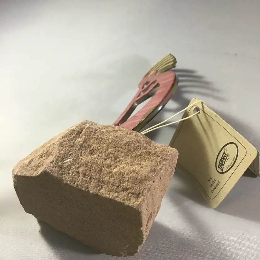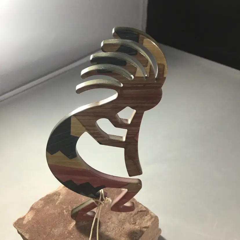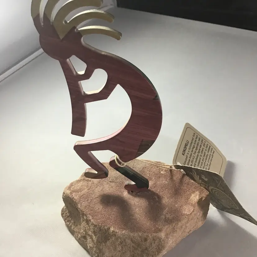 Kokopelli metal art piece on stone base