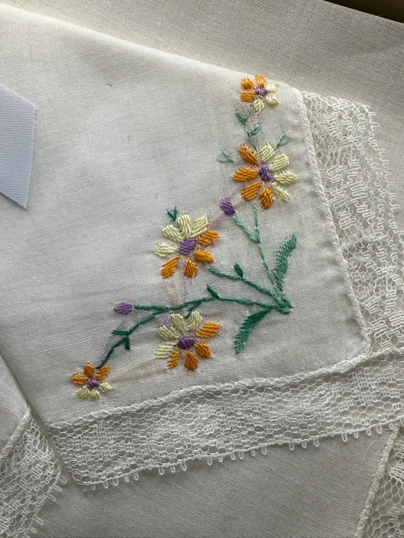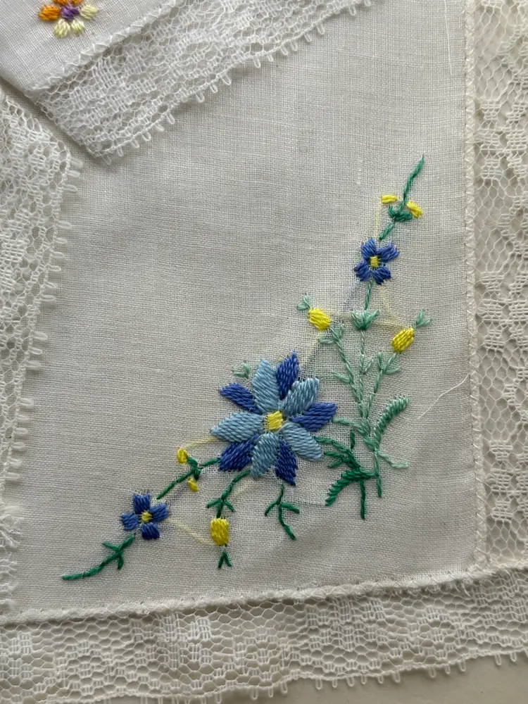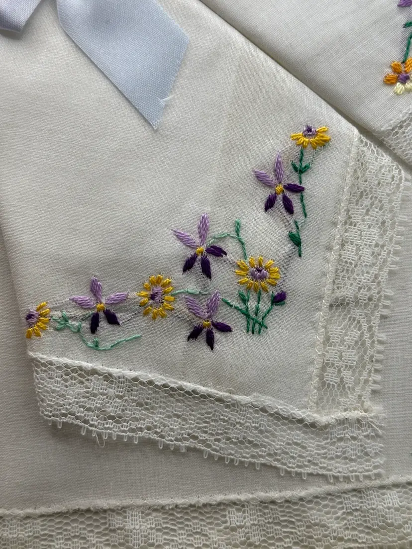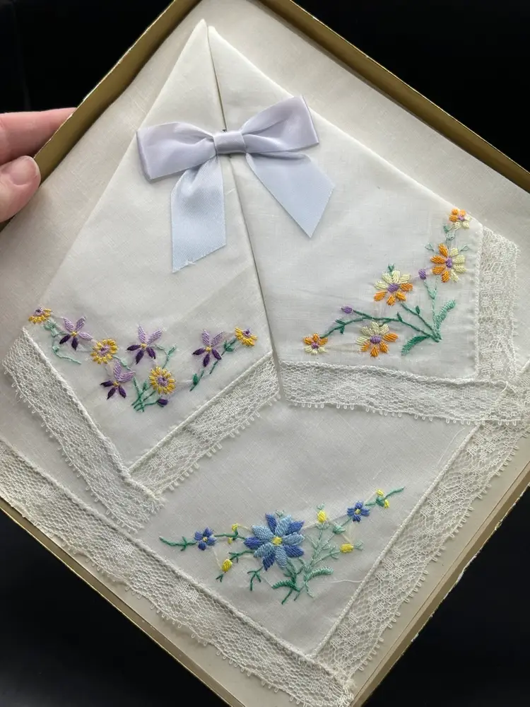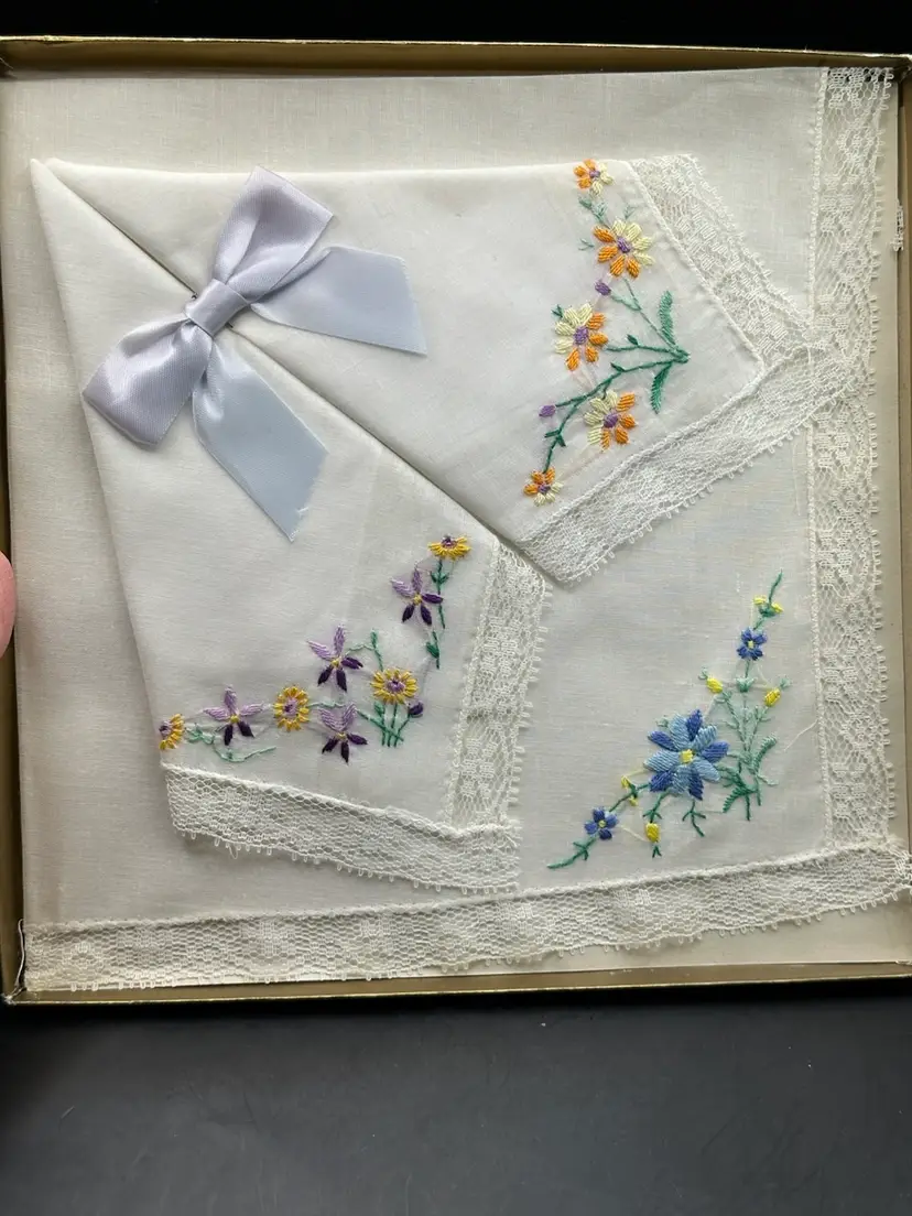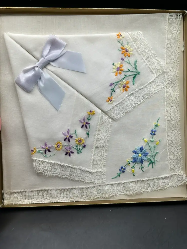 Ladies Fine EMBROIDERED HANDKERCHIEFS, Boxed Set of 3, Blue, Pink and Purple Floral design, 100% Cotton, Vintage 1960s