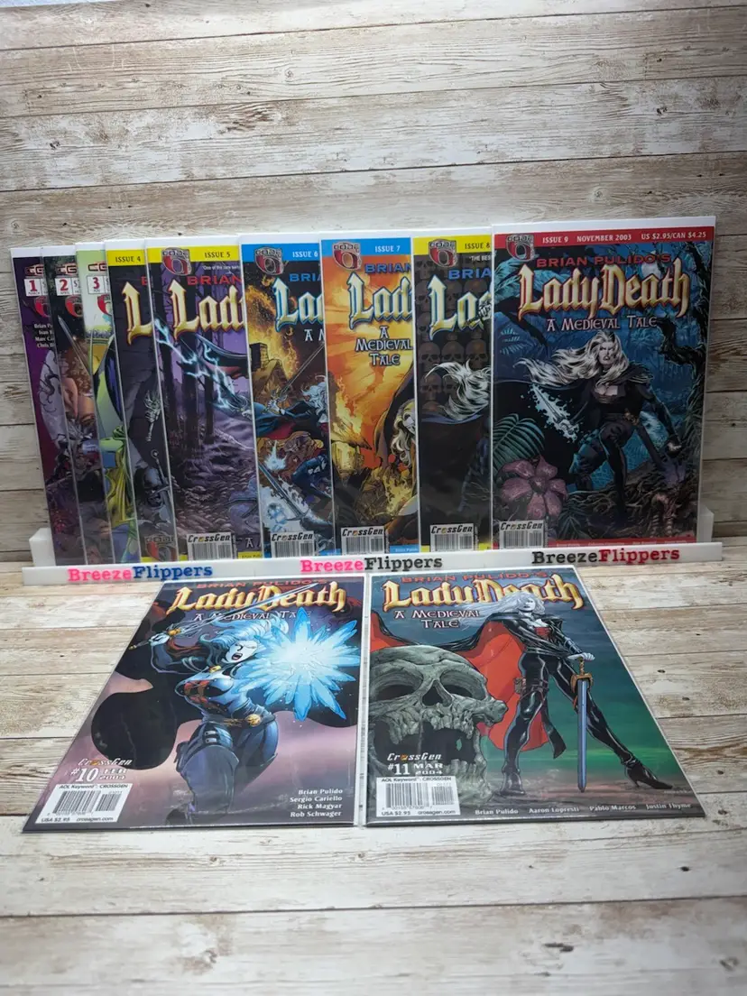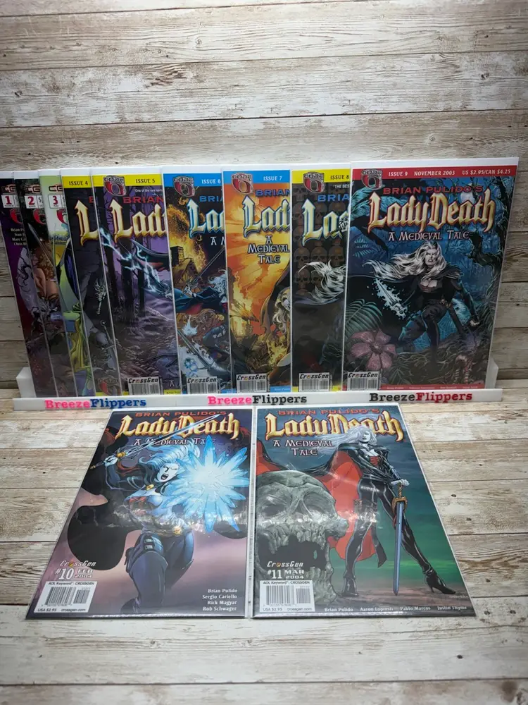 Own issues #1–11 of Lady Death: A Medieval Tale (2003) by Brian Pulido, published by CrossGen Comics. This near-complete set delivers the full story arc minus the final issue, with each comic in NM- condition—sharp corners, vibrant color, and great eye appeal.
