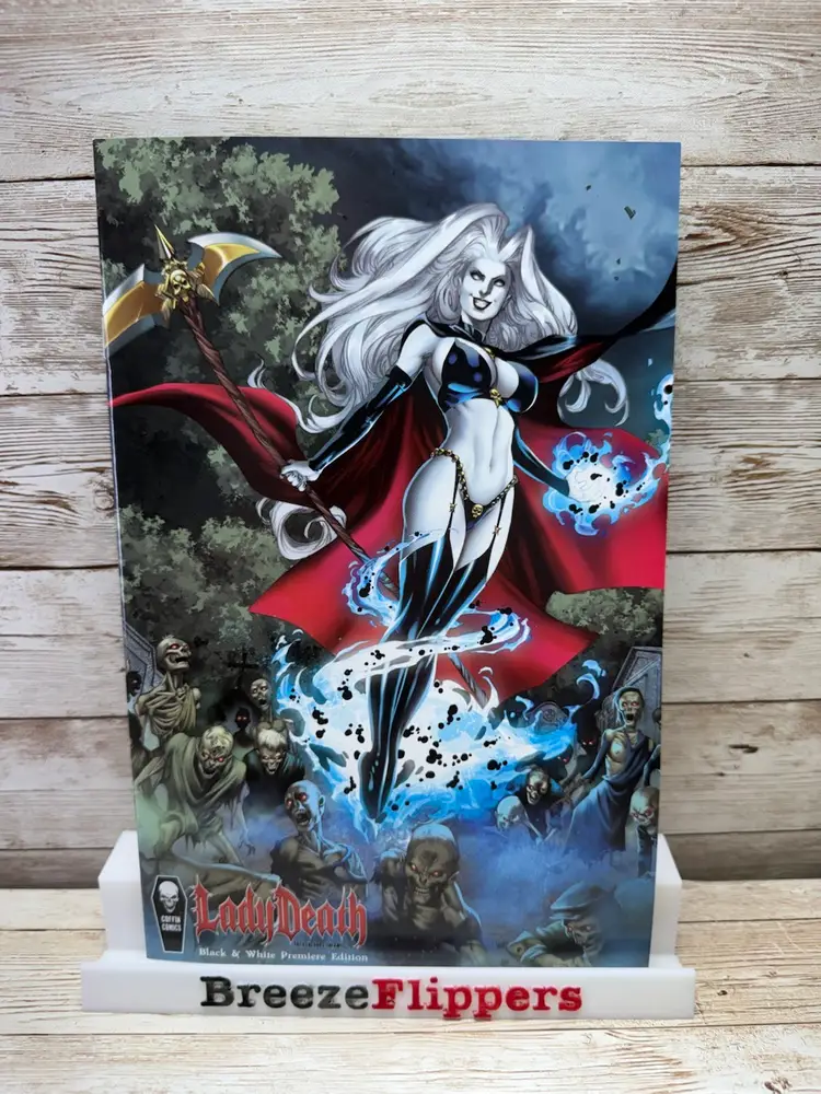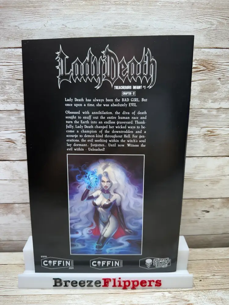 For sale is Lady Death: Treacherous Infamy #1 — Black-and-White Premier Edition, published by Coffin Comics. This limited variant showcases stunning monochrome cover art and marks the beginning of Chapter 12 in the Lady Death saga.