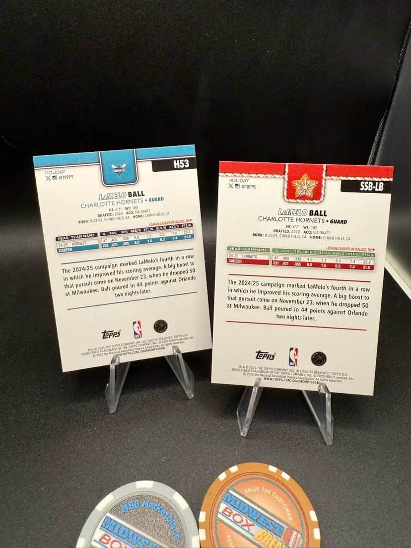 This is a a 2-card Lamello Ball lot. Includes holiday base and back-side holiday SSP variation from Topps Holiday 25-26. Charlotte hornets.