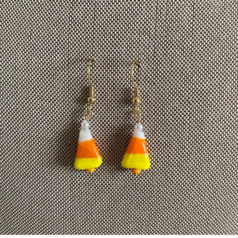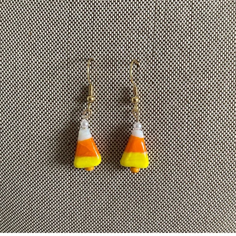 Vintage lampwork glass Halloween candy corn drop earrings. Each bead is handmade so will have natural variation in tgem. The earrings measure 1/2” x 1 3/4”.