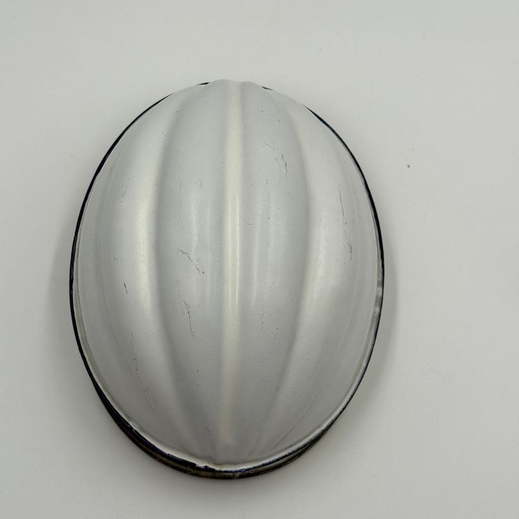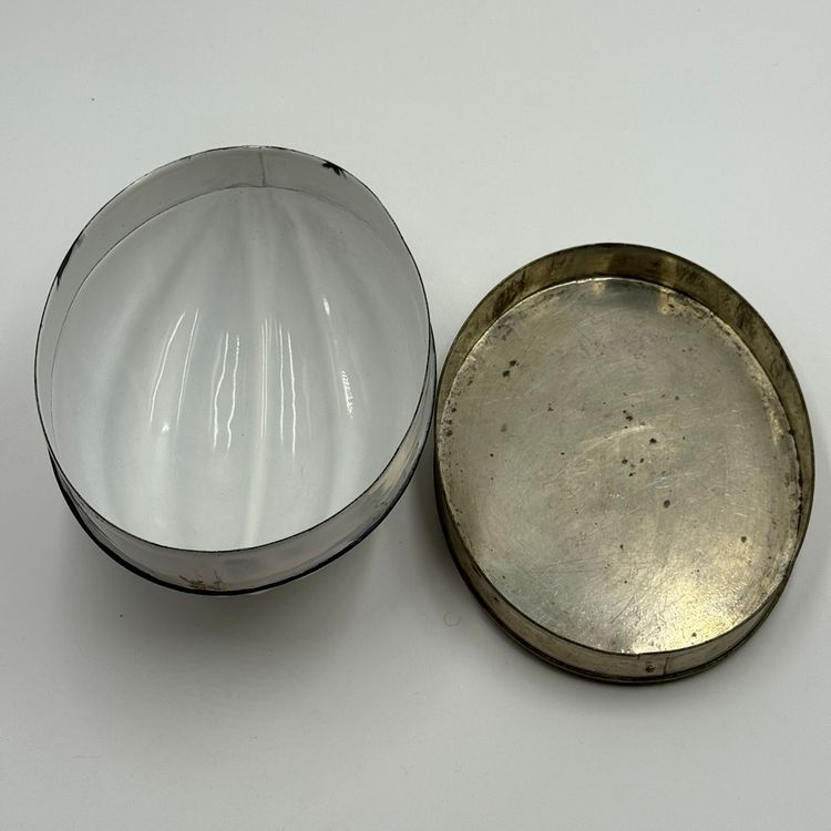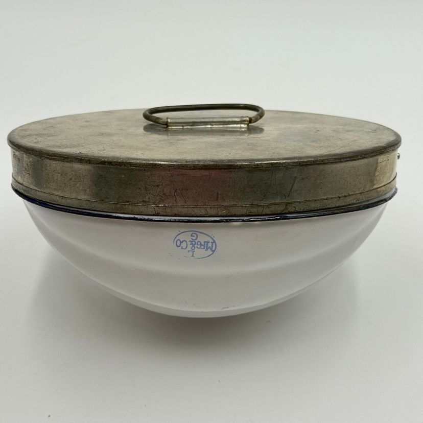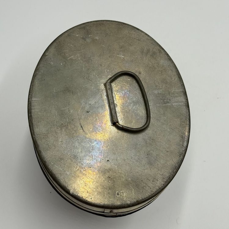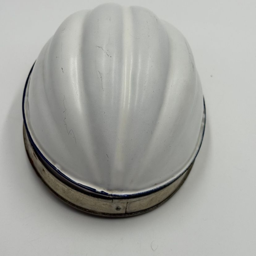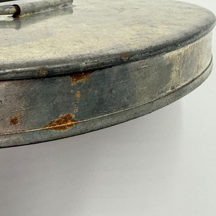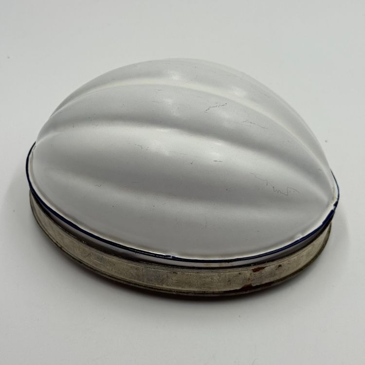 In fair condition. There is some chipping on the rim of the mold. There is some rusting on the lid. Measures 4 inches tall and 7 3/4 inches long.