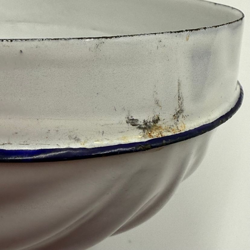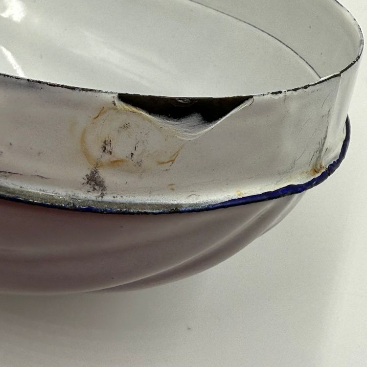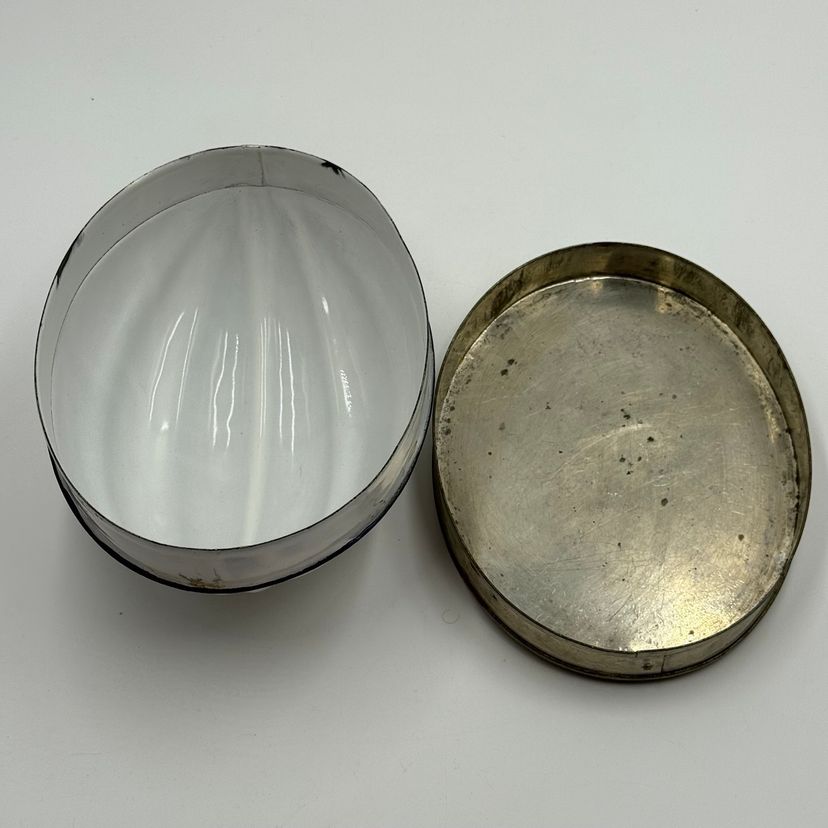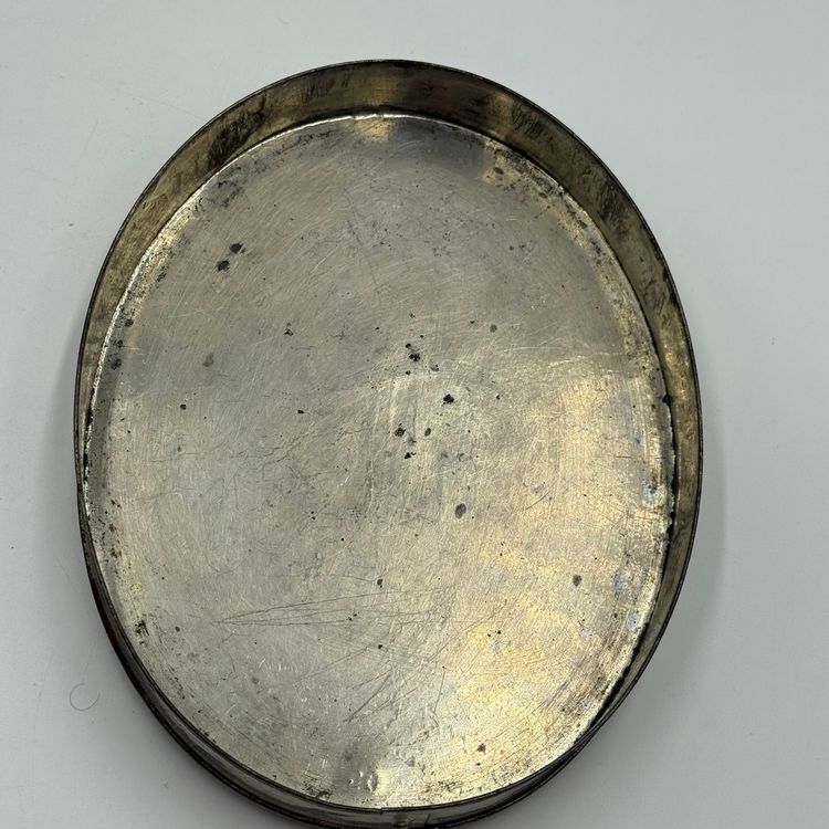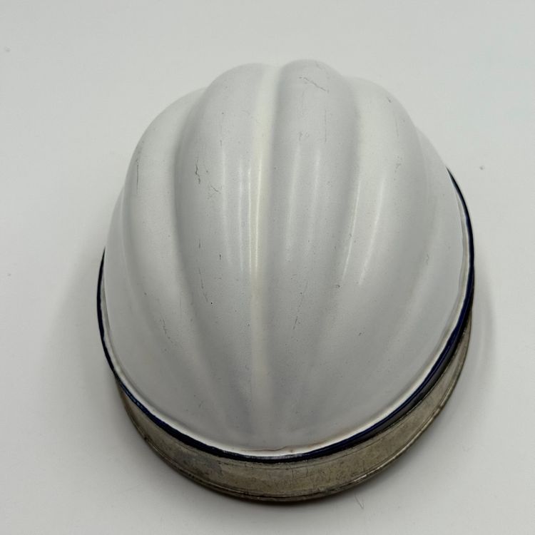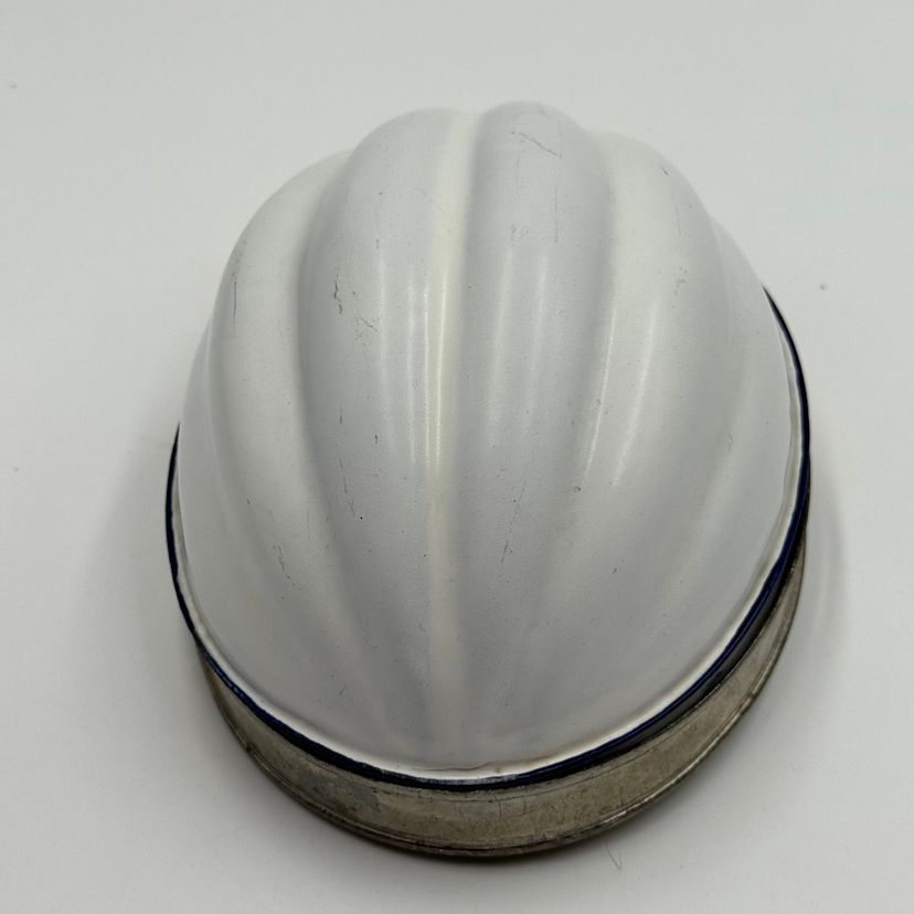 In fair condition. There is some chipping on the rim of the mold. There is some rusting on the lid. Measures 4 inches tall and 7 3/4 inches long.