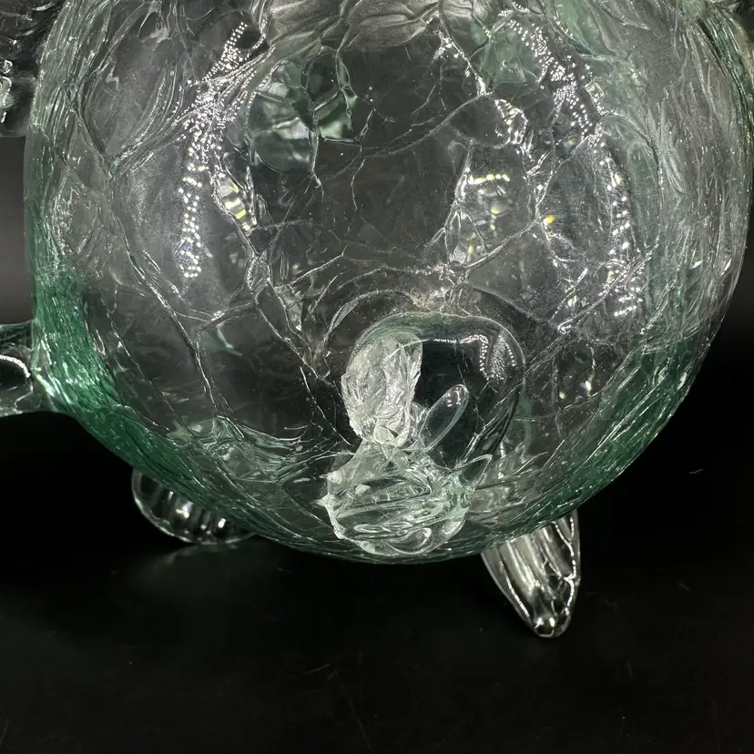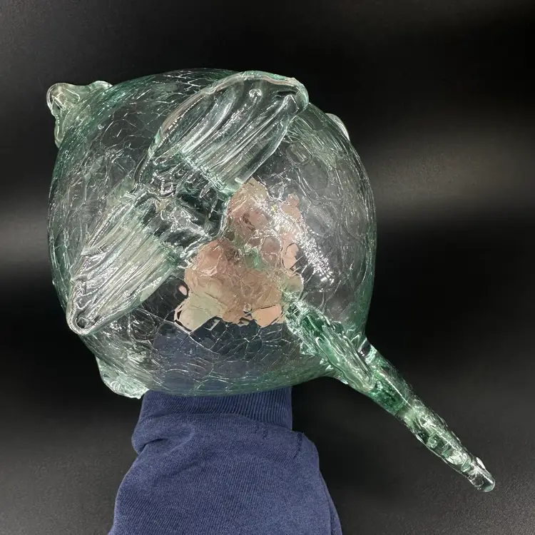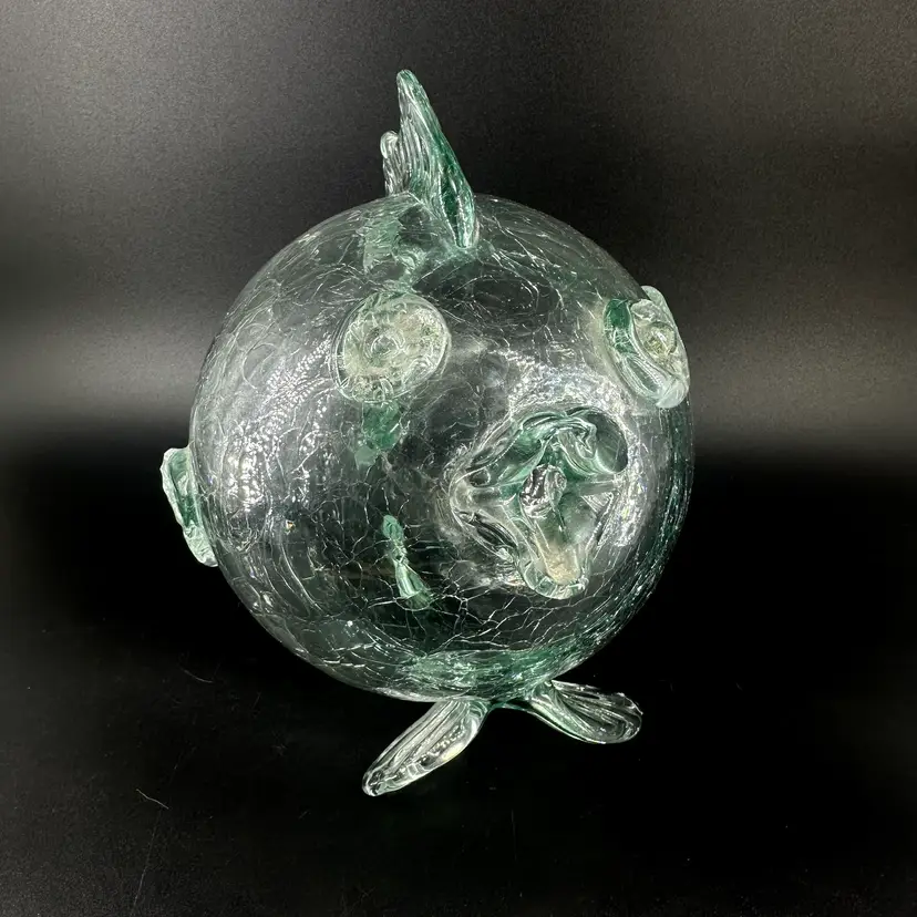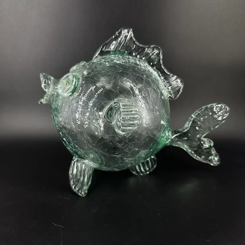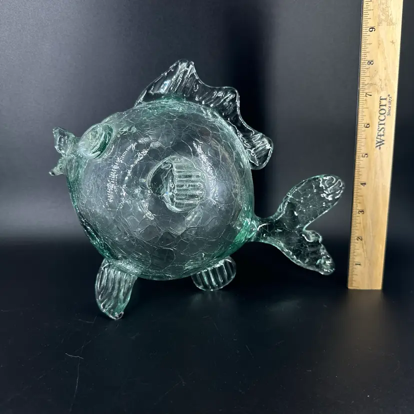 Large blown crackle glass fish. One of the fins on the side is broken off, see picture. Not signed or marked. Fish measures roughly 10” by 10”.