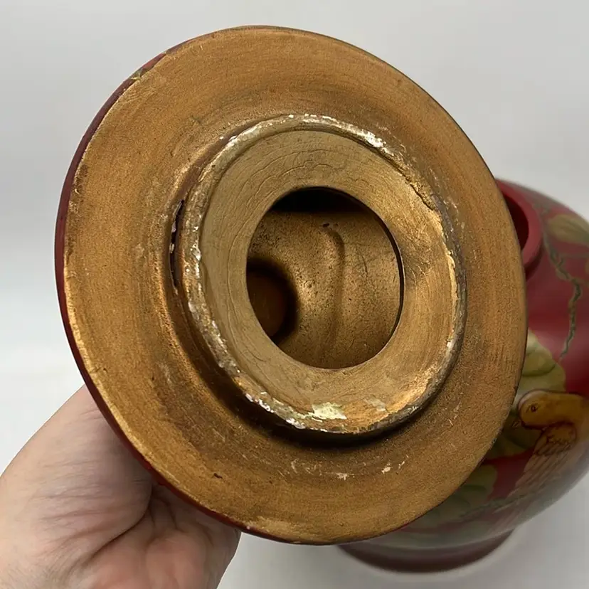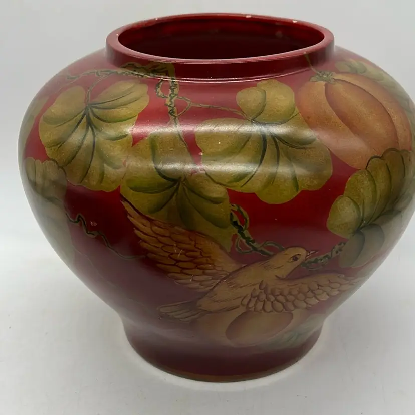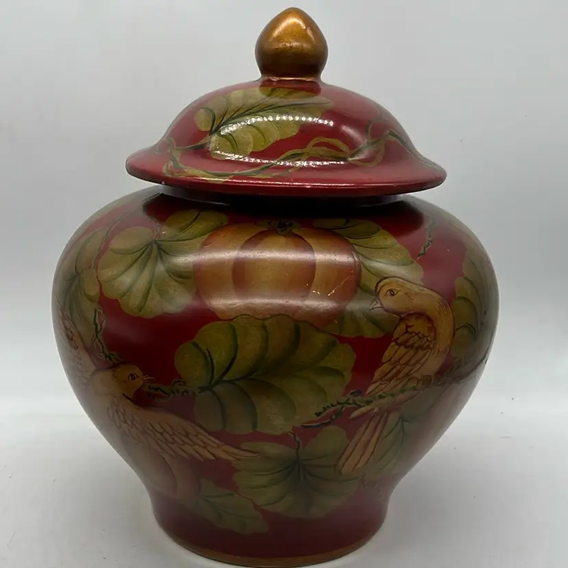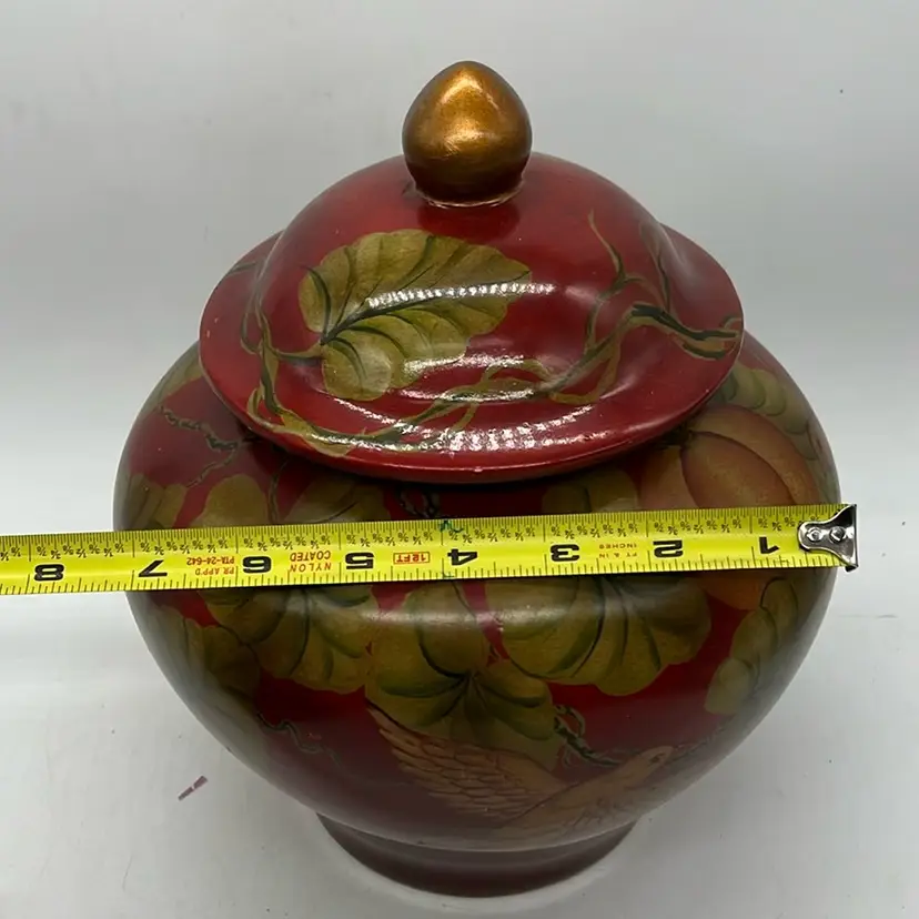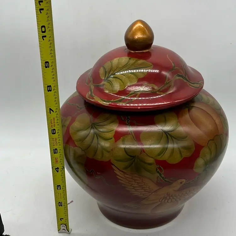 This piece is in overall great shape. It has a few paint chips (see photos). It has birds on it and is lidded. 10” tall. I do refund shipping overages.
