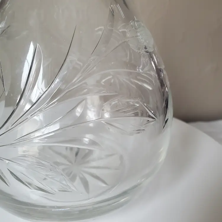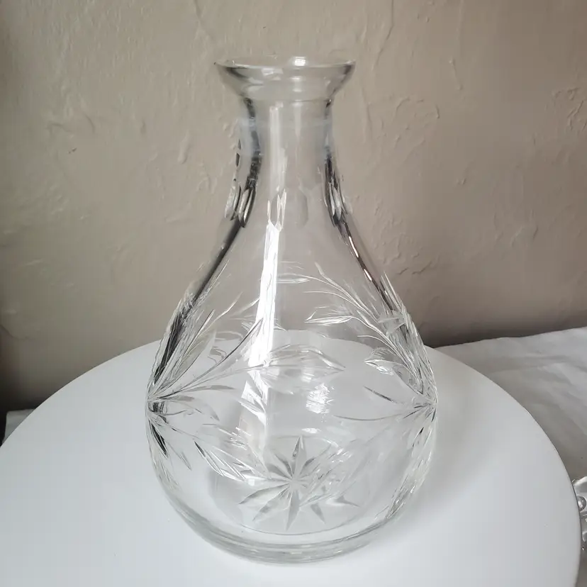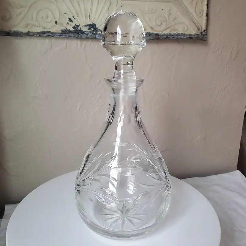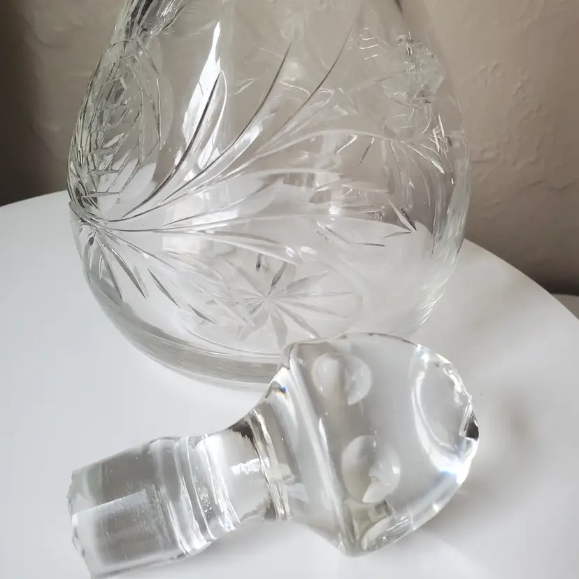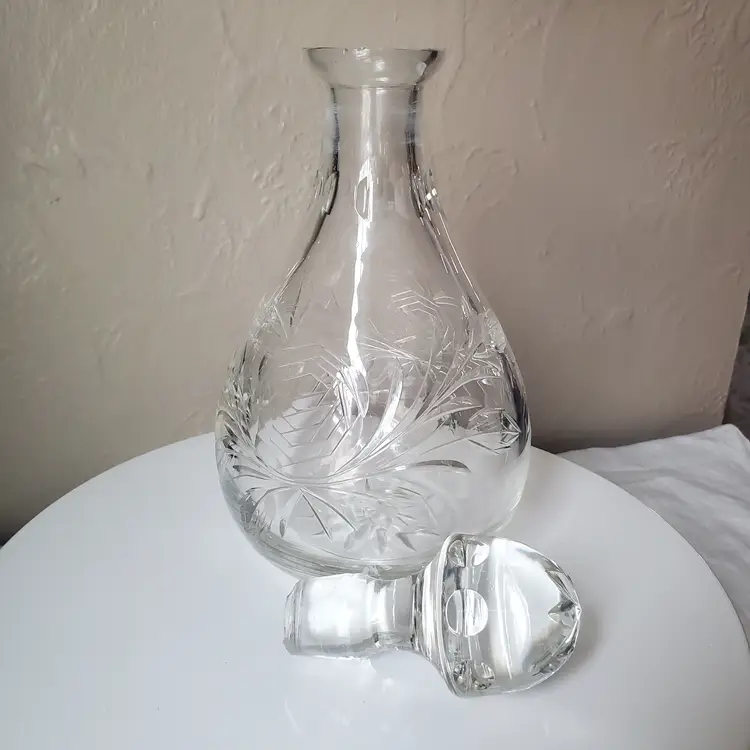 This is a beautiful large crystal decanter with an etched rose motif. Could also be used as a vase. 11 1/2" tall with stopper.