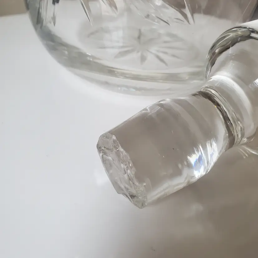 One flea bite on top rim. Bottom of stopper has some breakage that doesn't impact use.