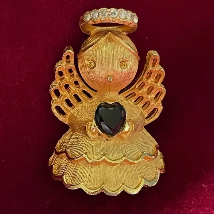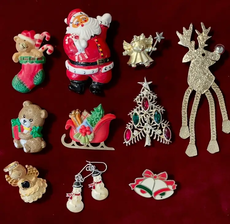 Stocking bear: made in China Santa: made in Taiwan Angel Teddy Bear w/spinning wand: GIUSTI (Gigi GIUSTI) Reindeer: ULTRA CRAFT Bear w/present: RUSS Sleigh: Hallmark Cards, Inc. Christmas Tree: Tancer II Angel holding heart: ULTRA Snowman earrings: AVON Bells: KOREA (light wear to enamel and gold tone on back center)