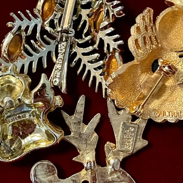All pieces are in very good condition as pictured. I have inspected closely for missing rhinestones and everything appears to be complete. All clasps, pins, catches, etc work well/as intended. Little to no plating wear. Clean, individually bagged and ready for your Christmas show, collection or gifting!