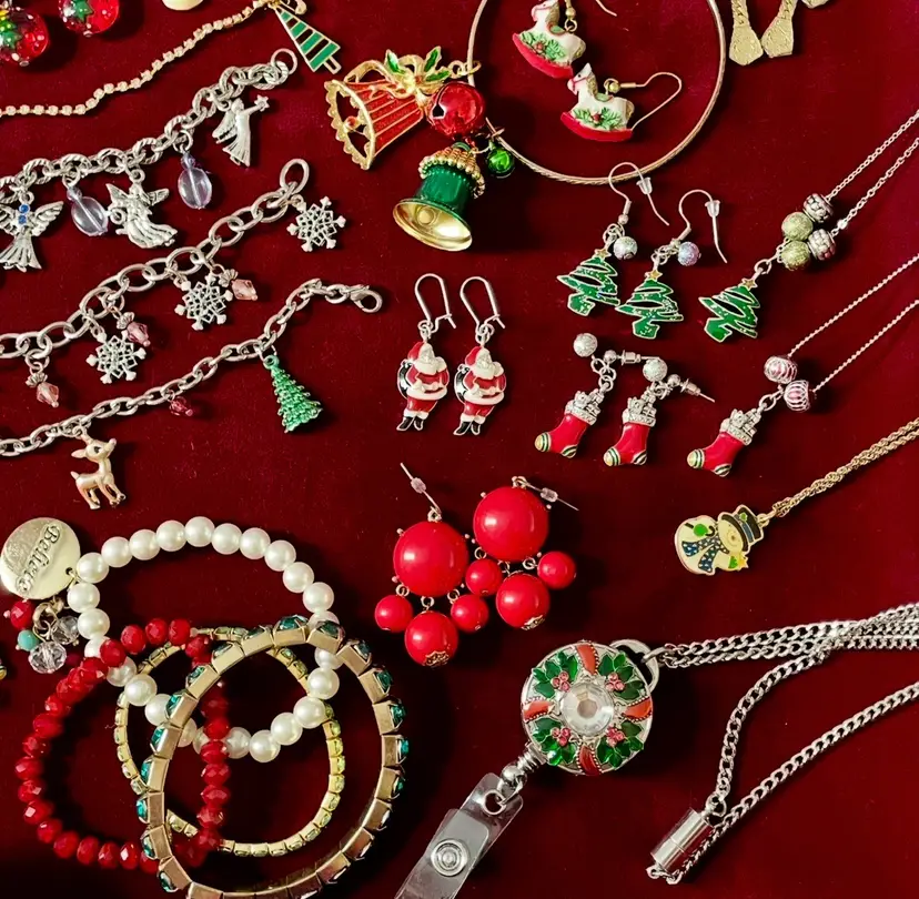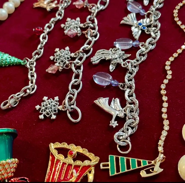 5 necklaces 1 badge holder/lanyard 9 bracelets 9 pair earrings (pierced) 9 pins 21 brooches 1 ring (box included)