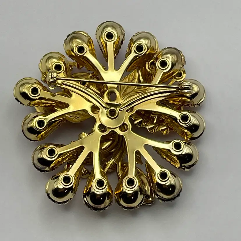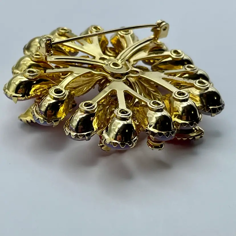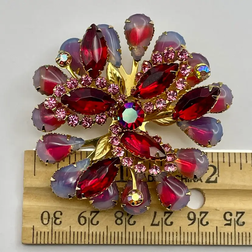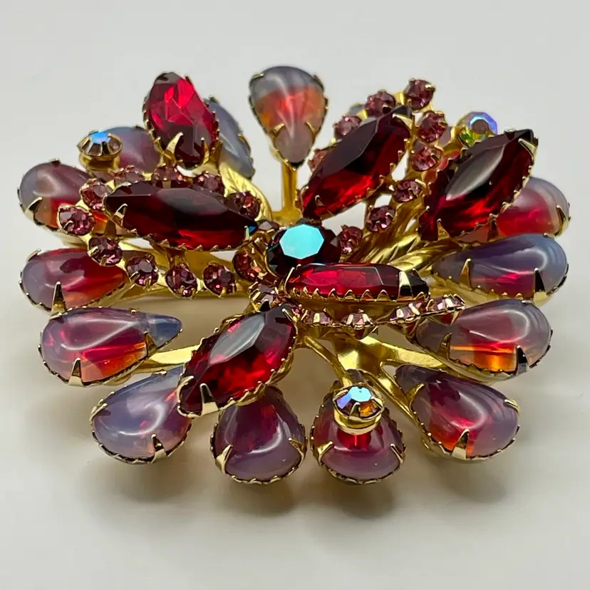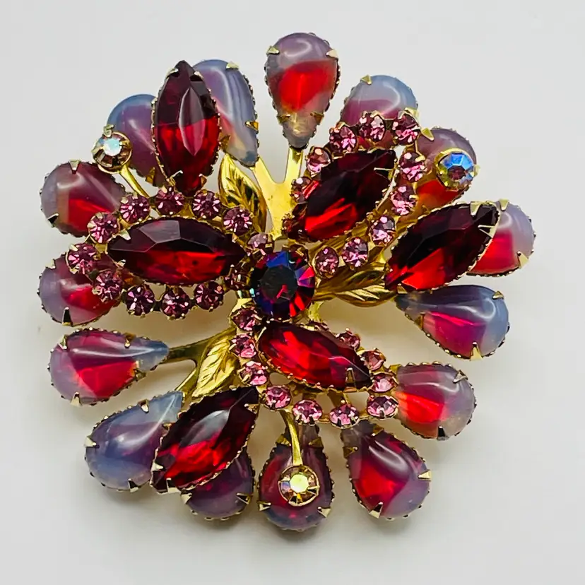 I believe this brooch is Judy Lee (unsigned). Gold tone with pear shaped pink striped opalescent, red navette, pink & AB accent glass rhinestones.