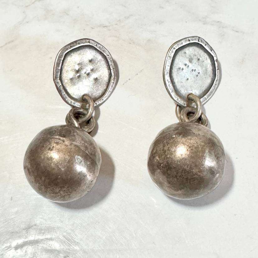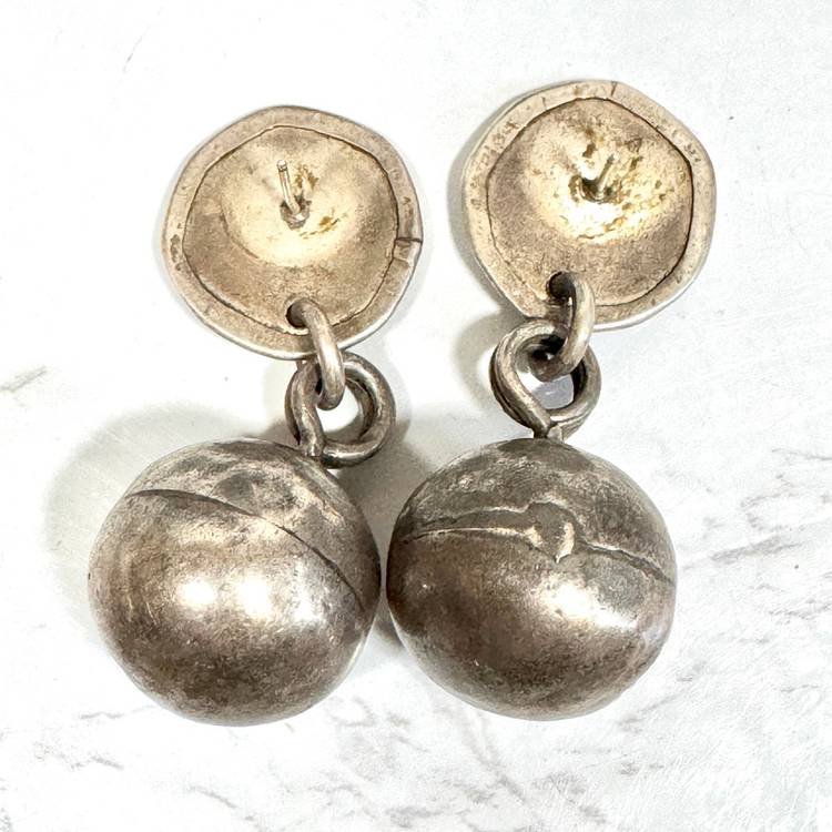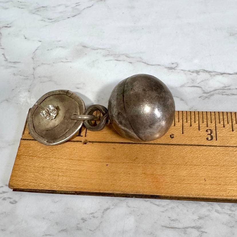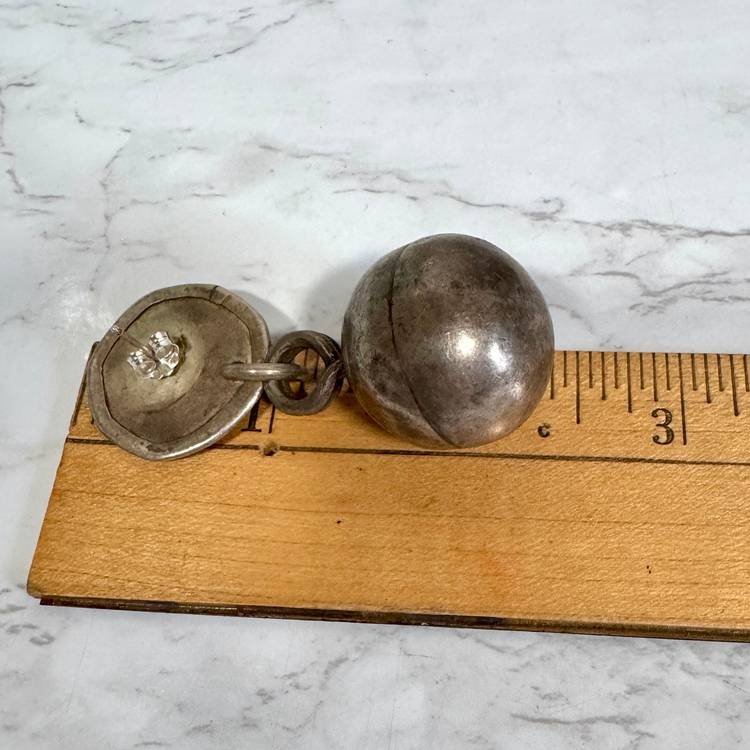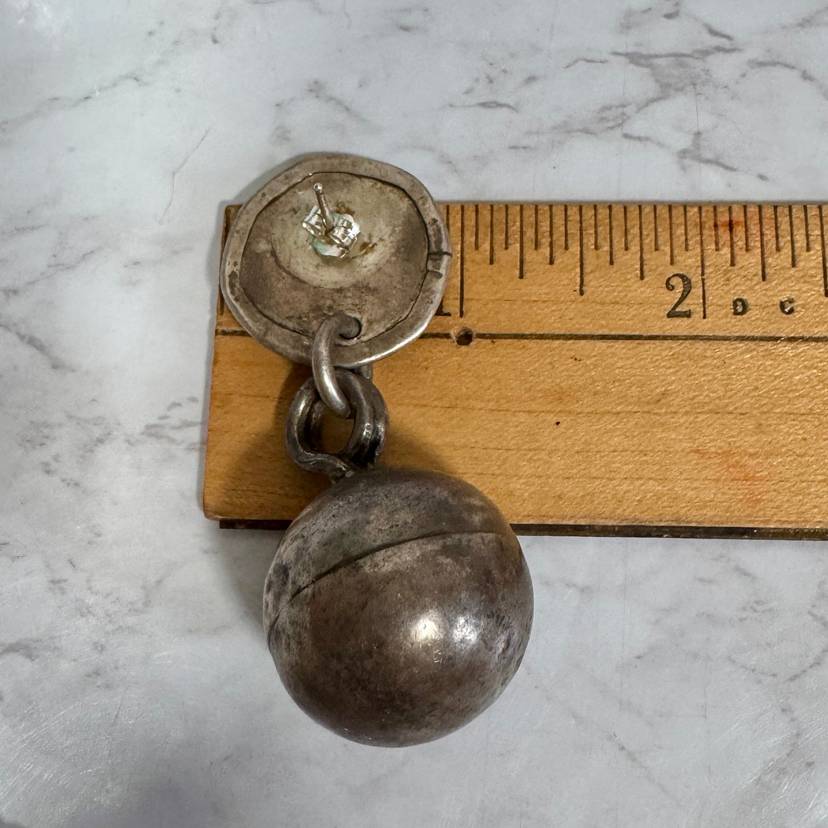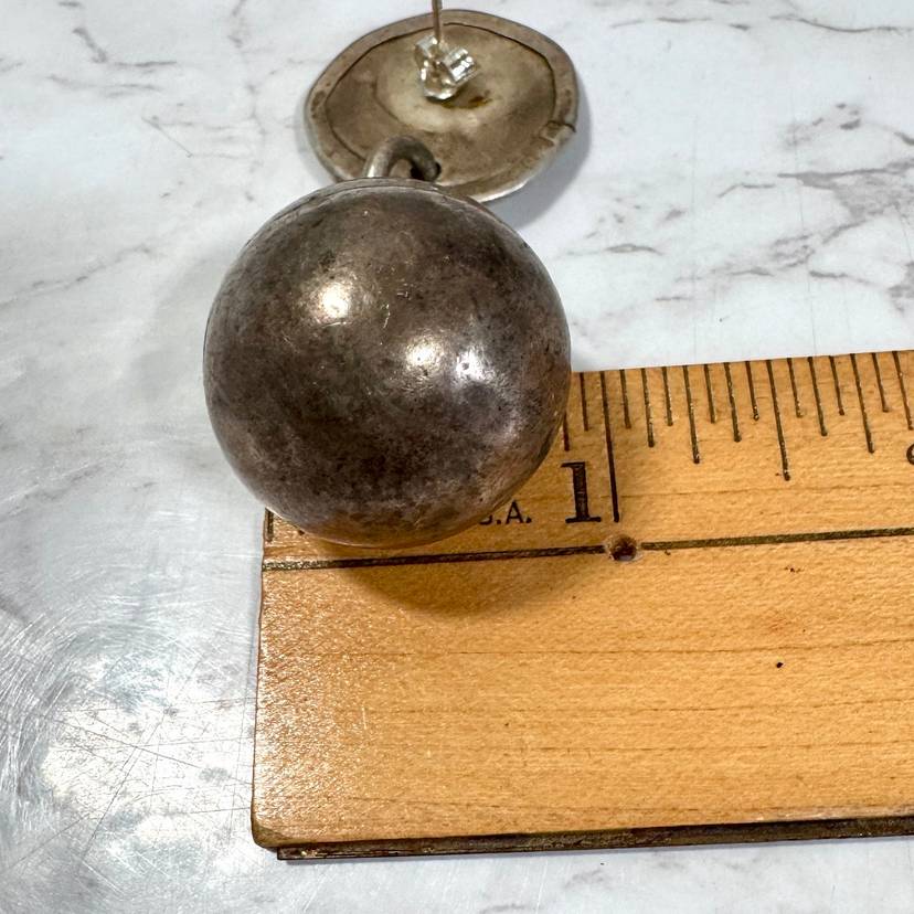 Eye-catching large sterling silver dangling ball pierced earrings, tested sterling, featuring a 1” wide ball hanging from a 7/8” wide disk, 2-3/8” long overall, weighing 27g per pair. Good condition with minor wear and patina. A bold, handcrafted statement piece!