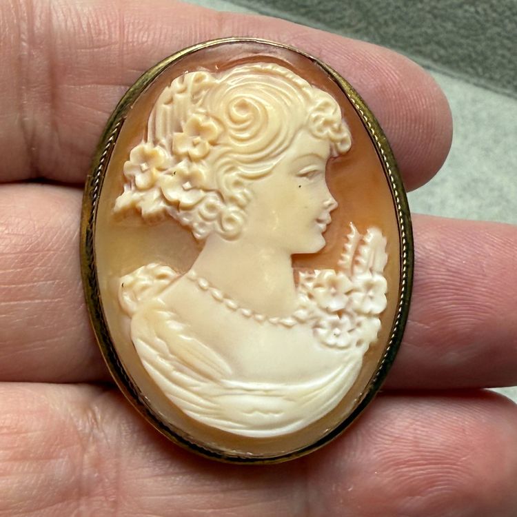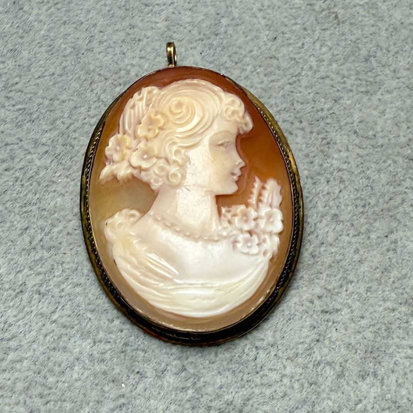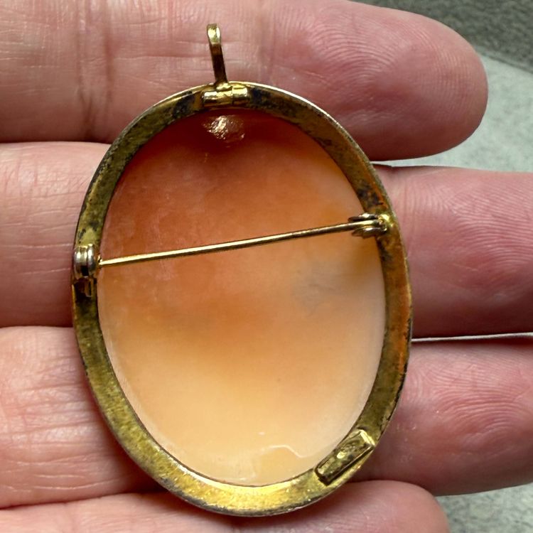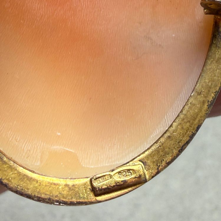 Large Vintage Oval 925 Sterling Carved Shell Cameo Brooch Pendant Hallmarked. About 1 5/8" long. Good condition. Has some light wear and patina. Can be used as a brooch or pendant convertible. Marked 925 with some other hallmarks that I cannot make out. Looks to be a number. Gold vermeil.