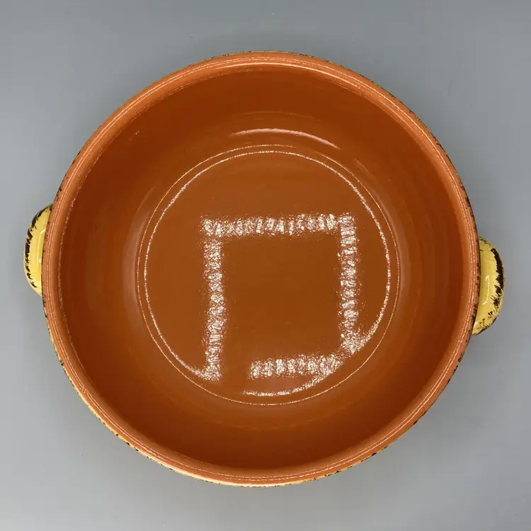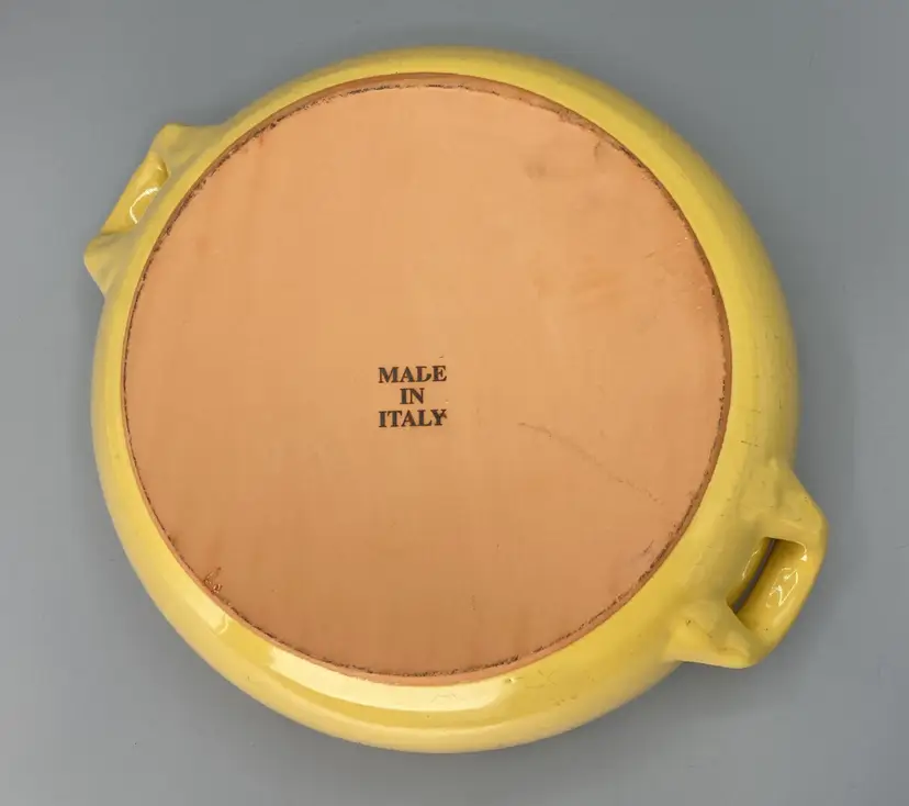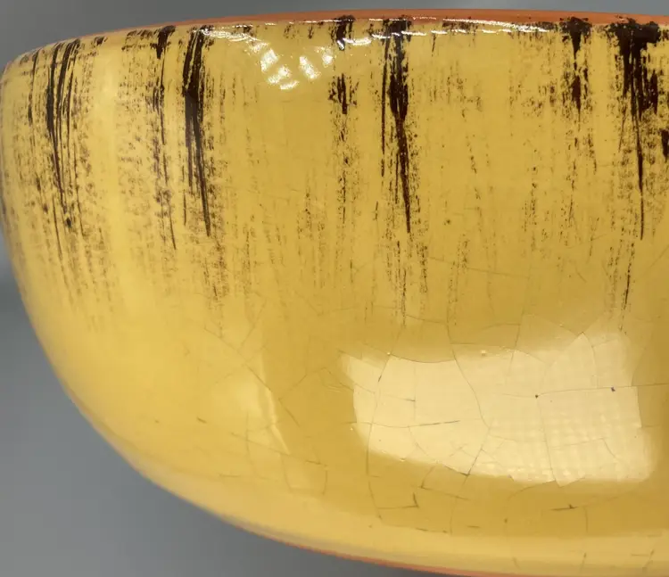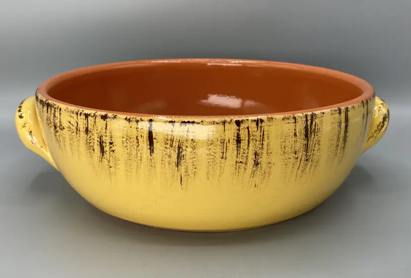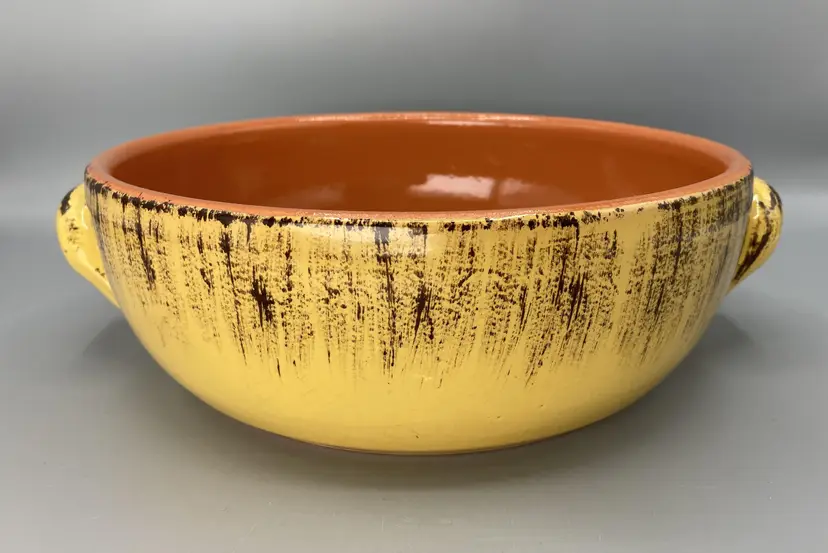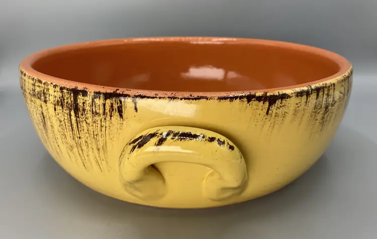This large bowl is in good condition. It does have some wear on the bottom as well as crazing all over. This bowl measures approximately 11 1/2" across - this includes the handles. The bowl itself measures approximately 9 1/2" across and 3 1/2" tall.