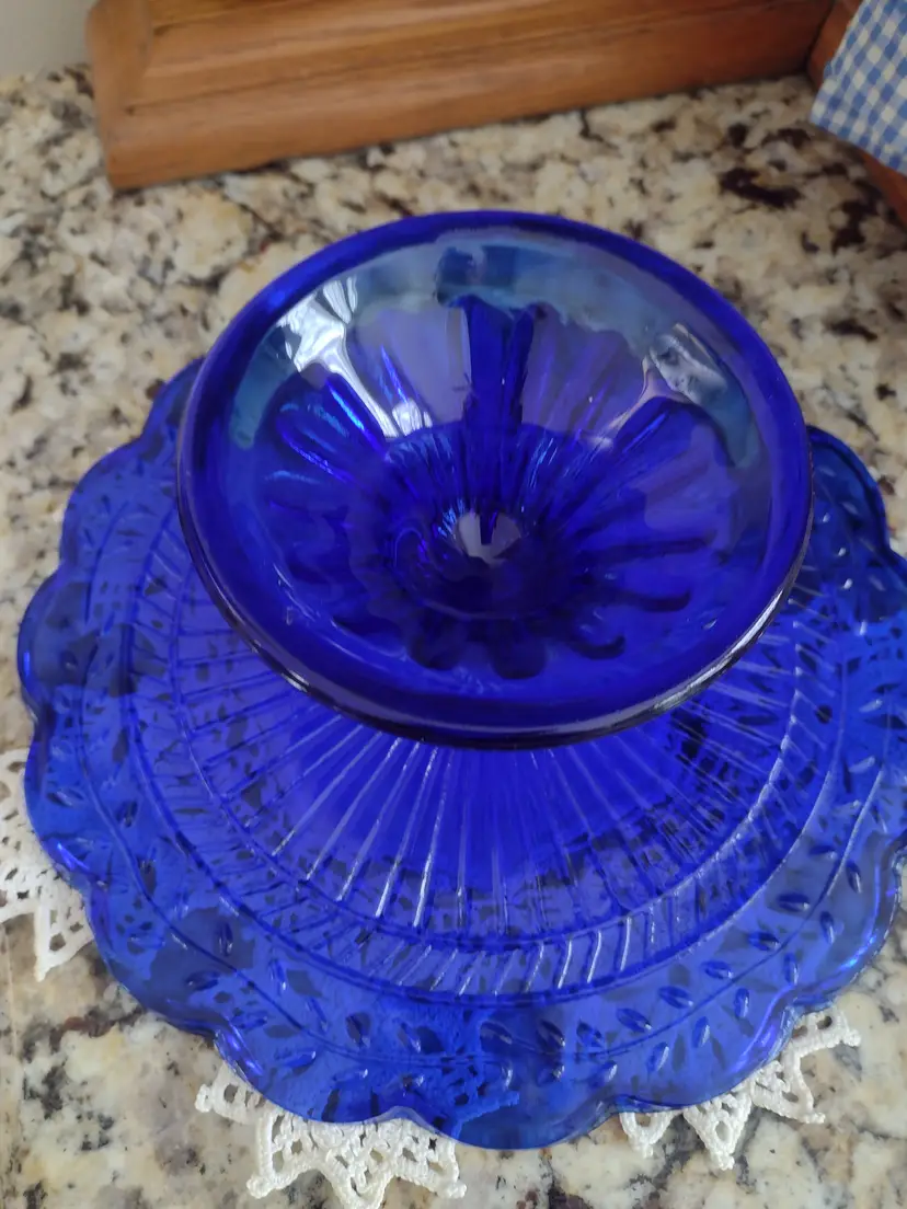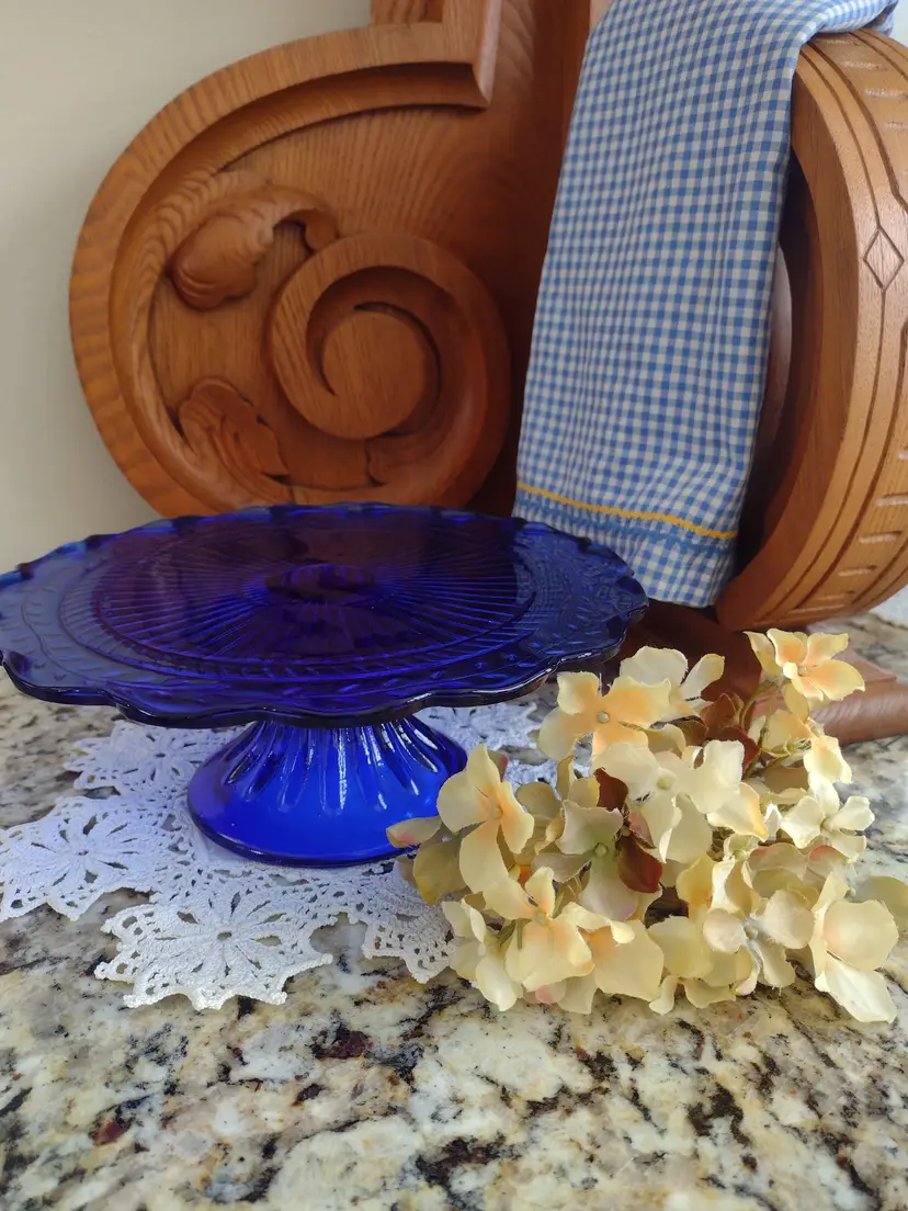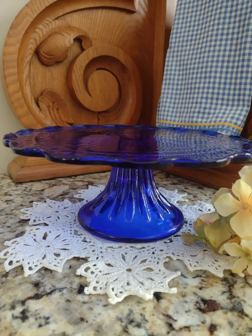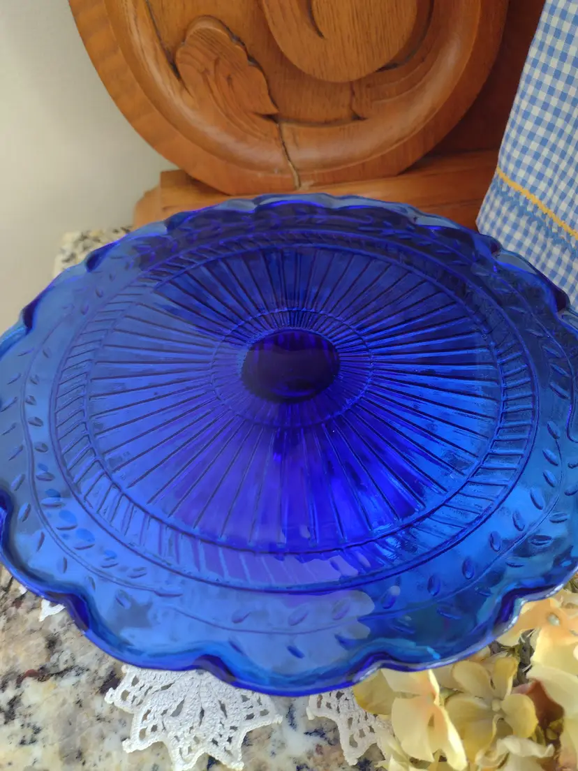 Rare find! A beautiful Laurel Leaf cobalt blue cake stand. This highly collectible vintage cake plate is in excellent condition. It is lovely as a decorative display or showcasing your fresh baked goods at a formal dinner party.