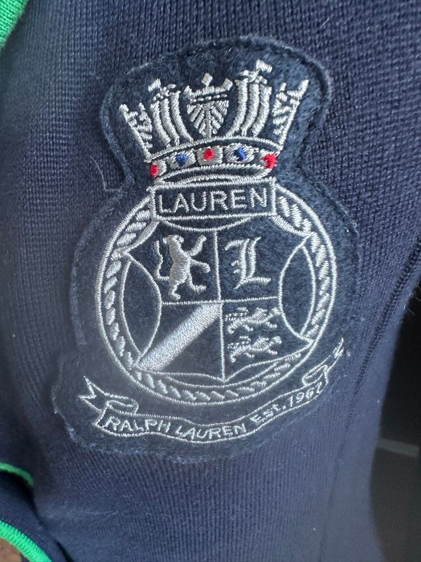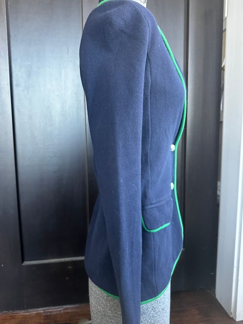 The Lauren Ralph Lauren Navy Knit Embroidered Blazer Jacket in size XS is a stylish and versatile outerwear piece perfect for various occasions. Made of cotton with a knit fabric type, this short jacket features a button closure, long sleeves, and embroidered accents. The classic navy blue color with a badge crest design adds a touch of sophistication to this retro-inspired blazer, making it a timeless addition to any wardrobe. Perfect for travel, parties, casual outings, or formal events, this blazer jacket exudes a preppy and designer appeal with a hint of old money charm. SKU:RH60WO2
