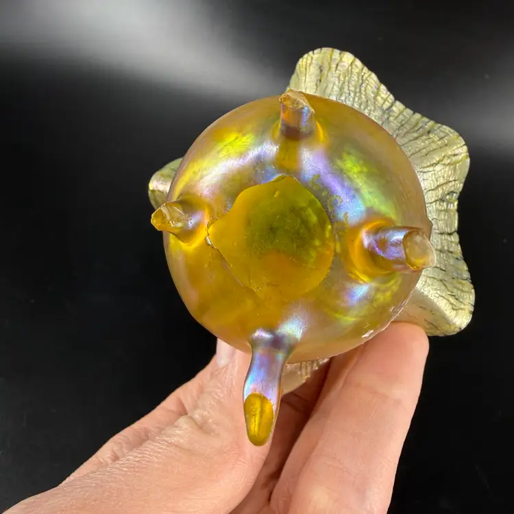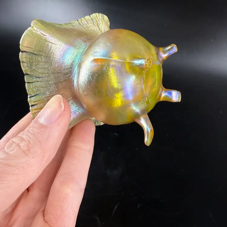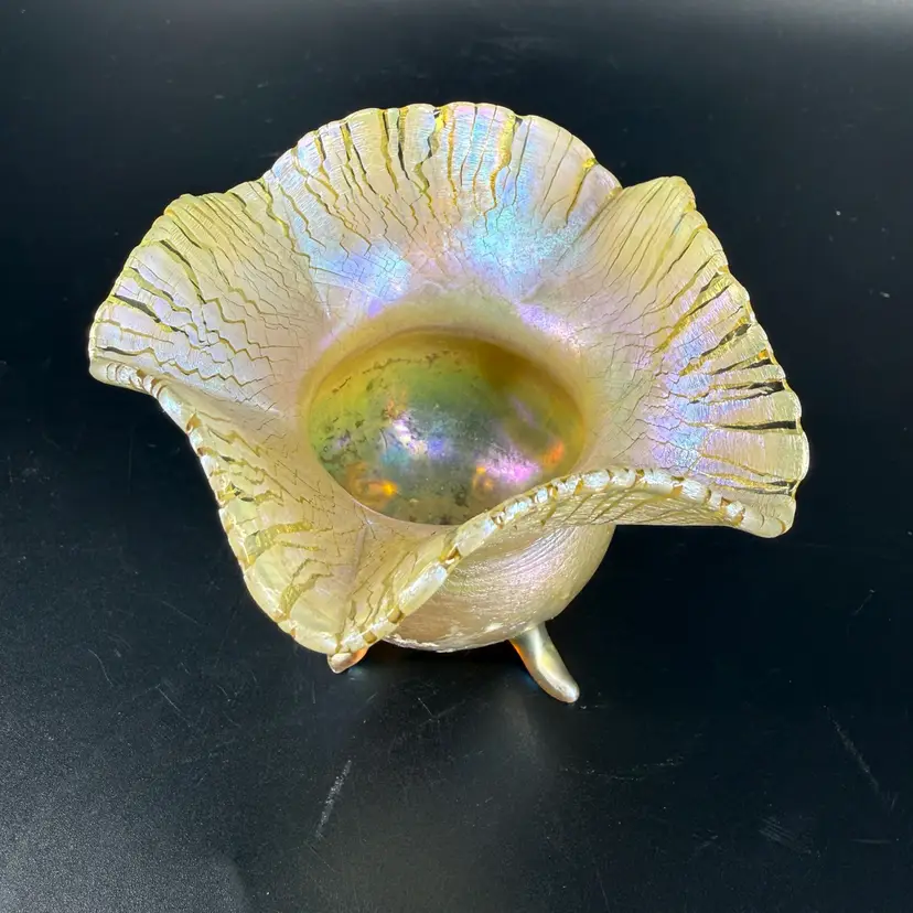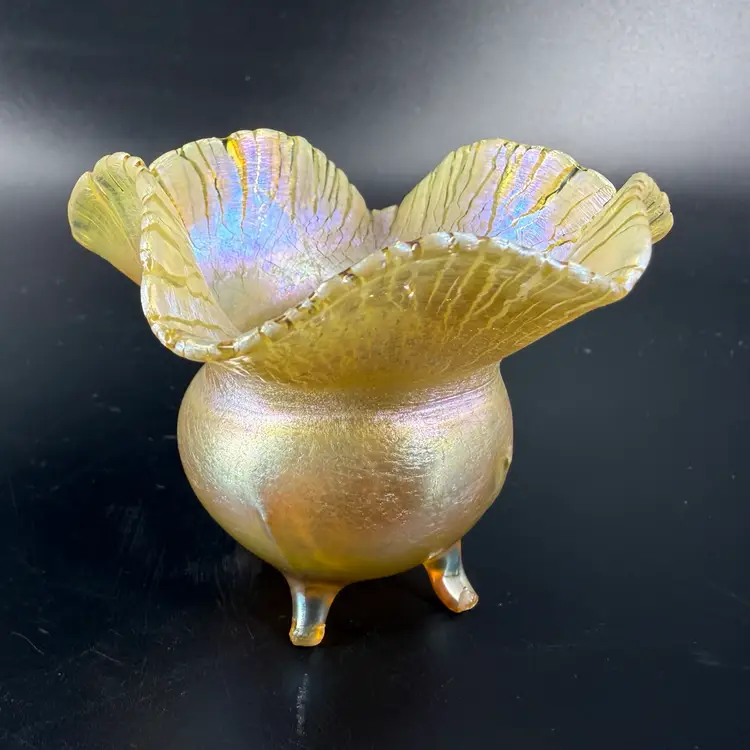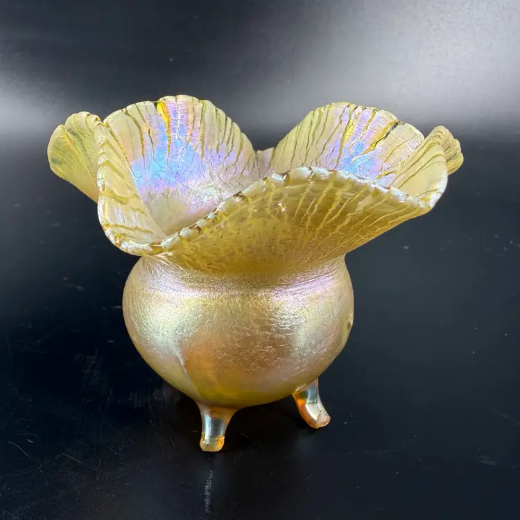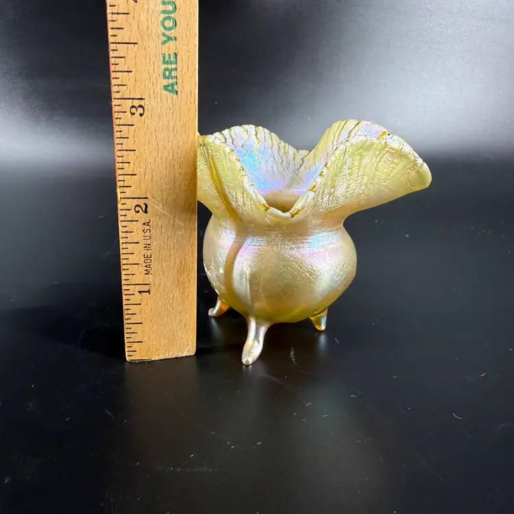 This small favrile vase is attributed to LCT. It is signed. It is being sold as is because three of the four feet are chipped. It measures approx 3” tall.