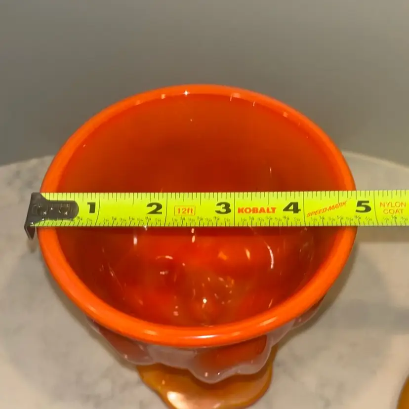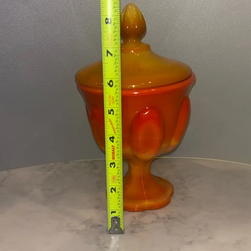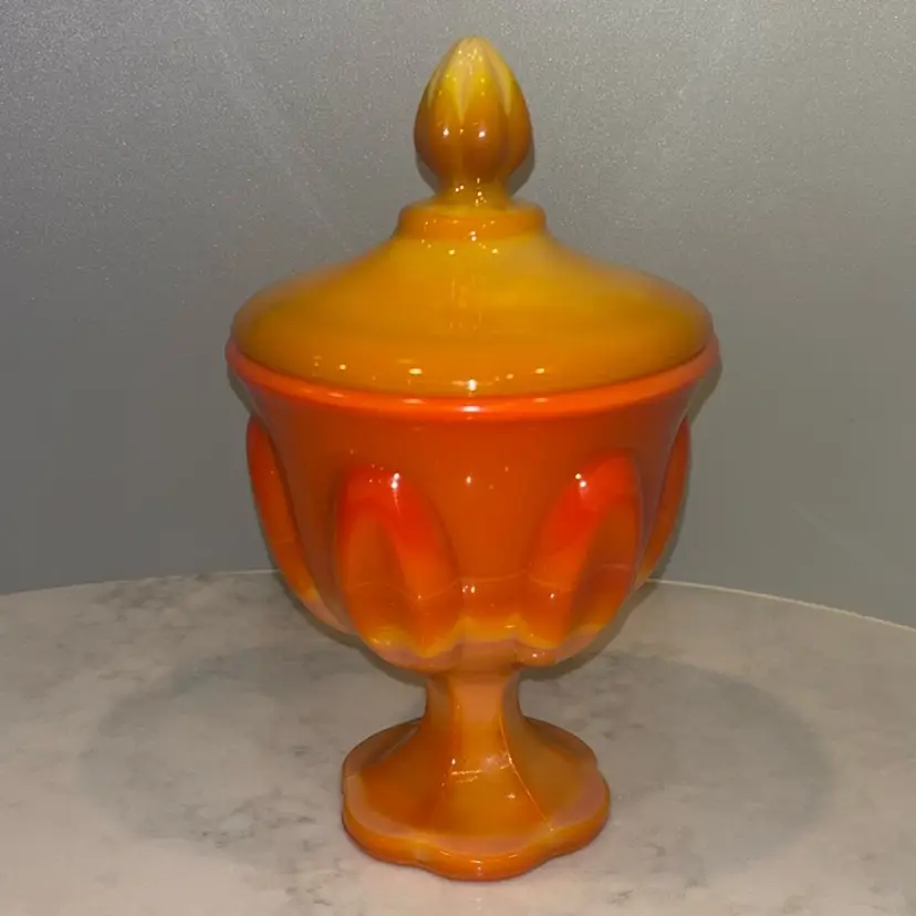 This vintage candy dish by LE Smith is a nice addition to your collection. It has a six pedal design. No chips or cracks..