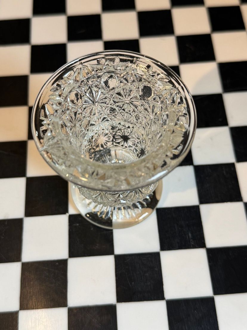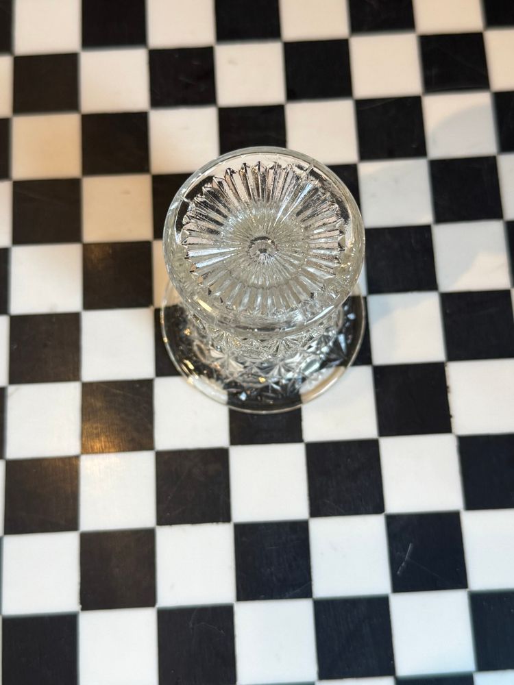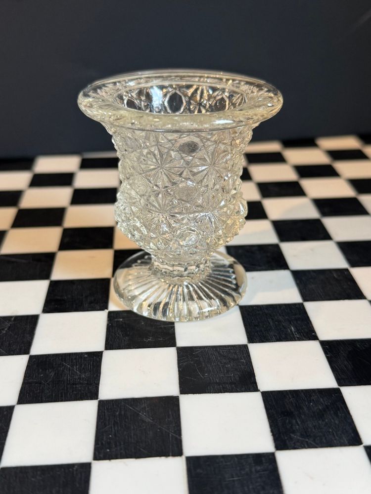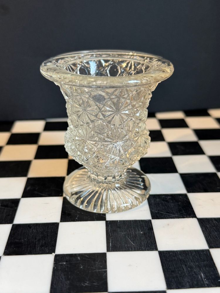 Mid century LE Smith hobstar and hexagon pattern glass toothpick holder. Measures 2.5”. In perfect vintage condition.