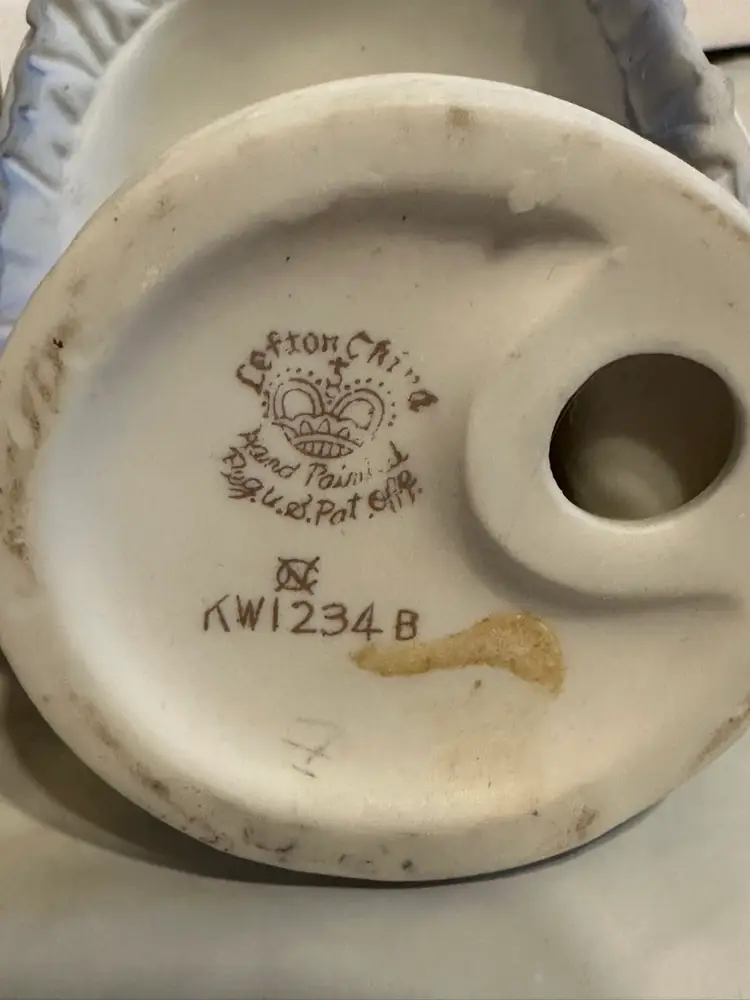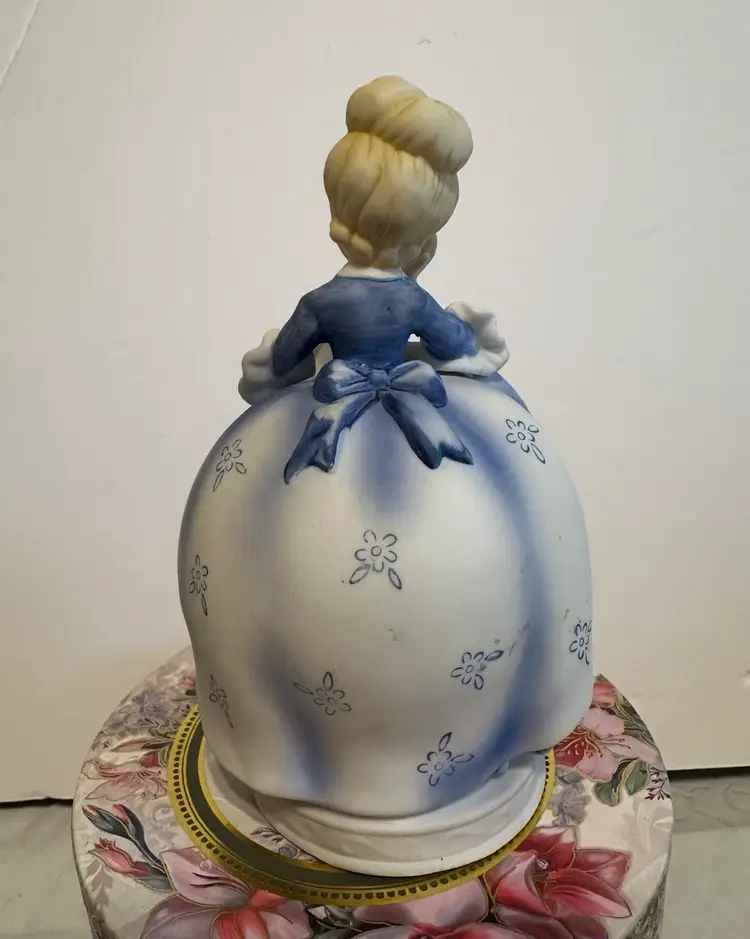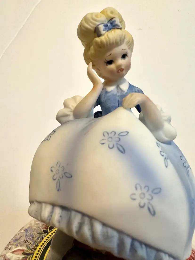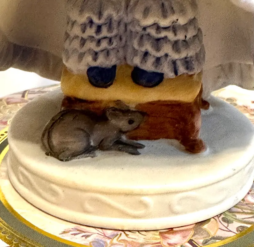 Sweet Lefton figurine “bloomer girl”. She is standing on a stool, there is a mouse near her feet. She is 5” tall. Excellent condition.