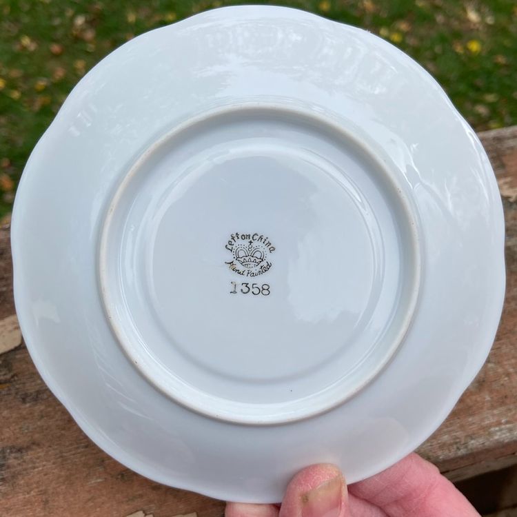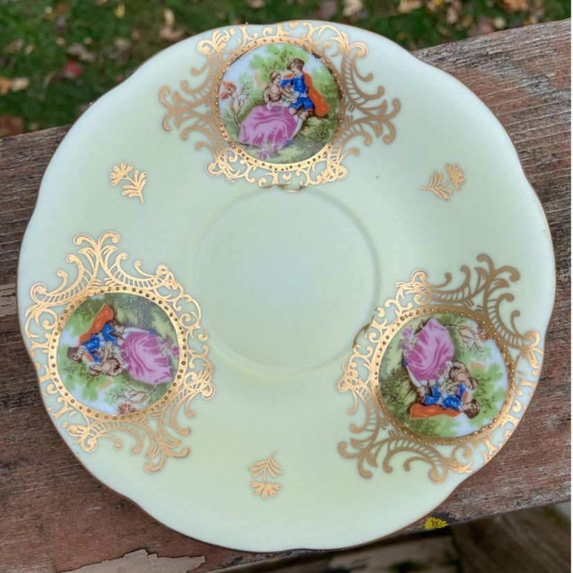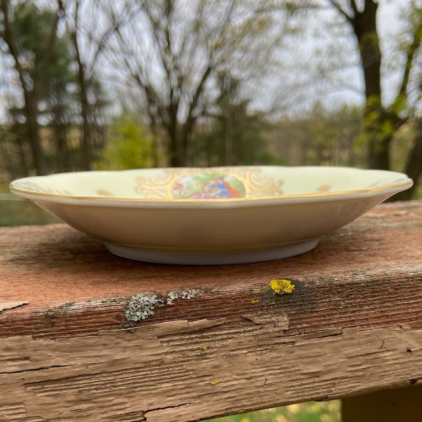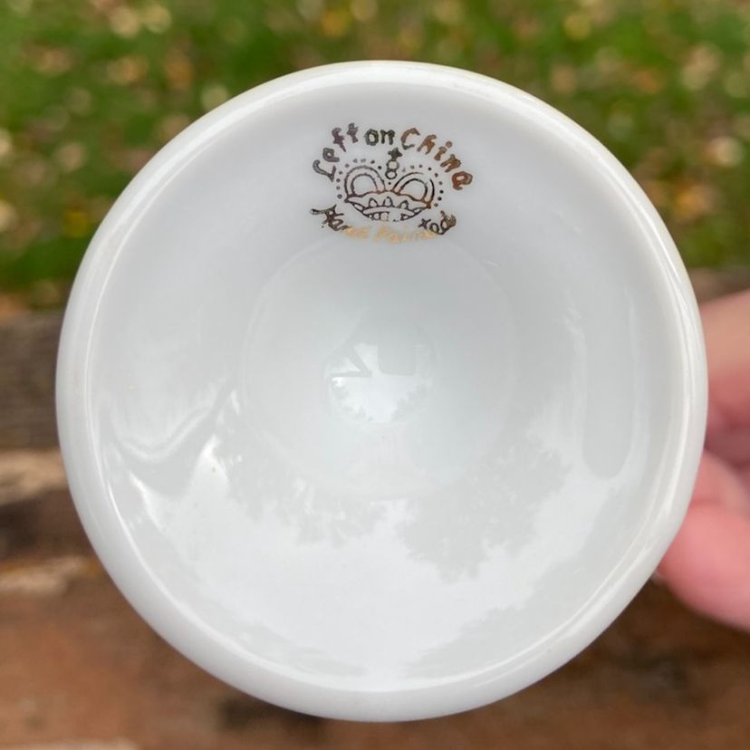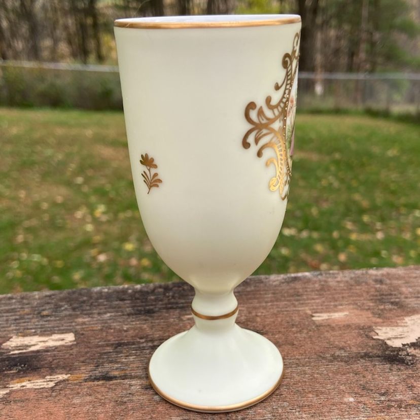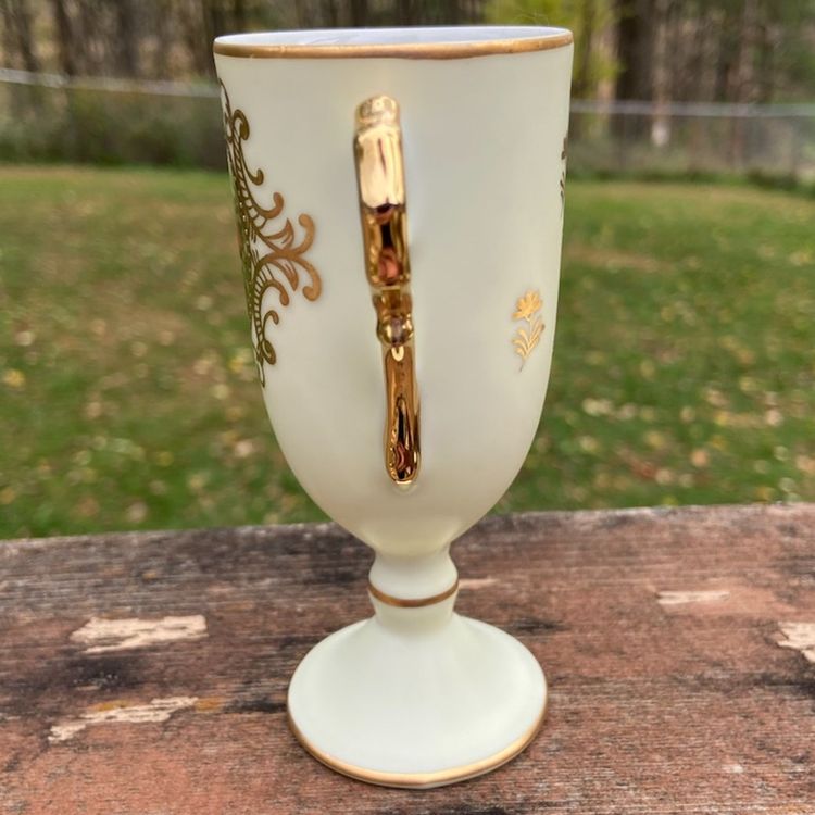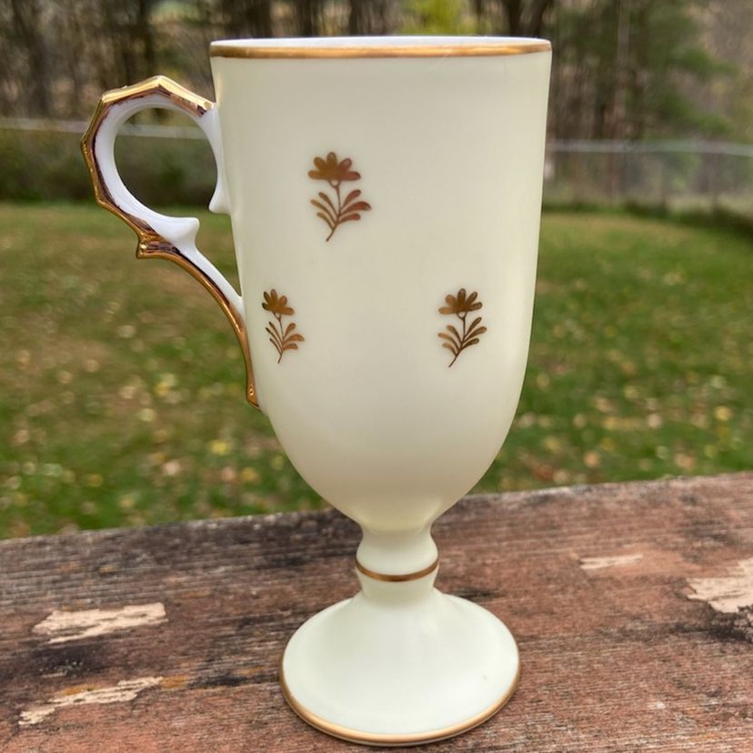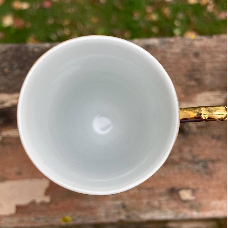 Approx: 4.75”h x 5.5”w - cup is 4.5”h x 3”w including handle . Pre-owned condition. No chips or cracks. No wear to gold gilt. See images as part of description.