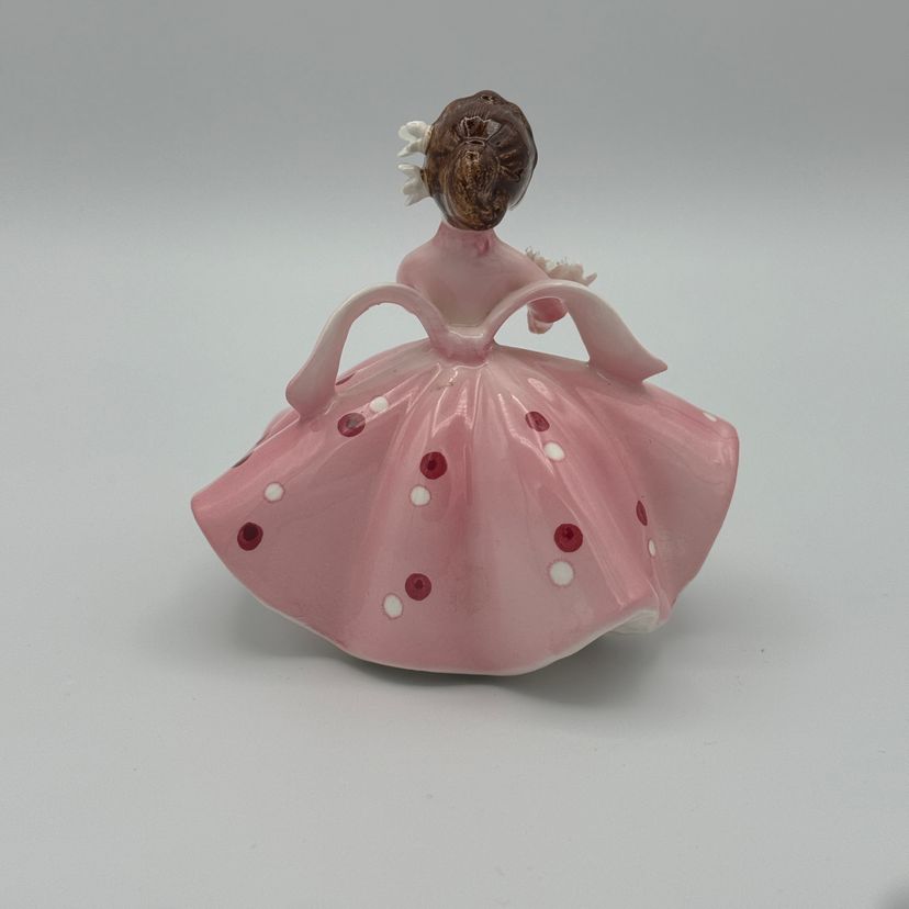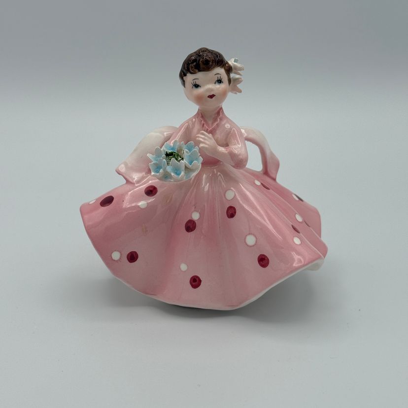 AS IS - Vintage Lefton Girl Porcelain Figurine - 1950's - Part of Big Bow Series. Features girl in a pink polka dot dress with a bow holding a bouquet of blue flowers. There is a repair on the hand that is holding the bouquet. The bouquet tends to hide the repair. Displays well.