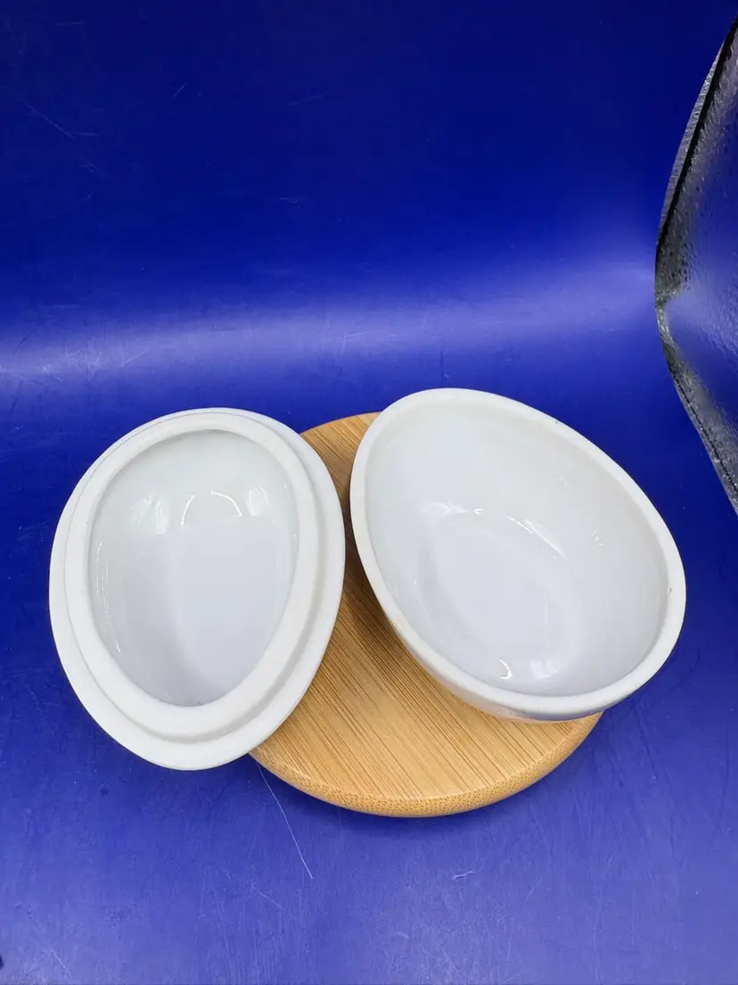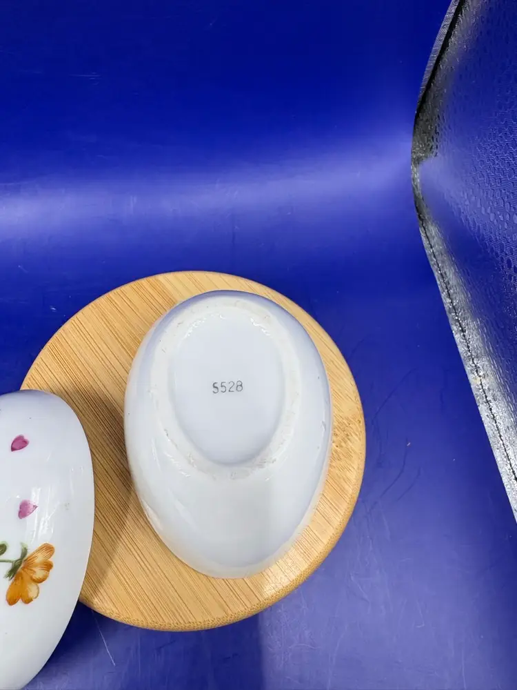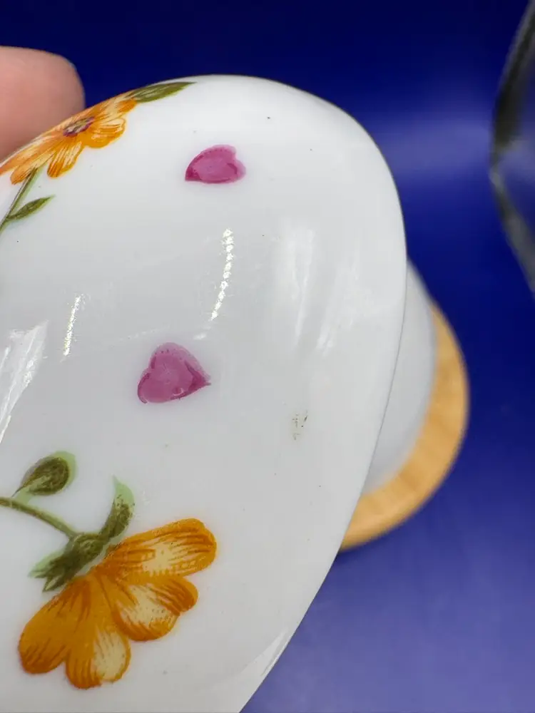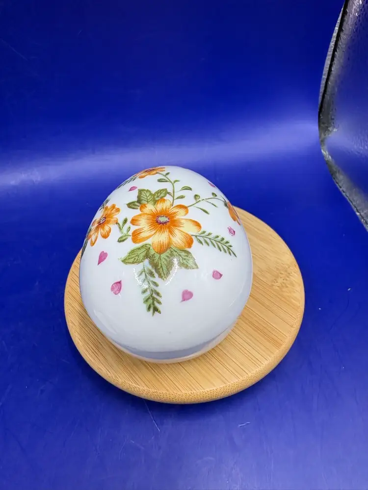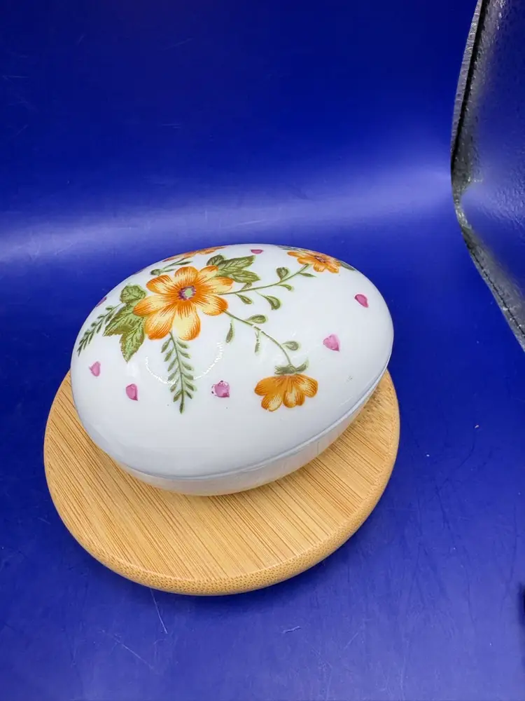 Lefton porcelain egg trinket box Design of orange flowers with pink petals Measures 3 1/2 inches long by 2 1/2 inches wide by 2 1/4 inches tall In excellent condition EXCEPT for small mark on side… see last photo